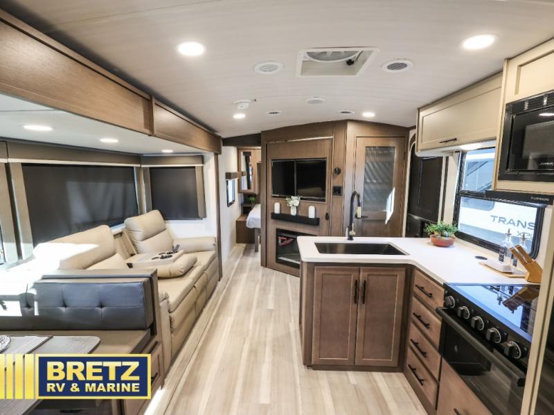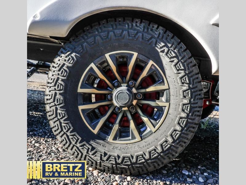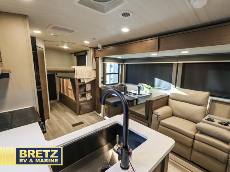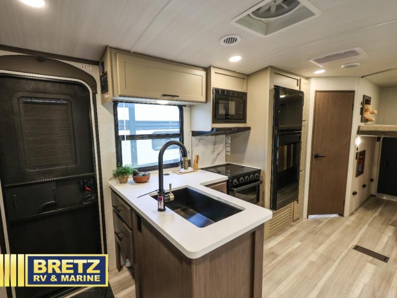 With dual entry doors in this travel trailer, you can enter in through the main living area or the full bath for convenience! Once inside, the sleeper sofa and booth dinette provide places to relax, eat, and play games, plus there is an entertainment center with hidden storage behind to keep movies organized. A full kitchen with a three burner cooktop and 12V refrigerator will allow you to cook and store food, or you can head outdoors to utilize the outdoor kitchen prep area. There is also drop-frame storage outside for fishing poles and hiking gear, and the 21' electric awning provides shade as you relax. When it's time to call it a night, the king bed in the front private bedroom is sure to bring comfort, while the little ones take the double-size bunks, and any other guests can sleep on the living room furniture!