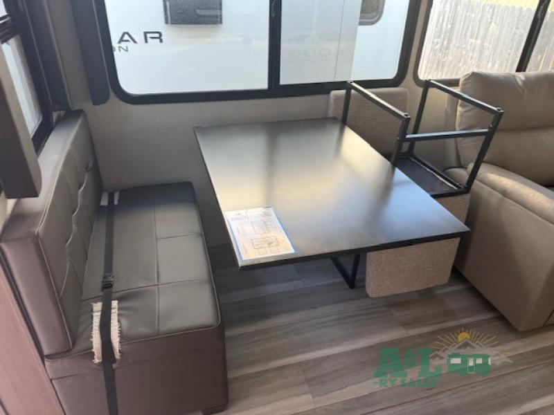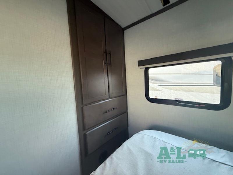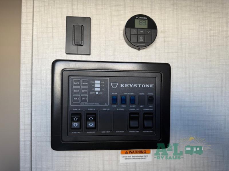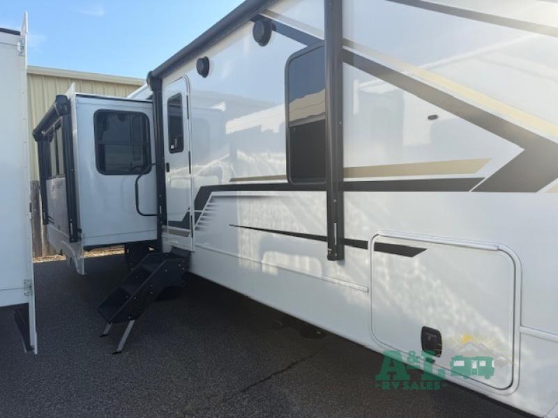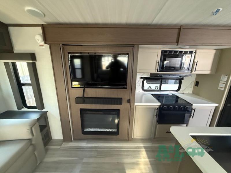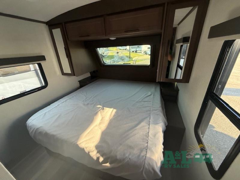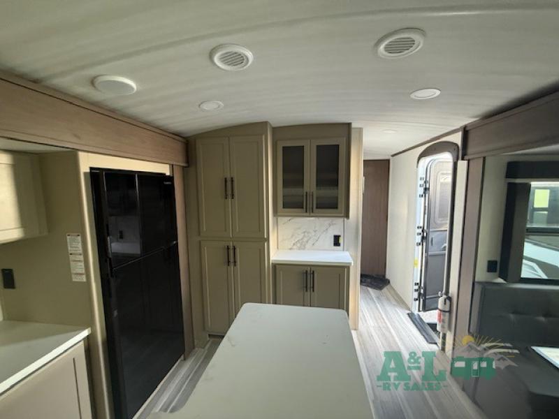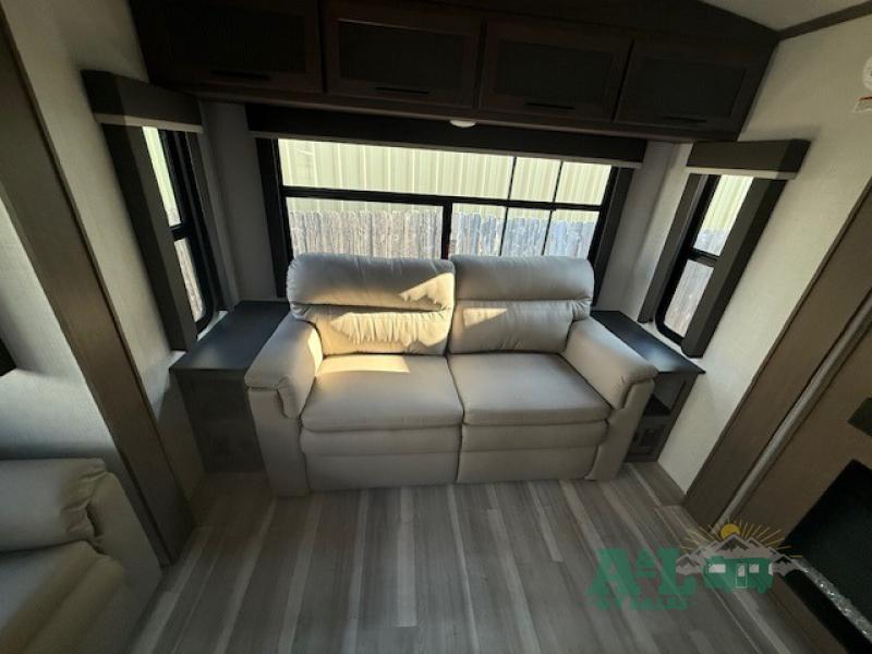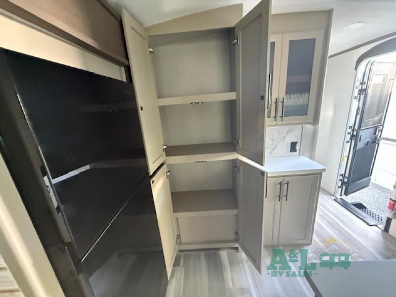 Trips spent in this travel trailer are sure to bring memories! The dual opposing slides in the combined kitchen and living area provide your crew with plenty of space to relax on the theater seating, dine at the dinette table, and prep meals with the kitchen island. There is also a tri-fold sleeper sofa here for guests and a pivoting entertainment center with a hidden pantry to keep snacks stocked. And a second pantry and hutch provides even more storage! You'll love having your own private bedroom up front, complete with a king bed, dual bedside drawers and nightstands and additional storage drawers to keep your space tidy. Outside, you'll find two power awnings, a 2" accessory hitch, and a drop frame pass-thru storage for fishing poles, hiking gear, and more!