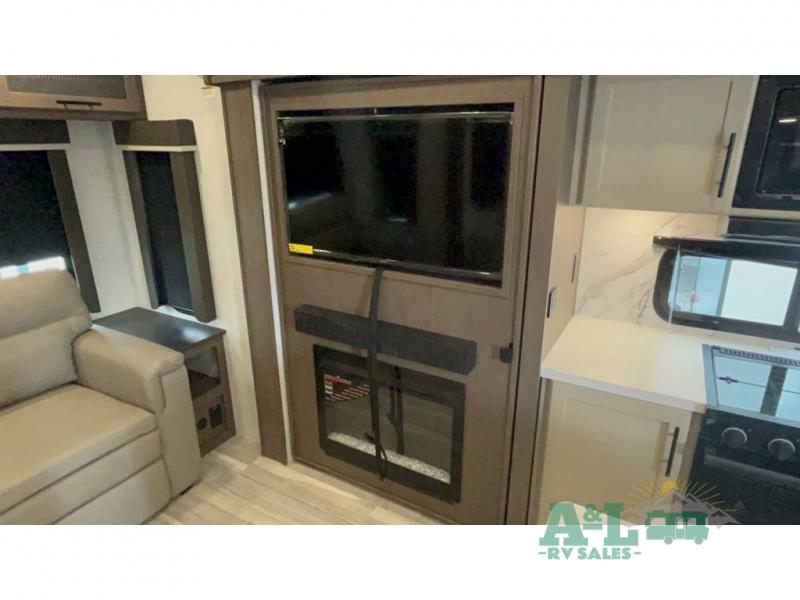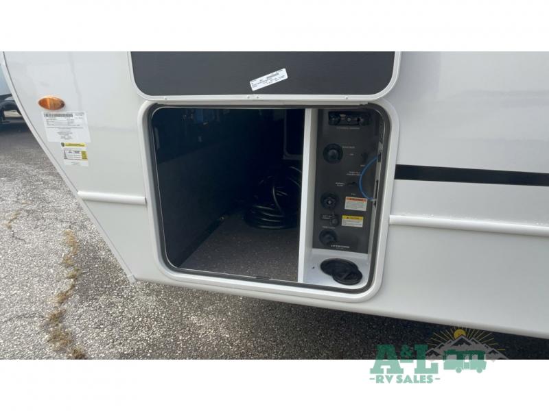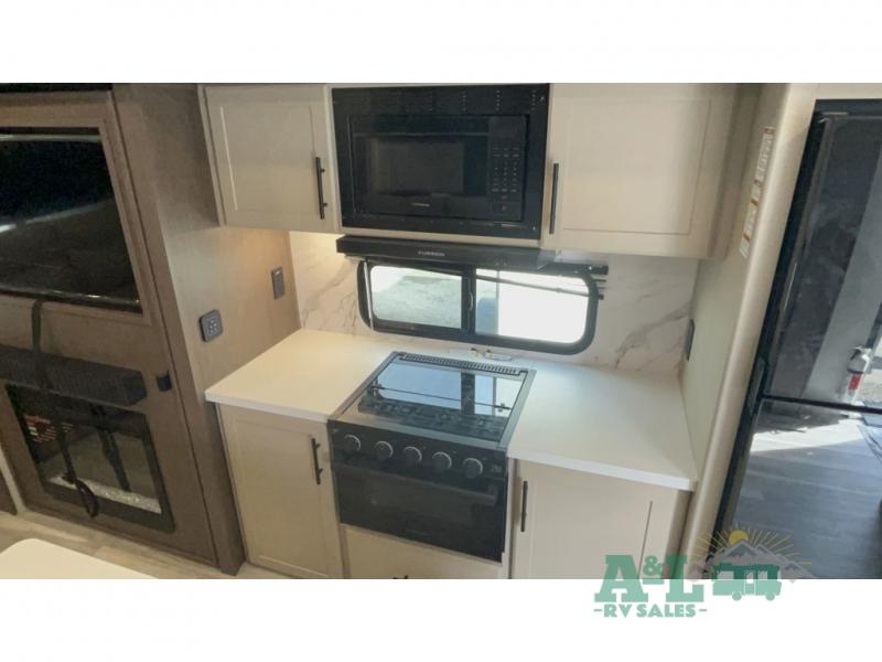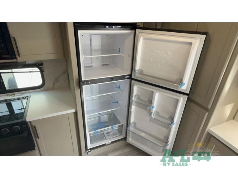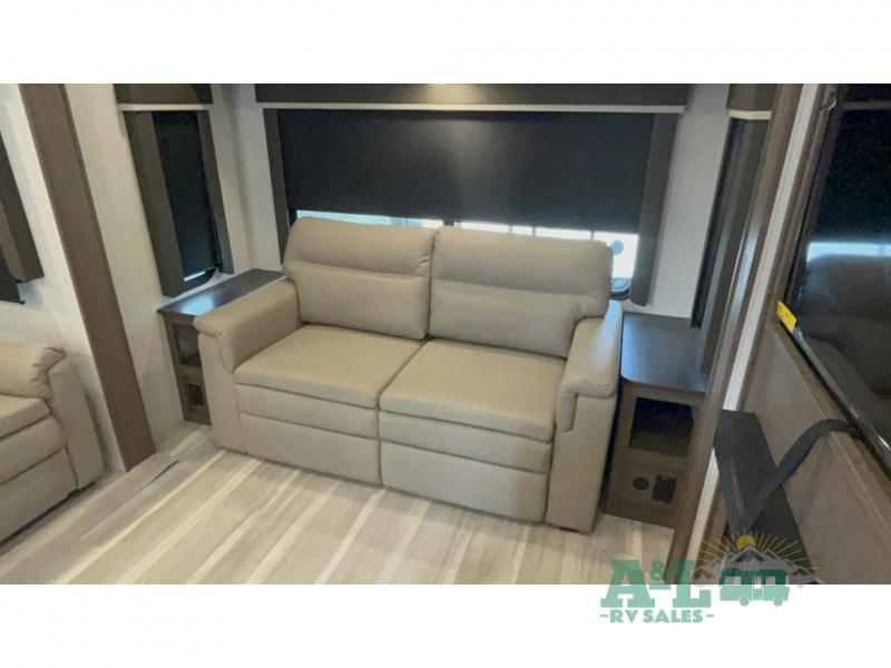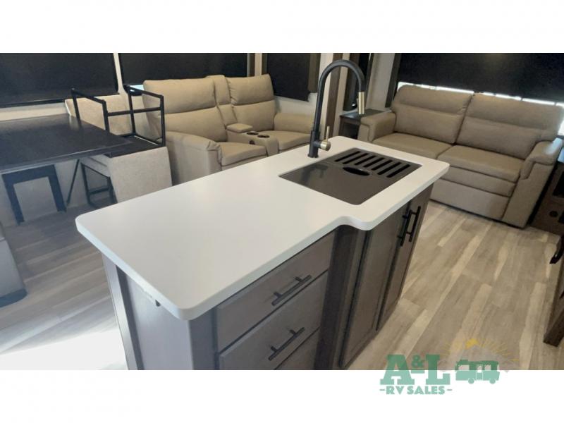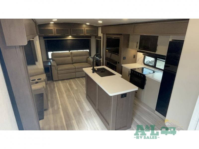 Trips spent in this travel trailer are sure to bring memories! The dual opposing slides in the combined kitchen and living area provide your crew with plenty of space to relax on the theater seating, dine at the dinette table, and prep meals with the kitchen island. There is also a tri-fold sleeper sofa here for guests and a pivoting entertainment center with a hidden pantry to keep snacks stocked. And a second pantry and hutch provides even more storage! You'll love having your own private bedroom up front, complete with a king bed, dual bedside drawers and nightstands and additional storage drawers to keep your space tidy. Outside, you'll find two power awnings, a 2" accessory hitch, and a drop frame pass-thru storage for fishing poles, hiking gear, and more!