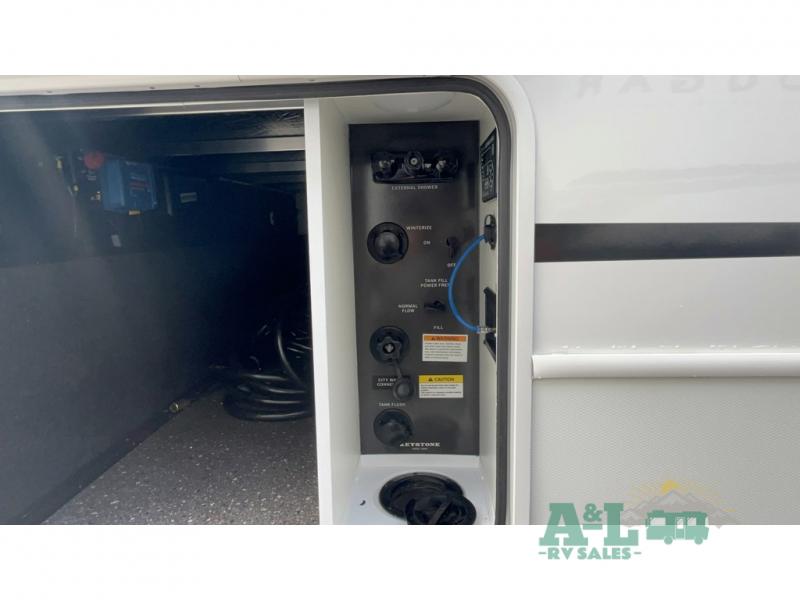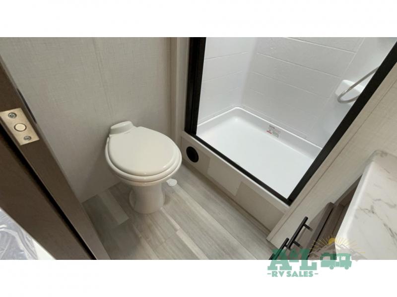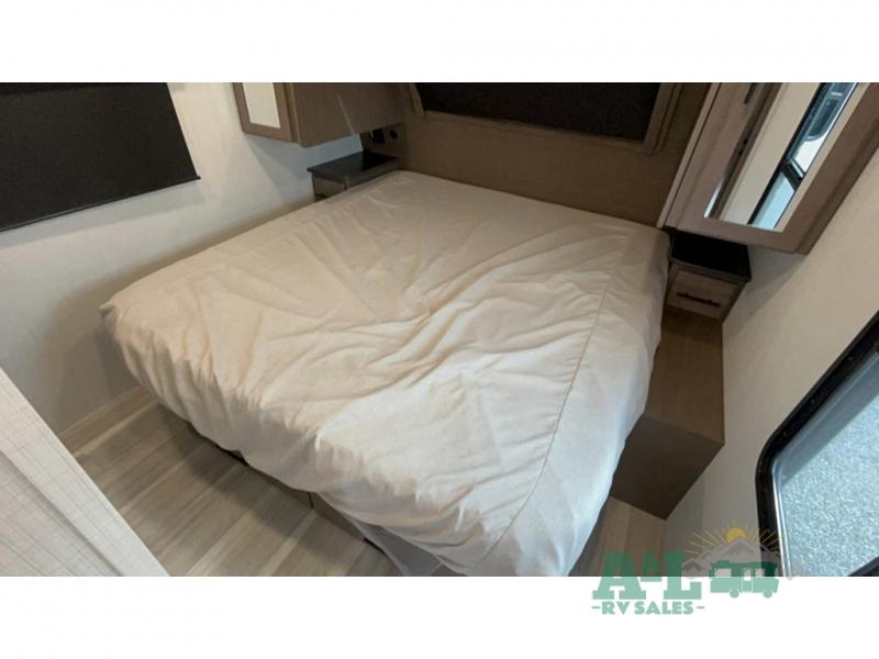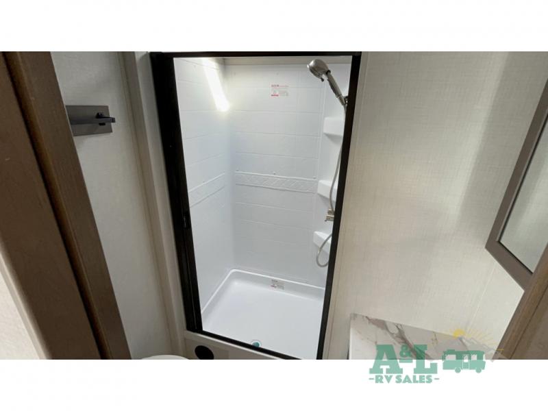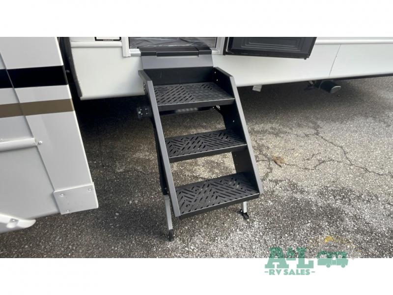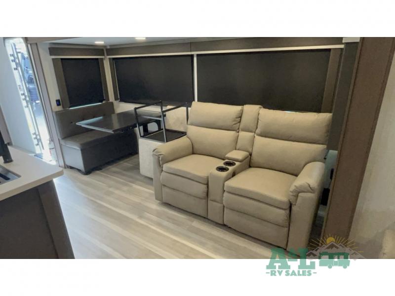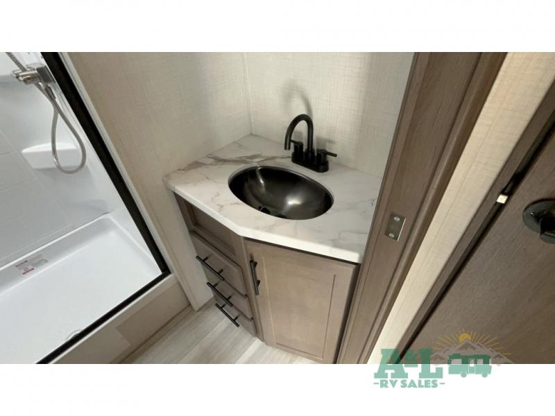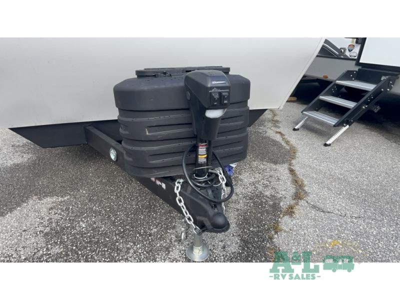 Trips spent in this travel trailer are sure to bring memories! The dual opposing slides in the combined kitchen and living area provide your crew with plenty of space to relax on the theater seating, dine at the dinette table, and prep meals with the kitchen island. There is also a tri-fold sleeper sofa here for guests and a pivoting entertainment center with a hidden pantry to keep snacks stocked. And a second pantry and hutch provides even more storage! You'll love having your own private bedroom up front, complete with a king bed, dual bedside drawers and nightstands and additional storage drawers to keep your space tidy. Outside, you'll find two power awnings, a 2" accessory hitch, and a drop frame pass-thru storage for fishing poles, hiking gear, and more!