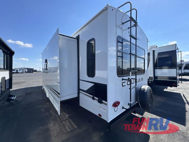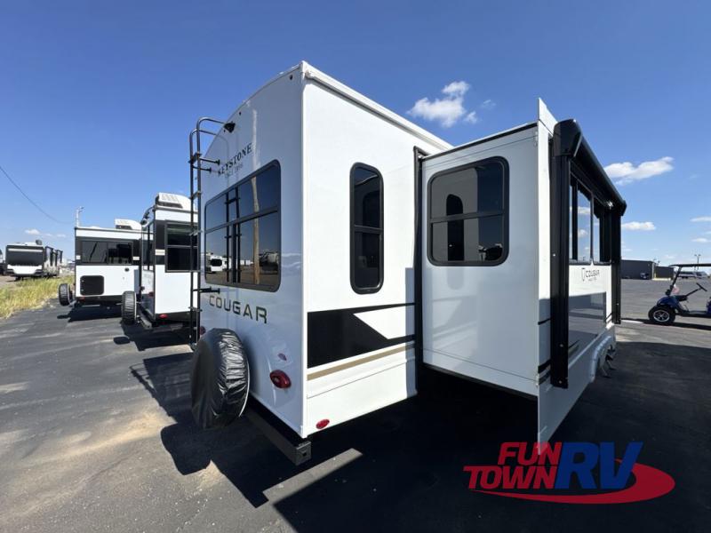 The Keystone Cougar Half-Ton fifth wheel and travel trailers are known as one of America's favorites for a reason! Some of those reasons are the exclusive features that come from Keystone, like the Winegard Air 360+ omni-directional rooftop antenna, the in-floor heating ducts, and the HyperCore composite wall construction with Vixen Fibrogloss high-gloss finish. The Cougar Half-Ton has a Climate Guard protection package with heat-deflecting white sidewalls, two roof attic vents, PEX plumbing and more to enjoy four season camping. Inside, you'll love the dimmable lighting, night roller shades throughout, shower skylight, and bedside USB outlets to keep your electronics charged.