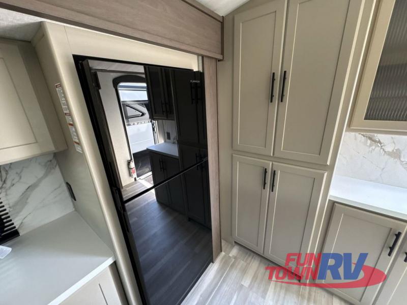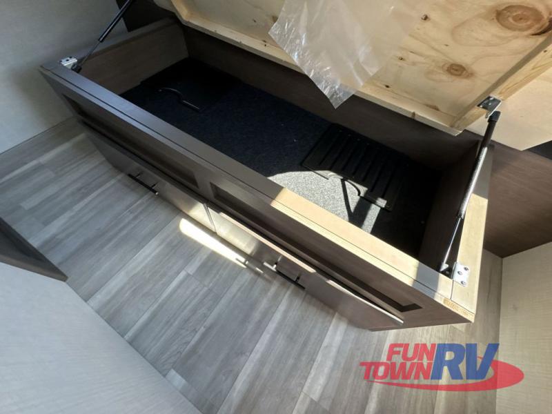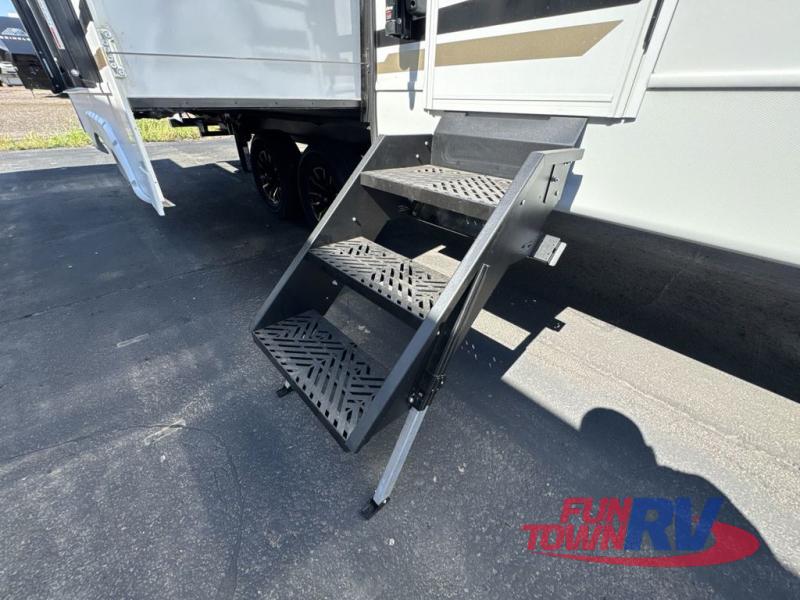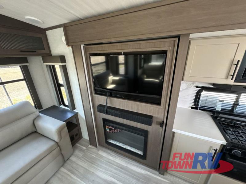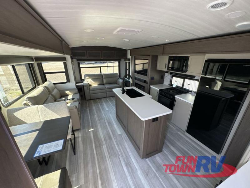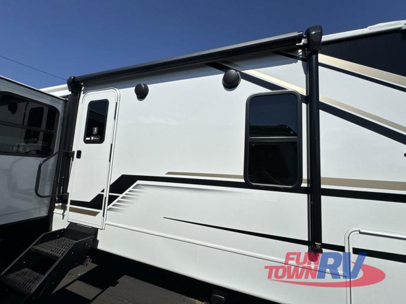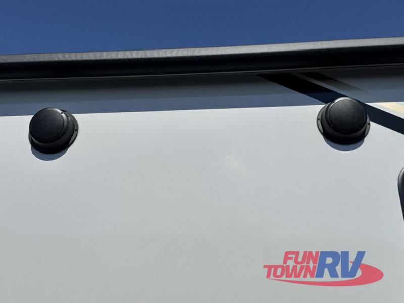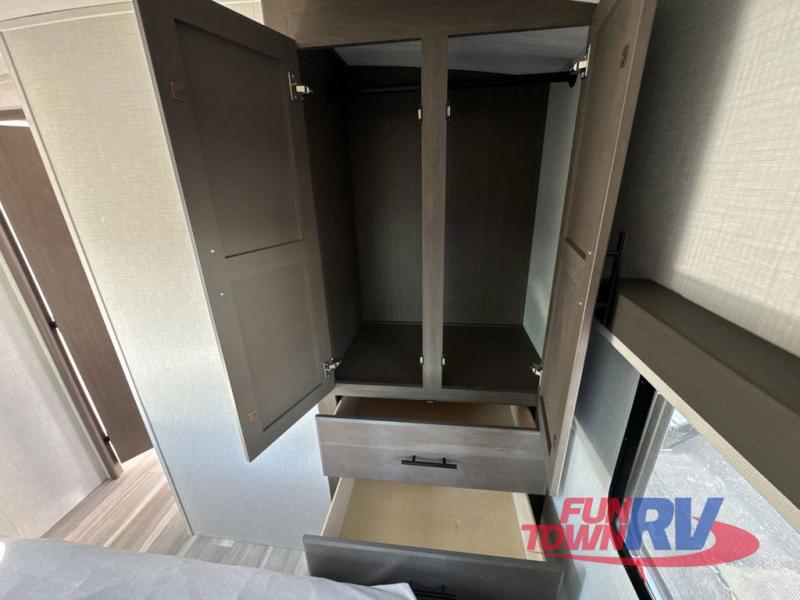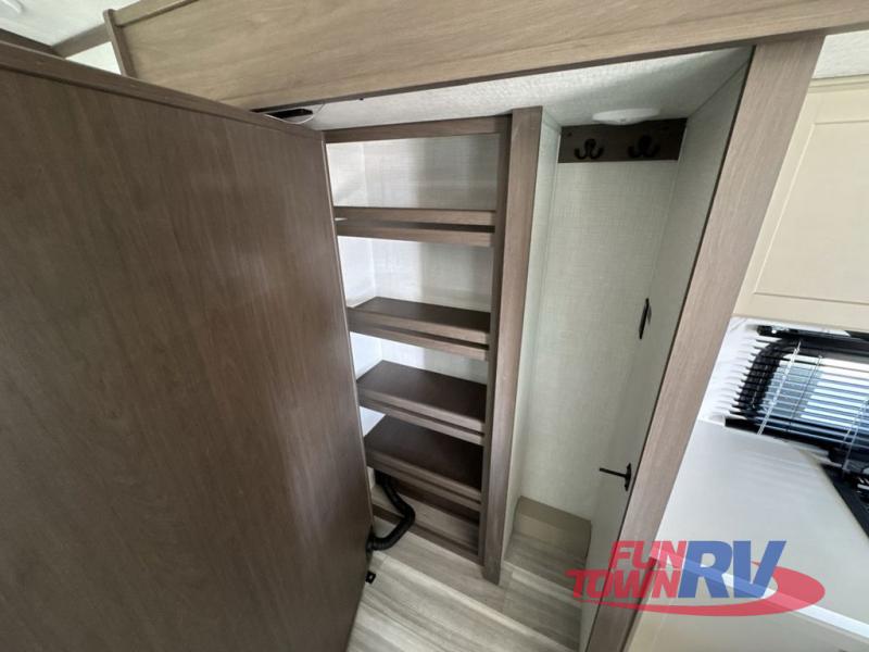 Trips spent in this travel trailer are sure to bring memories! The dual opposing slides in the combined kitchen and living area provide your crew with plenty of space to relax on the theater seating, dine at the dinette table, and prep meals with the kitchen island. There is also a tri-fold sleeper sofa here for guests and a pivoting entertainment center with a hidden pantry to keep snacks stocked. And a second pantry and hutch provides even more storage! You'll love having your own private bedroom up front, complete with a king bed, dual bedside drawers and nightstands and additional storage drawers to keep your space tidy. Outside, you'll find two power awnings, a 2" accessory hitch, and a drop frame pass-thru storage for fishing poles, hiking gear, and more!