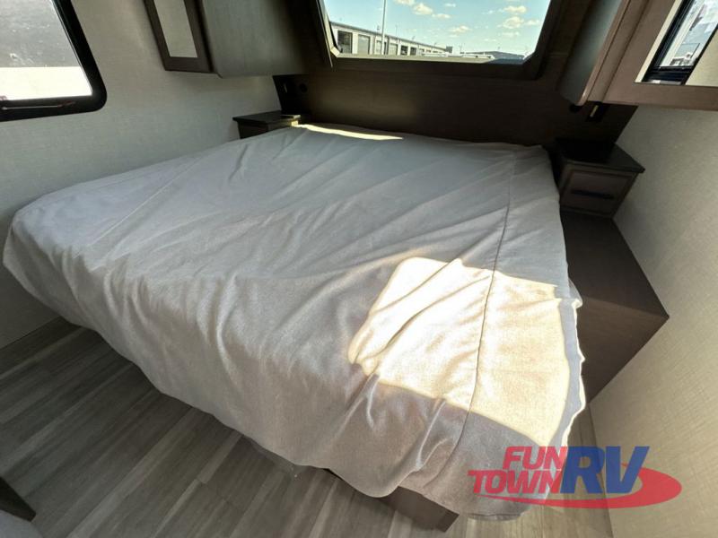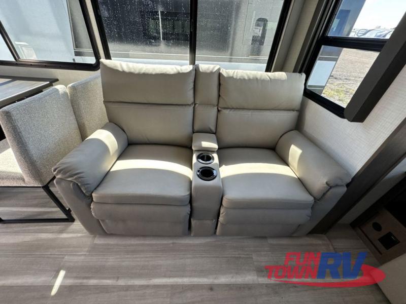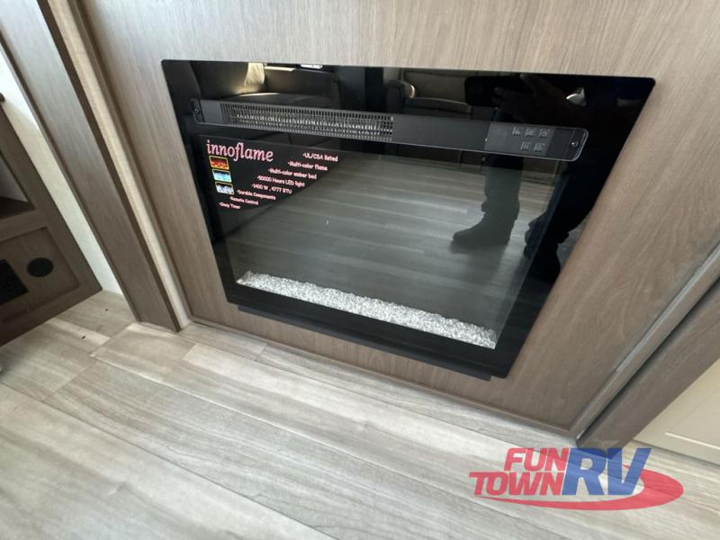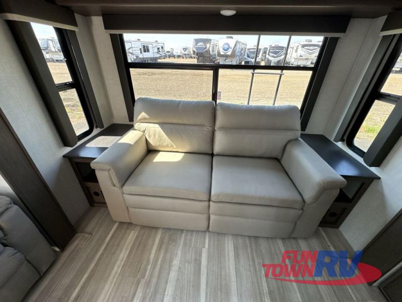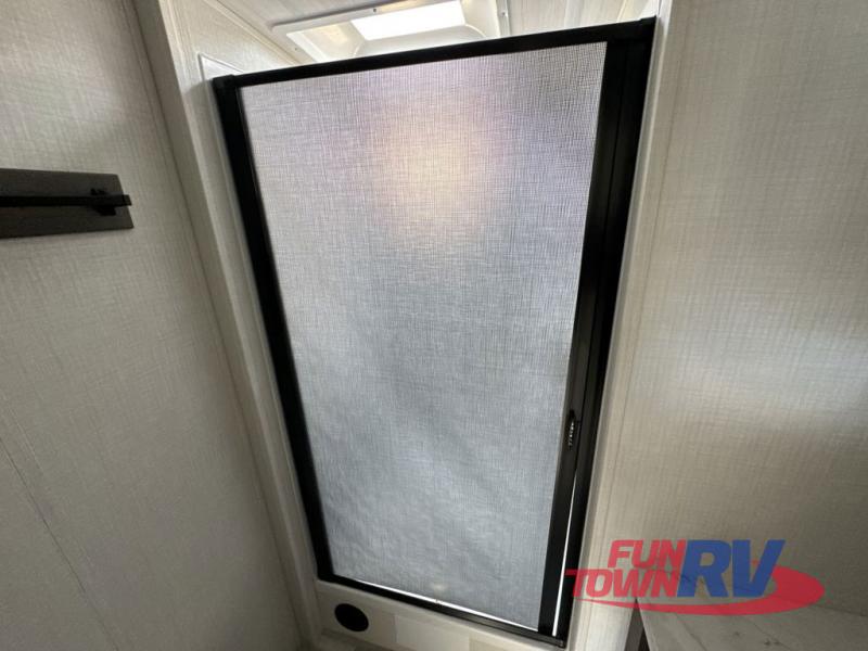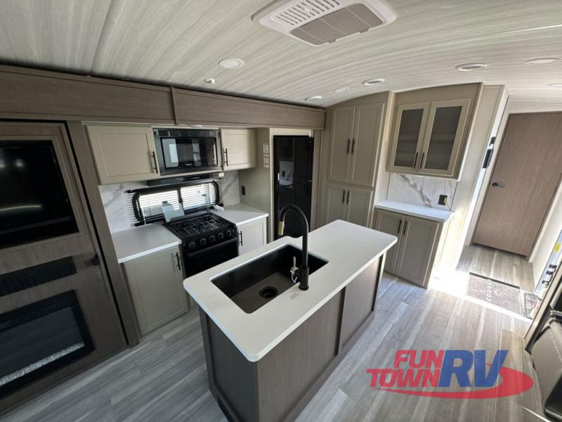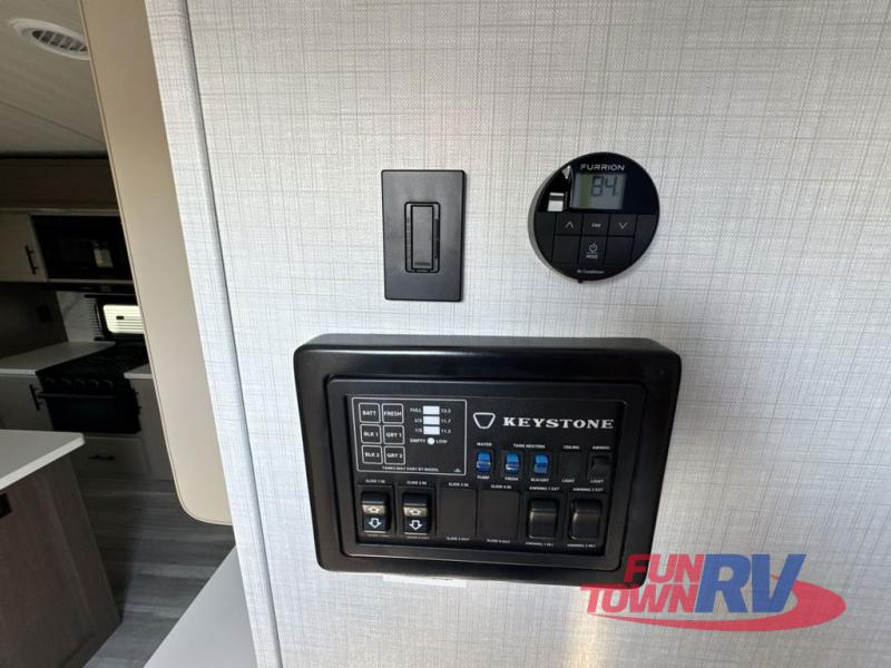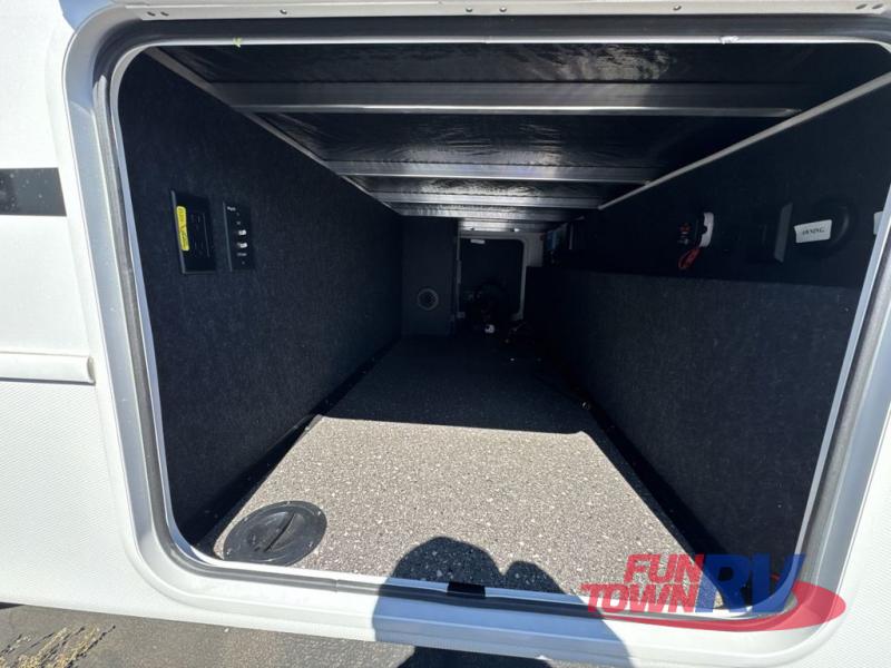 Trips spent in this travel trailer are sure to bring memories! The dual opposing slides in the combined kitchen and living area provide your crew with plenty of space to relax on the theater seating, dine at the dinette table, and prep meals with the kitchen island. There is also a tri-fold sleeper sofa here for guests and a pivoting entertainment center with a hidden pantry to keep snacks stocked. And a second pantry and hutch provides even more storage! You'll love having your own private bedroom up front, complete with a king bed, dual bedside drawers and nightstands and additional storage drawers to keep your space tidy. Outside, you'll find two power awnings, a 2" accessory hitch, and a drop frame pass-thru storage for fishing poles, hiking gear, and more!