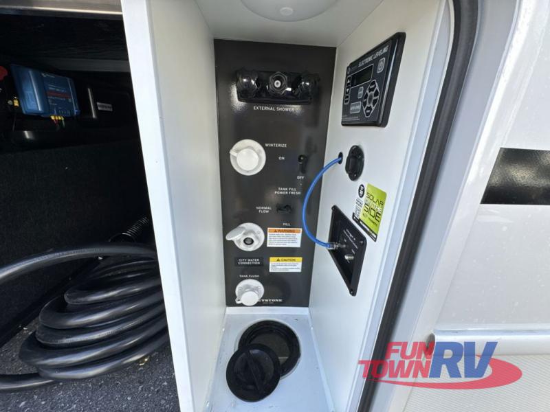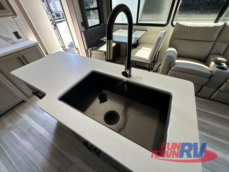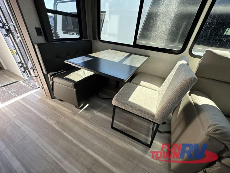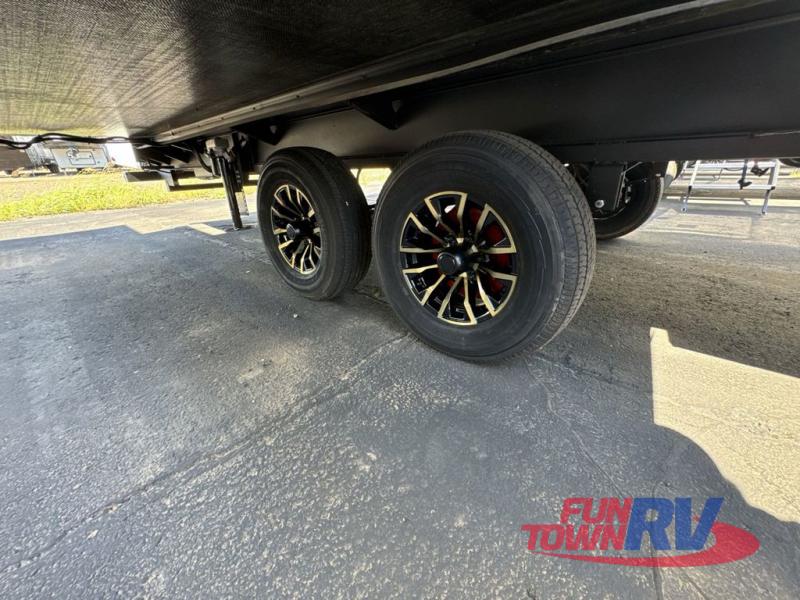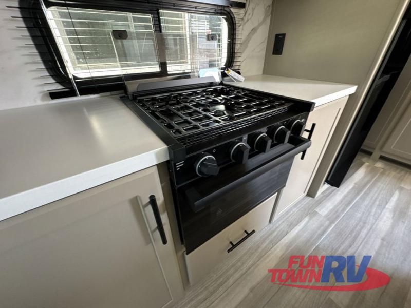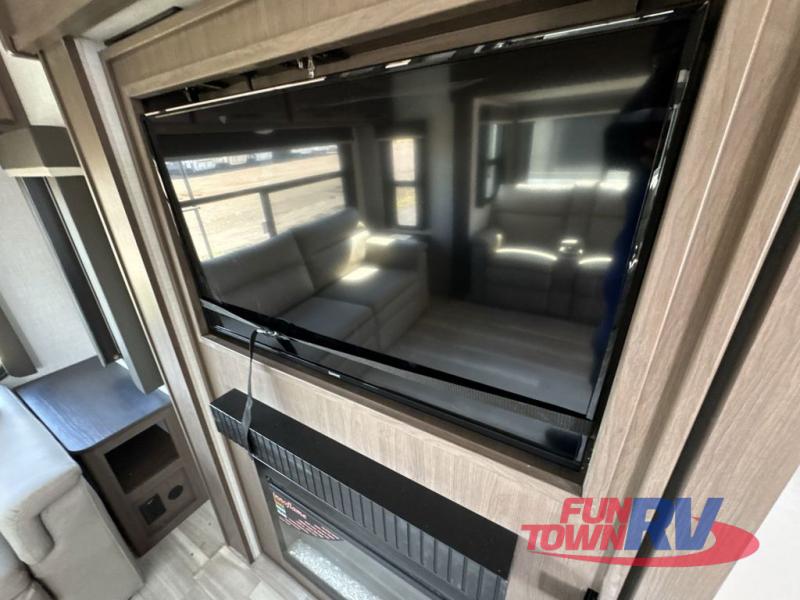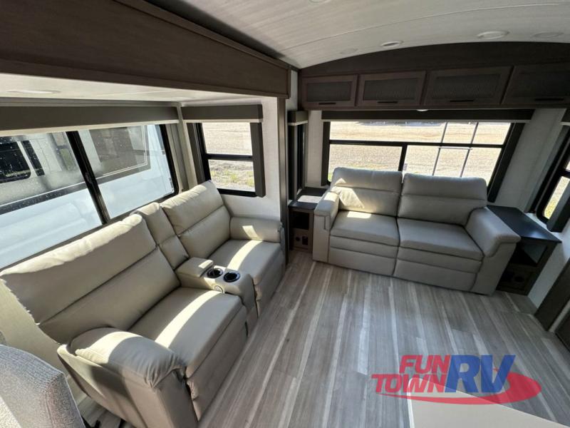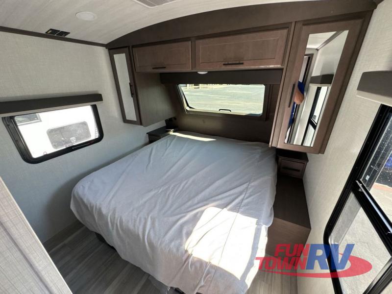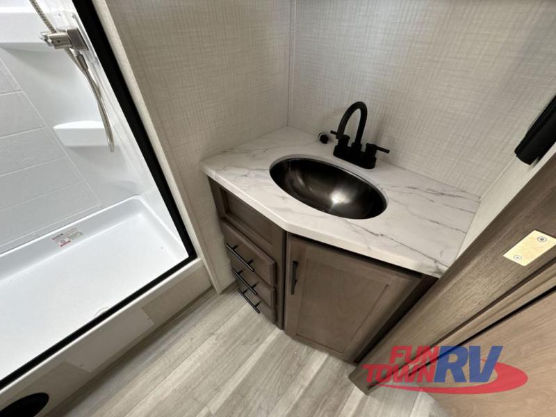 Trips spent in this travel trailer are sure to bring memories! The dual opposing slides in the combined kitchen and living area provide your crew with plenty of space to relax on the theater seating, dine at the dinette table, and prep meals with the kitchen island. There is also a tri-fold sleeper sofa here for guests and a pivoting entertainment center with a hidden pantry to keep snacks stocked. And a second pantry and hutch provides even more storage! You'll love having your own private bedroom up front, complete with a king bed, dual bedside drawers and nightstands and additional storage drawers to keep your space tidy. Outside, you'll find two power awnings, a 2" accessory hitch, and a drop frame pass-thru storage for fishing poles, hiking gear, and more!