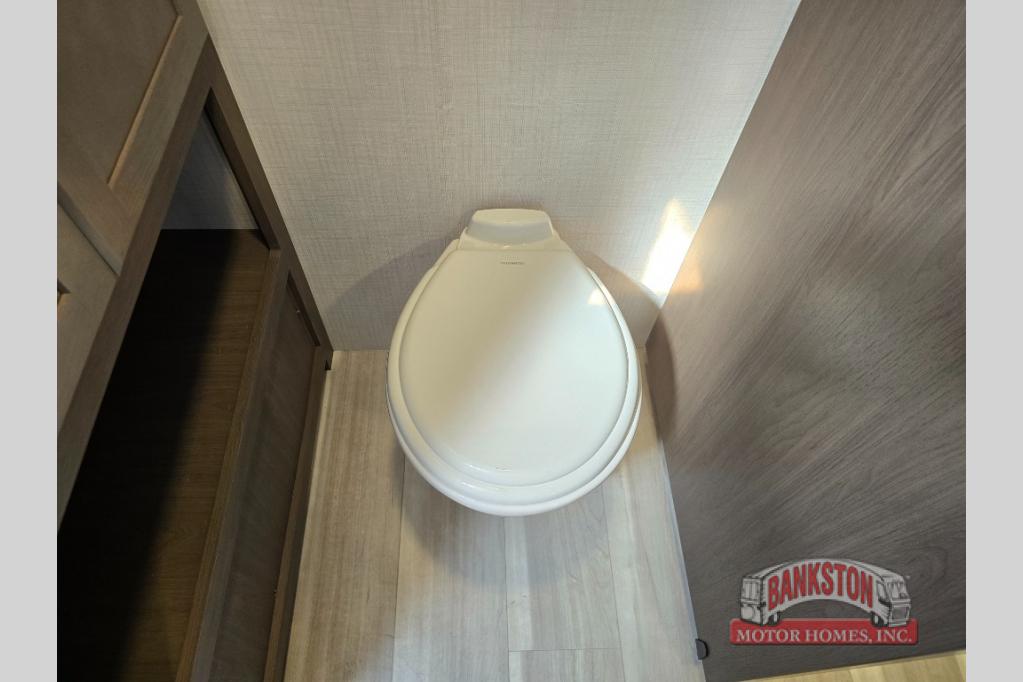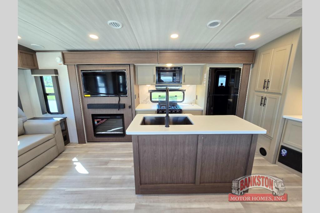 You'll definitely want to snatch up this Cougar Half-Ton travel trailer if you're a couple or small family that wants to live in comfort while at the campsite! There is a private bedroom at the front, and it has a queen bed slide or optional king bed, full-width wardrobe, and a dresser to keep your clothes tidy. Right next to the bedroom is a full bathroom that comes with a linen closet with washer and dryer prep. The main living area is what truly gives you the royal treatment because it has theater seating directly across from the entertainment center and fireplace, a kitchen island that you can gather around when it's snack time, a booth dinette that will serve as a bed or a dinner table, and a 68" tri-fold sleeper sofa with end tables for a cold drink. The kitchen also has a pantry, so you can keep your trailer stocked with goodies throughout the whole trip.