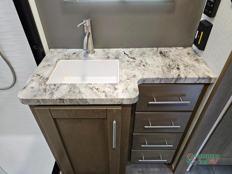 The Fuzion Impact Edition 416 delivers the perfect balance of rugged toy-hauling capability and residential comfort. With a massive 15' separate garage, a bath and a half, and versatile sleeping for up to eight, this fifth wheel toy hauler is ready for your most exciting adventures—whether it’s off-road weekends or extended trips.
