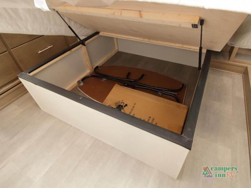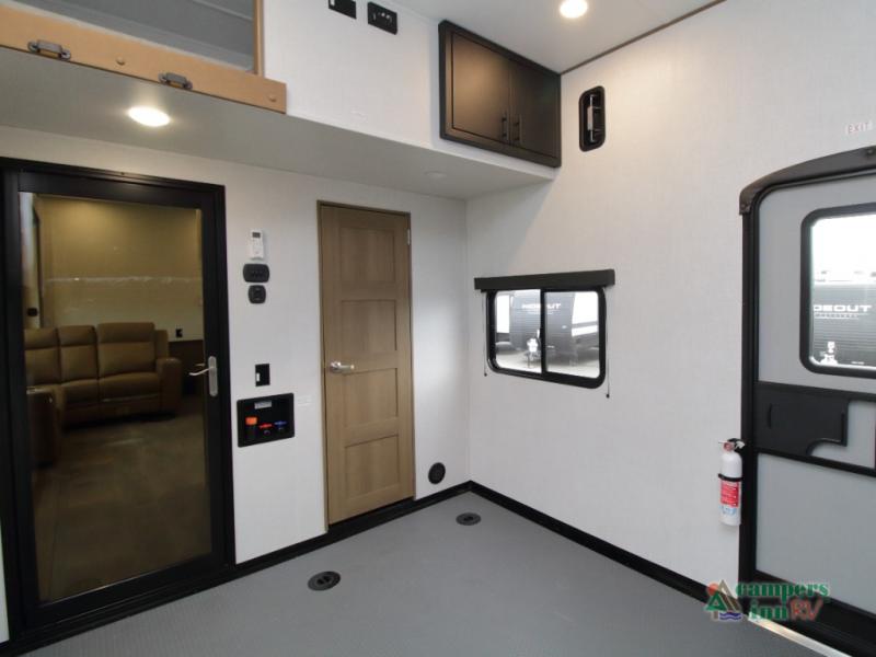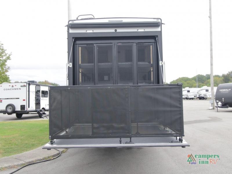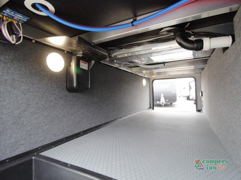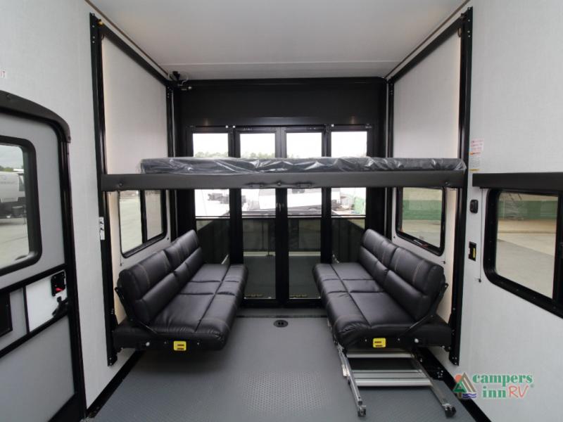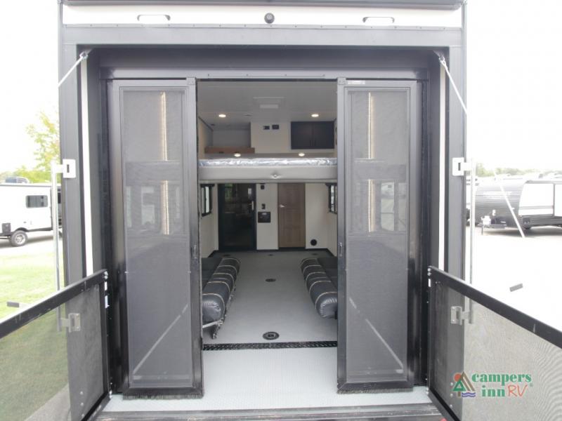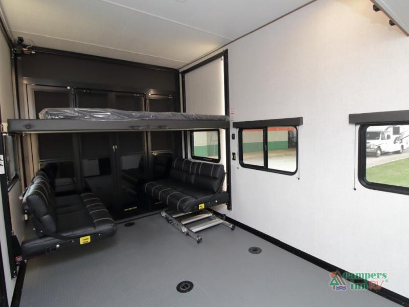 Spacious 15' Separate Garage – Dual opposing sofas with a top queen bed, 8' garage door, and a convenient half bath.