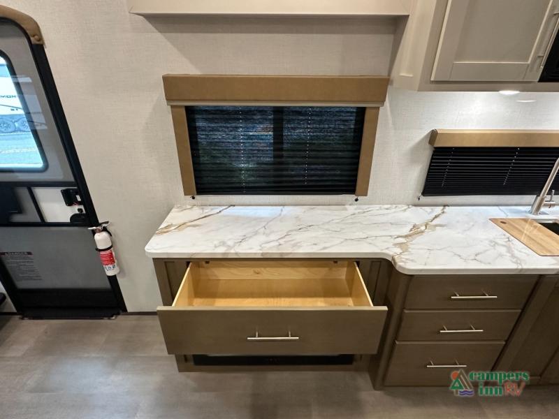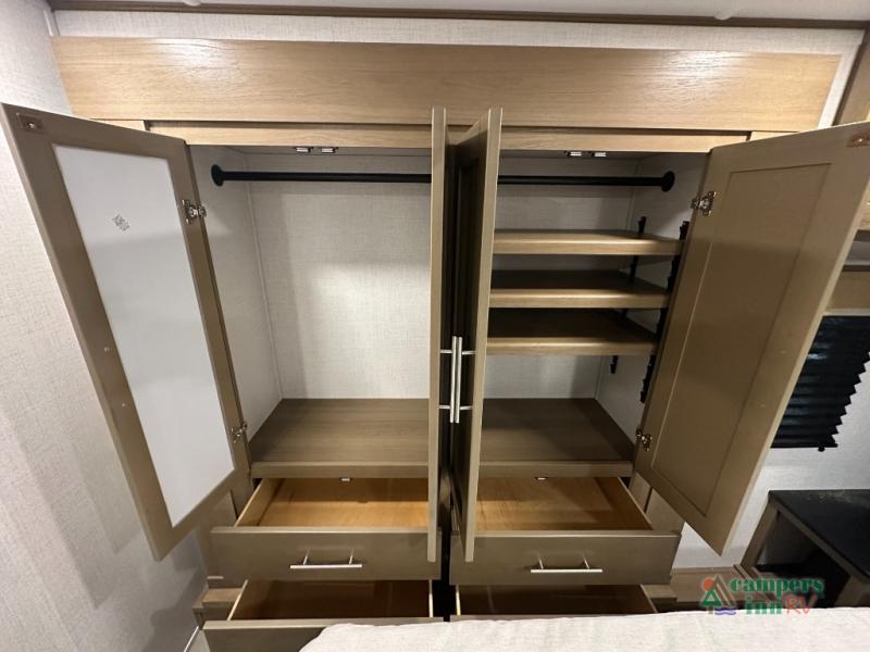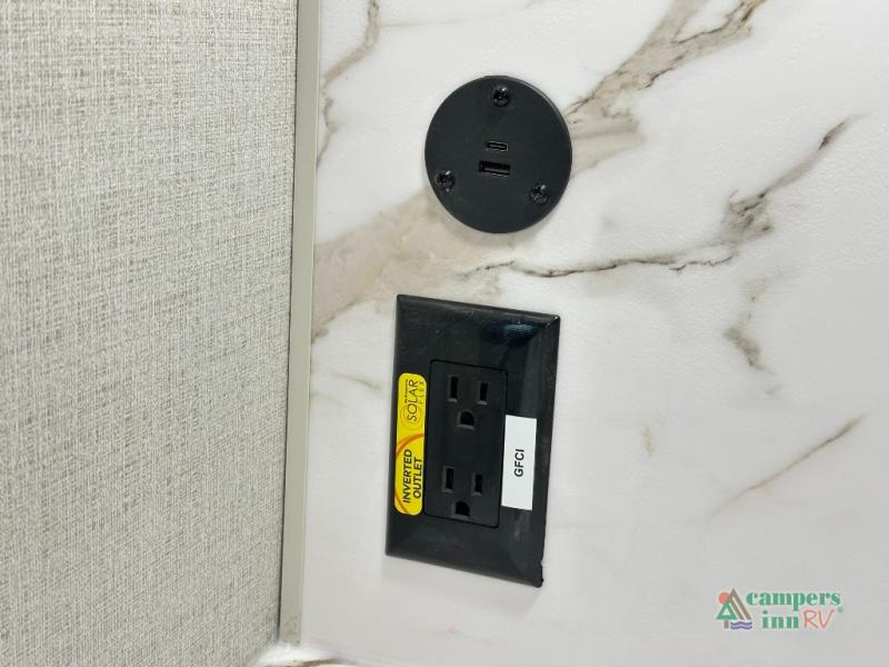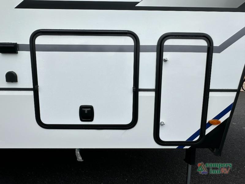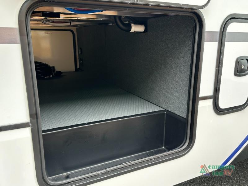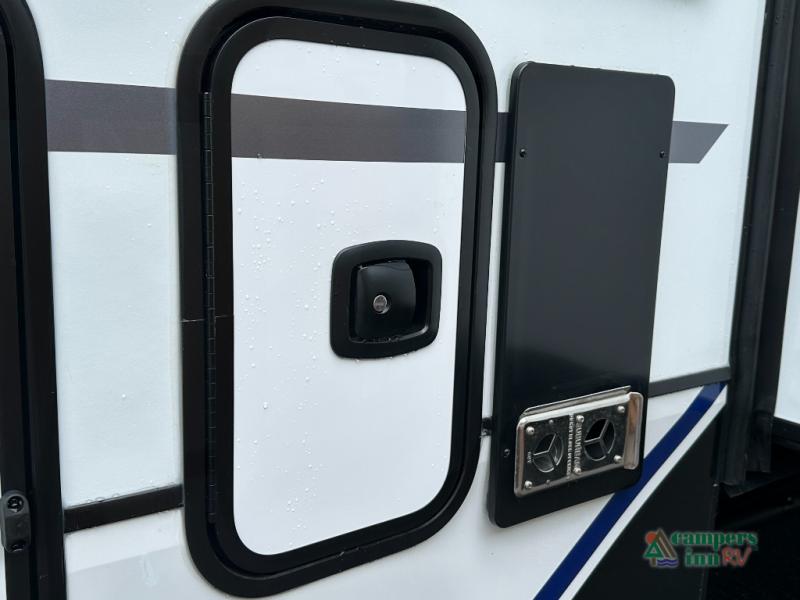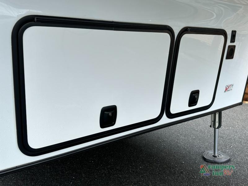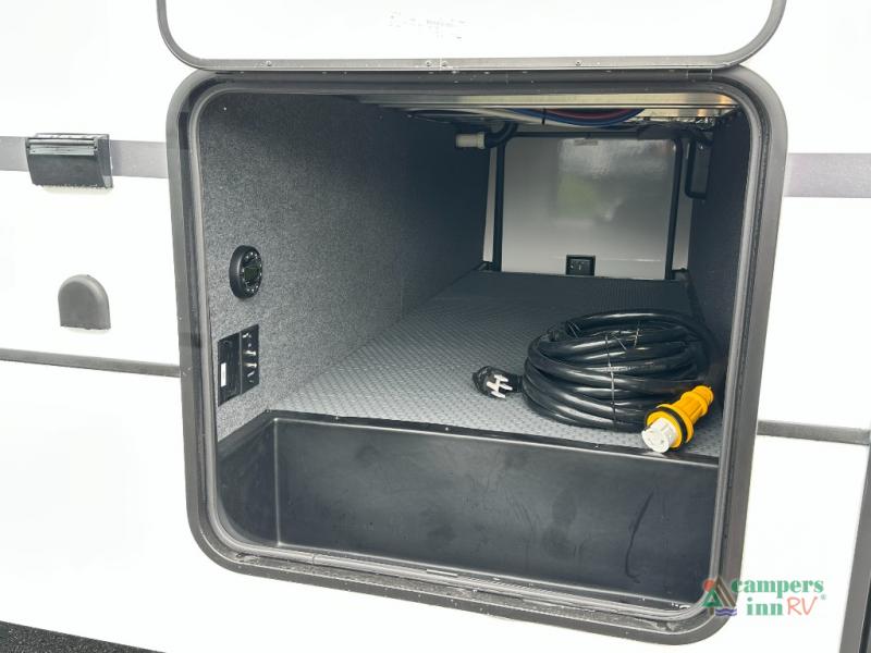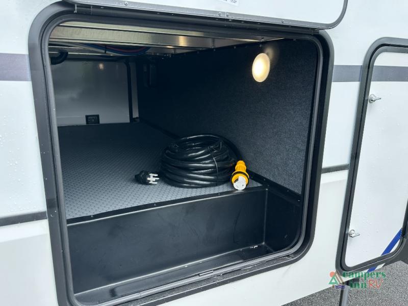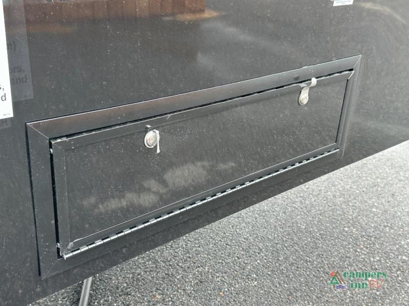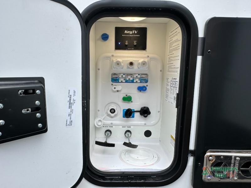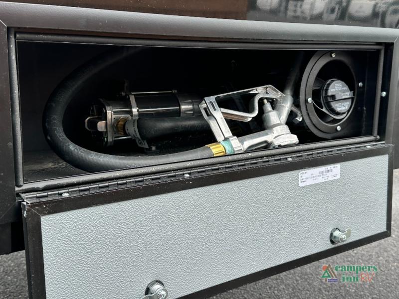 • Hard-wired tie-downs, fuel station (30gal with pump), exterior shower, and a power awning with auto-dump and LED lighting
