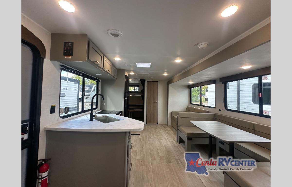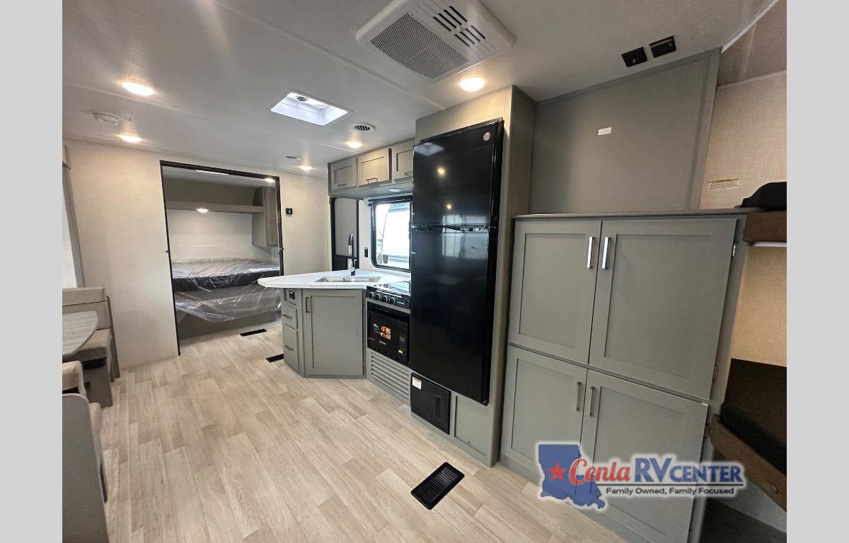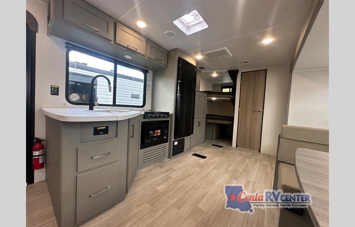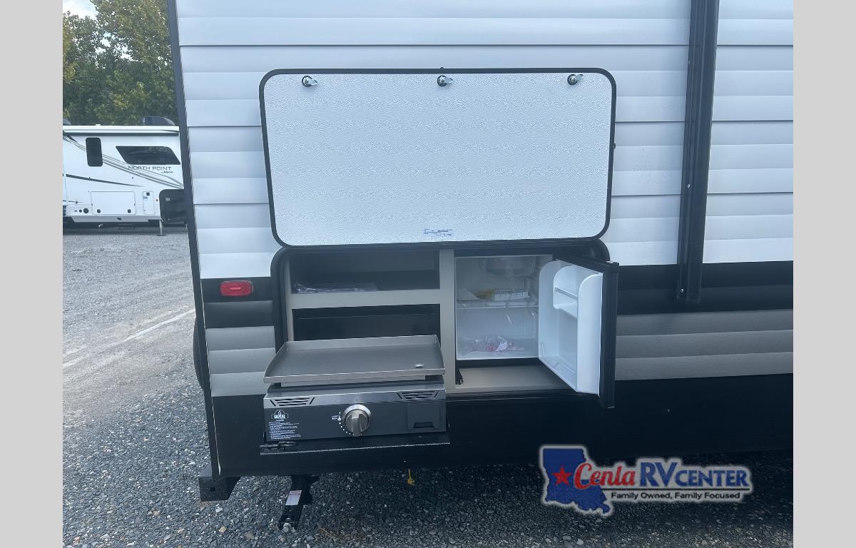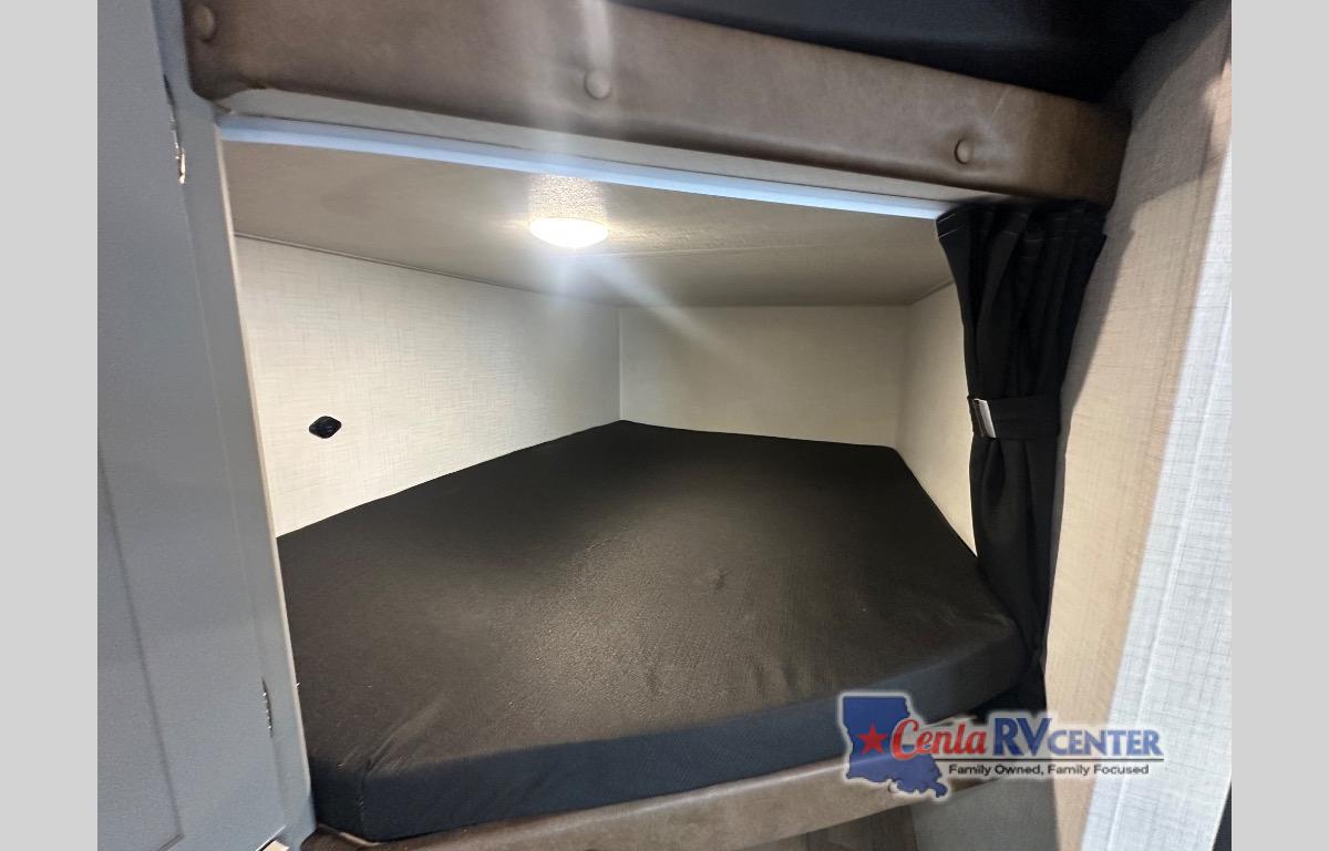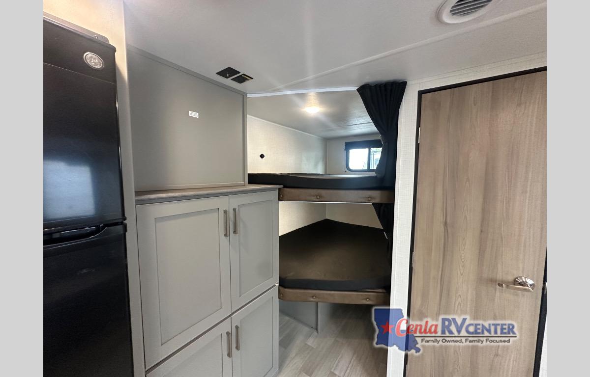 A large slide, front private bedroom, and double-size bunks make this Hideout Sport Double Axle the ultimate travel trailer! You will enjoy a walk-around queen bed in the bedroom plus dual closets and nightstands for your things. The full bath is towards the back and beside the bunks for easy nighttime use, and there is a pass-through storage outside for your gear. Head to the kitchen to prepare lunch on the cooktop, then dine at the U-shaped dinette and sofa within the large slide. If the weather is nice, you might just want to cook outdoors on the outside kitchen under the 18' power awning!