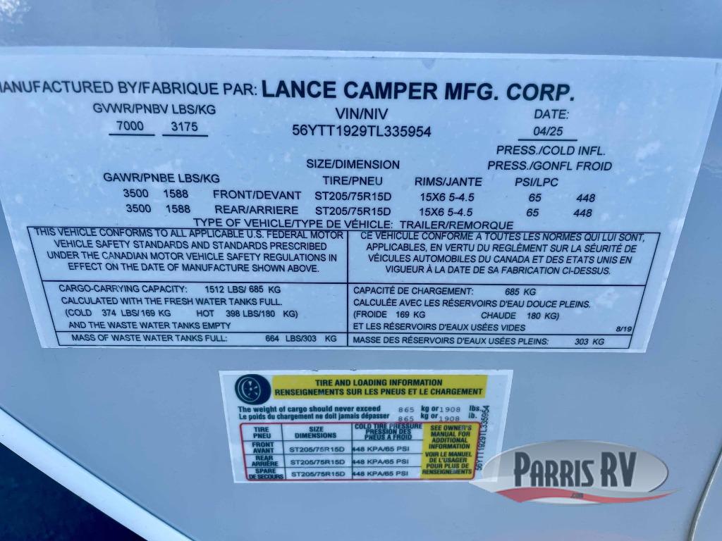 The line-up for the Lance travel trailers centers around three gorgeous interior décor options, a lengthy list of product enhancements, and simplification of ordering with many optional features being made standard. Some of the stand out features you'll want to take note of are the Keyed-Alike storage compartment doors for all of your camping essentials, the dual layer Azdel composite to prevent your unit from rotting, and the durable one-piece roof. The interior includes Euro overhead cabinetry designs, a pop-up electrical/charging tower, and a Shower Miser water system. You'll also find an innerspring mattress with a bedspread, a dual pane shower skylight, USB charging ports to keep your electronics at 100%, plus a JBL AM/FM stereo and JBL interior/exterior Bluetooth speakers to keep the party going!