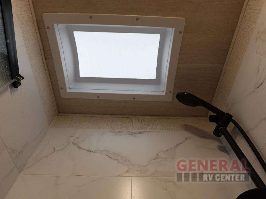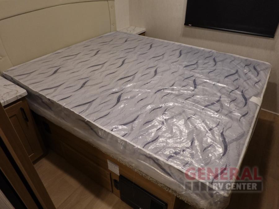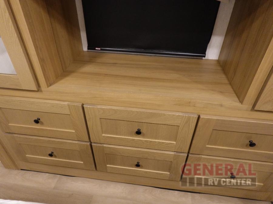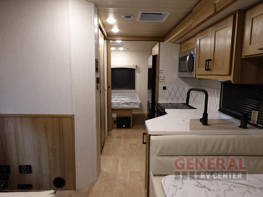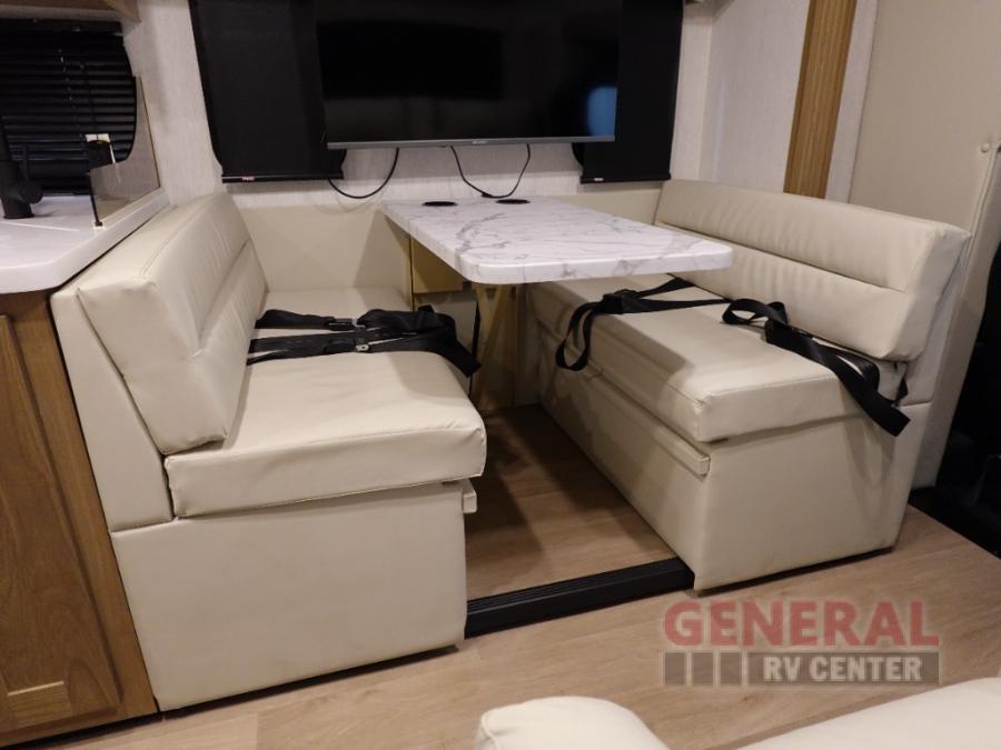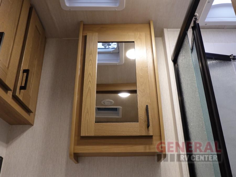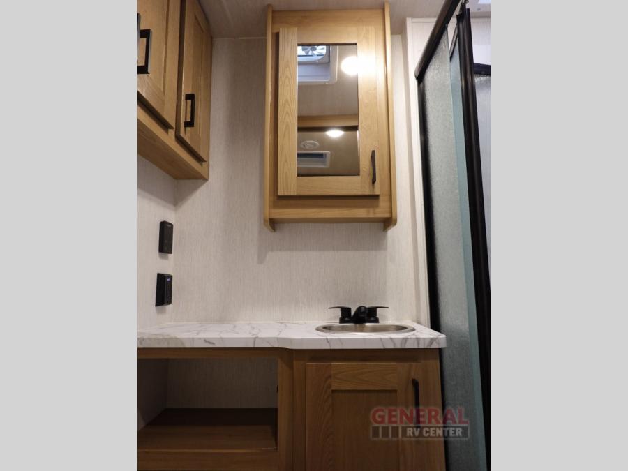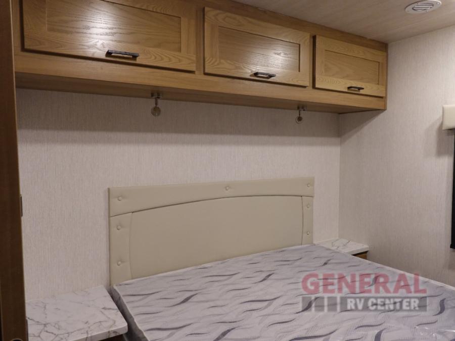 The full-wall slide on this coach is what will make it feel more open, just like at home! You can prepare meals on the three burner cooktop, or in the stainless steel microwave. There is a booth dinette to dine at and a 10 cu. ft. 12V refrigerator to store your leftovers. A sofa will also provide seating and sleeping space, along with the bunk over cab! This model includes a full bath with a shower skylight, electric roof vent, and a large medicine cabinet to store your things. When you're ready for bed, head to the rear bedroom for a great night's rest on the bed and there is bedroom wardrobe to keep your items tidy!
