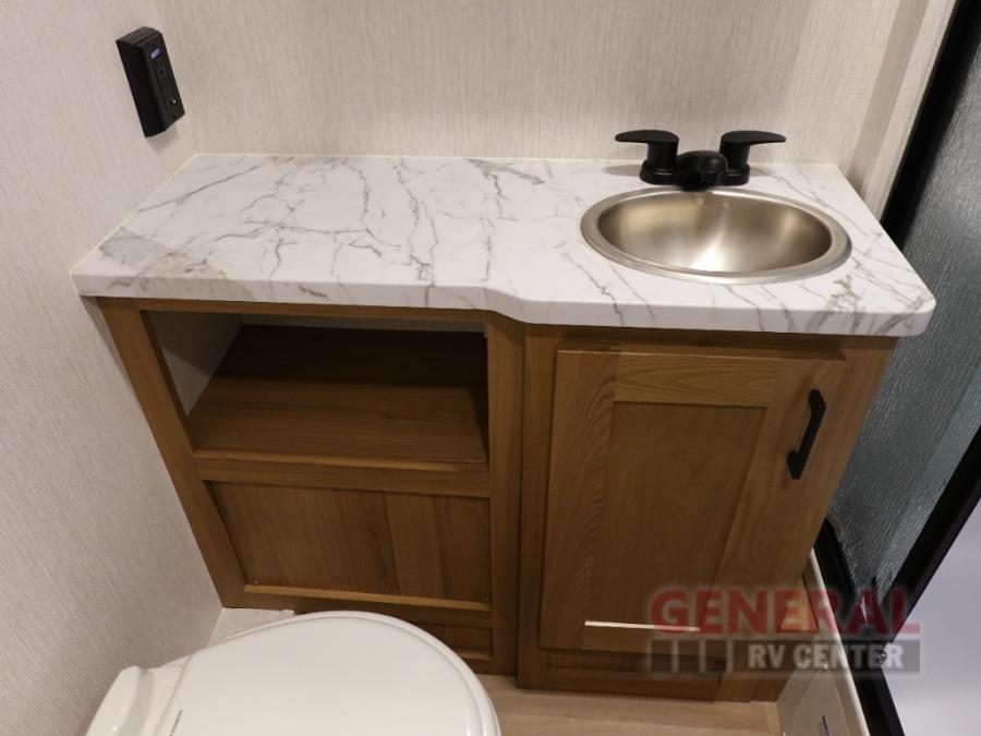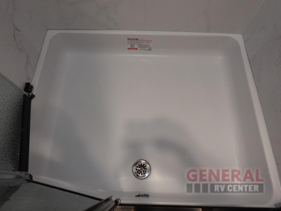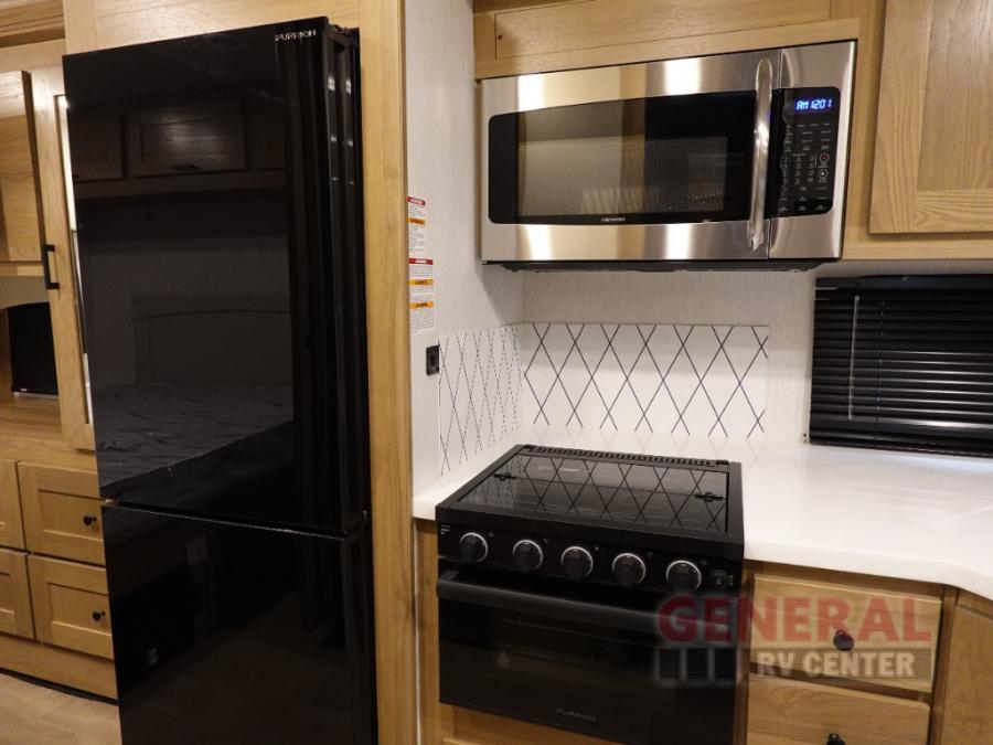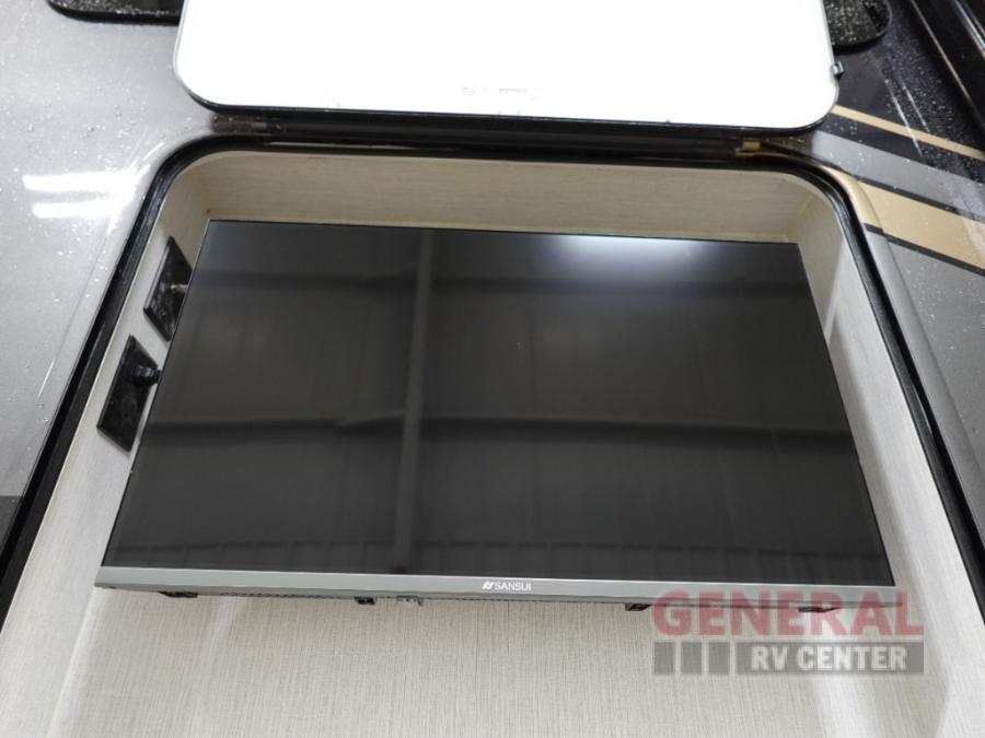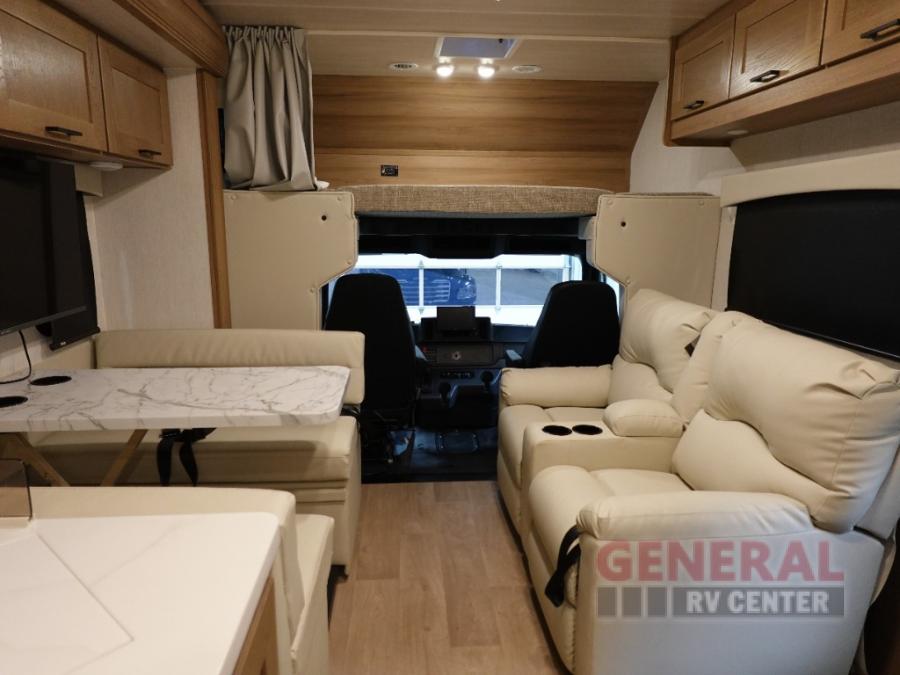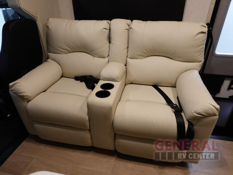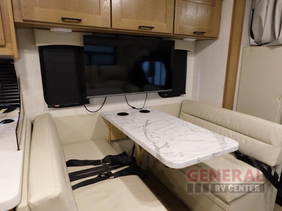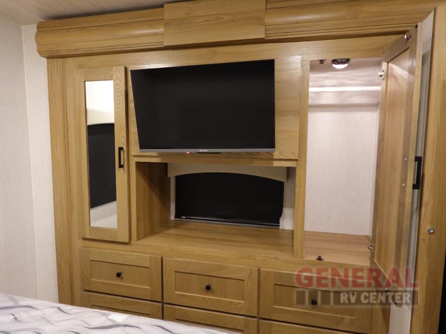 The full-wall slide on this coach is what will make it feel more open, just like at home! You can prepare meals on the three burner cooktop, or in the stainless steel microwave. There is a booth dinette to dine at and a 10 cu. ft. 12V refrigerator to store your leftovers. A sofa will also provide seating and sleeping space, along with the bunk over cab! This model includes a full bath with a shower skylight, electric roof vent, and a large medicine cabinet to store your things. When you're ready for bed, head to the rear bedroom for a great night's rest on the bed and there is bedroom wardrobe to keep your items tidy!