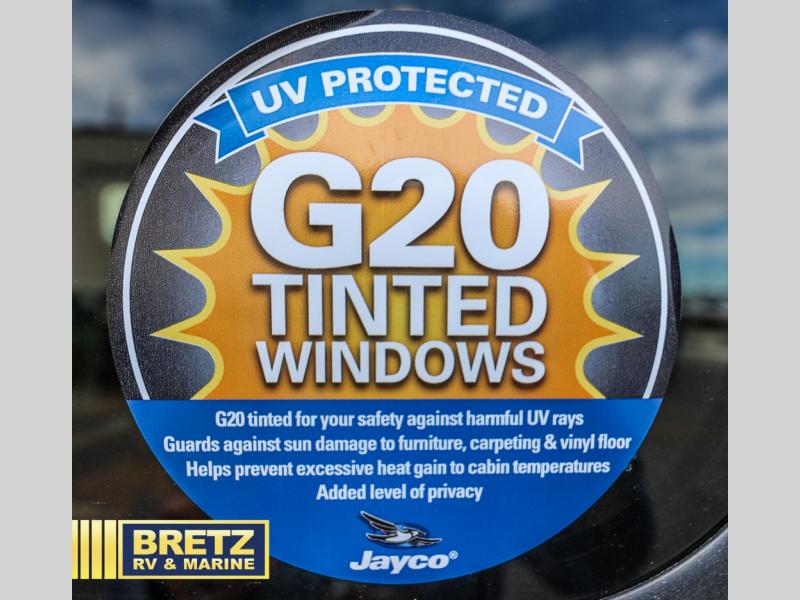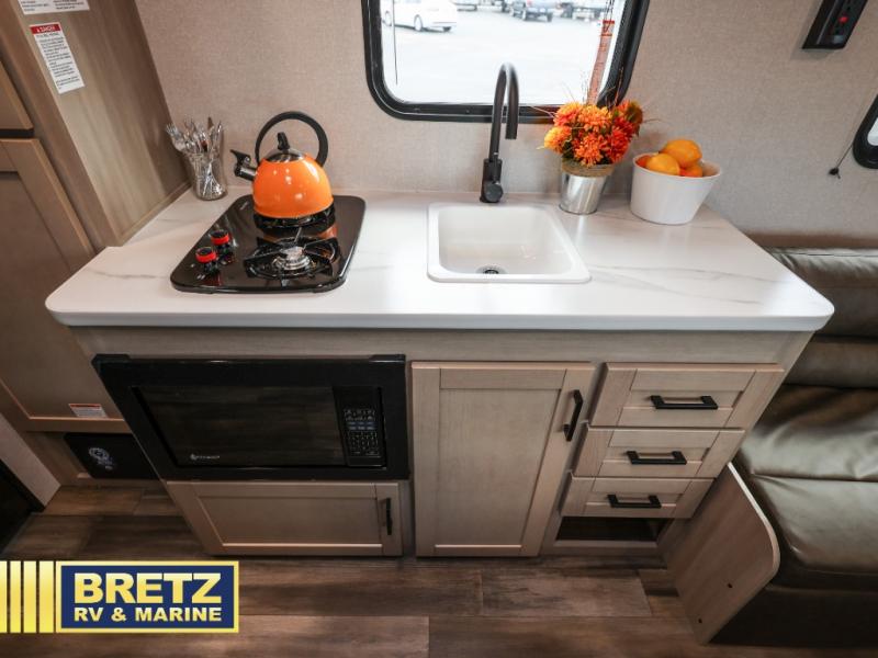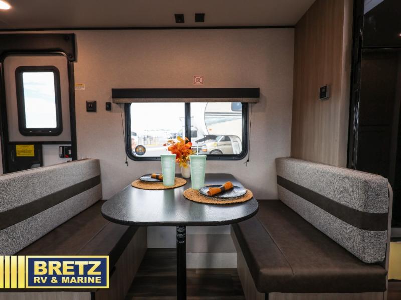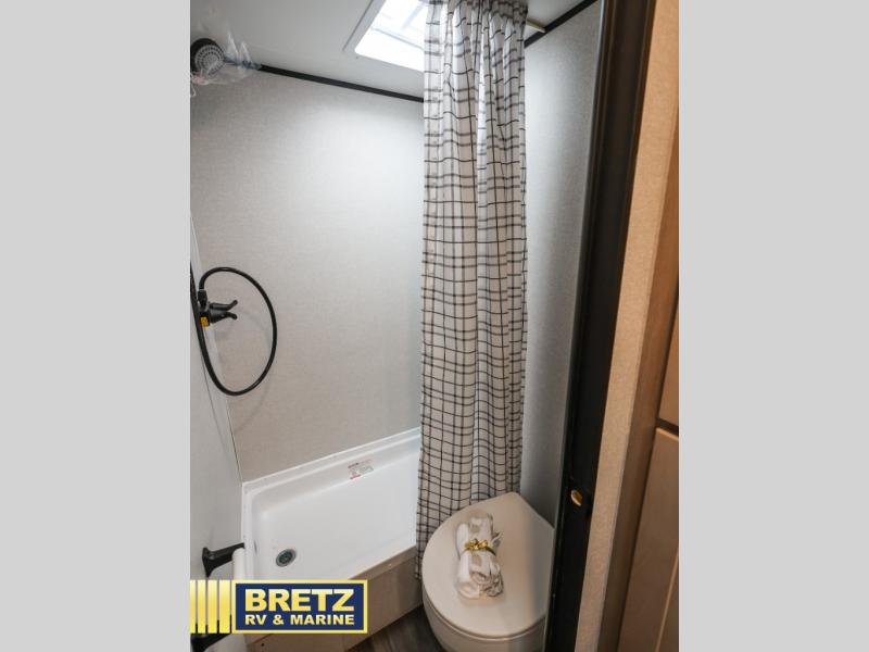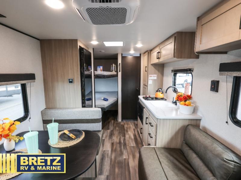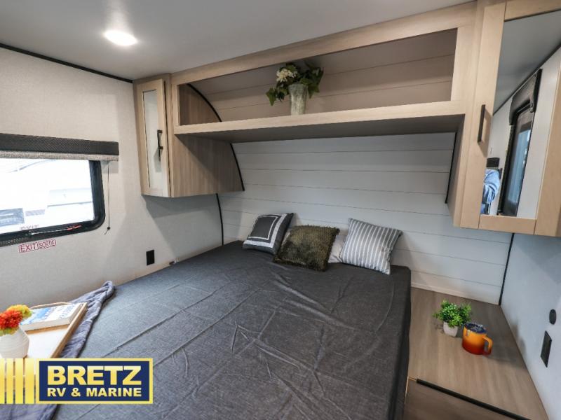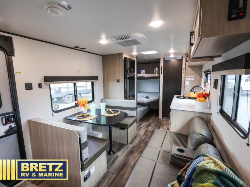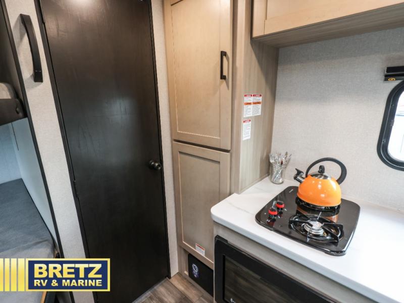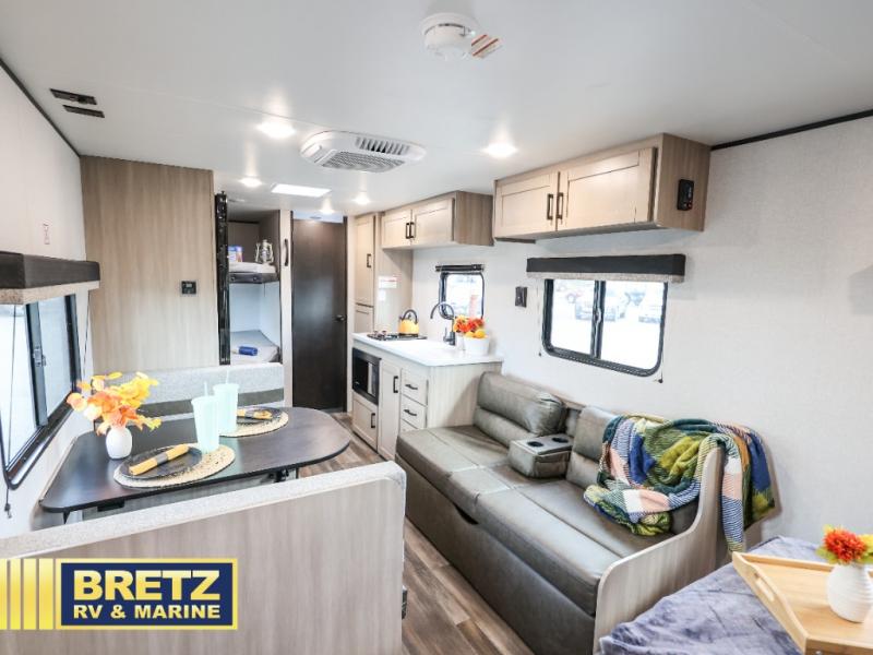 If you enjoy camping with a larger group, this travel trailer is perfect for you! There are double-size bunks in the back, which are right next to the private bath with a toilet and 40" shower. You can take the front queen bed with dual wardrobes, and any other guests can convert the sofa and booth dinette to sleeping space. A two-burner cooktop will let you make breakfast for everyone in the morning, and a 12V refrigerator will keep your perishables fresh!