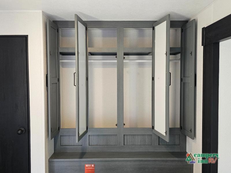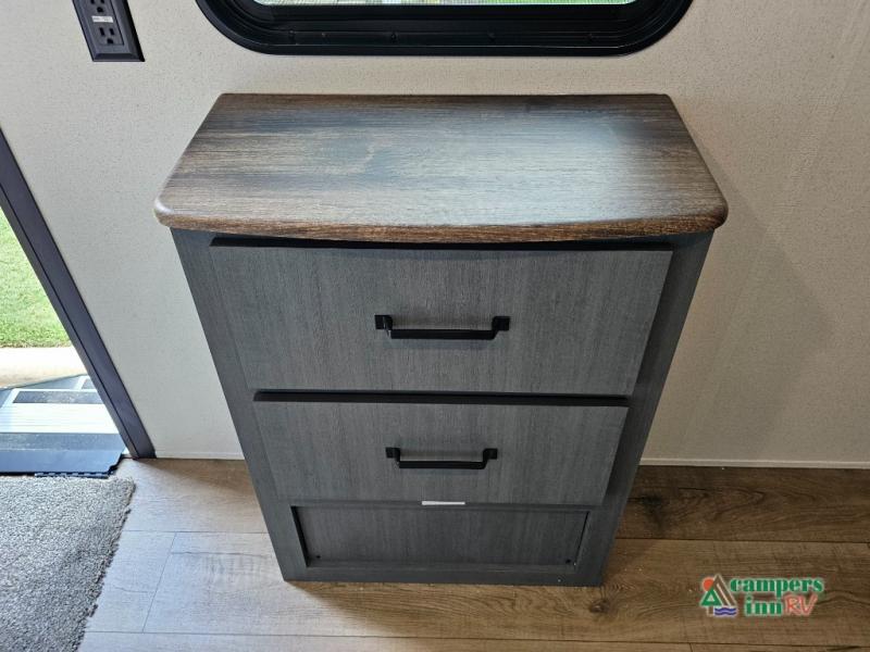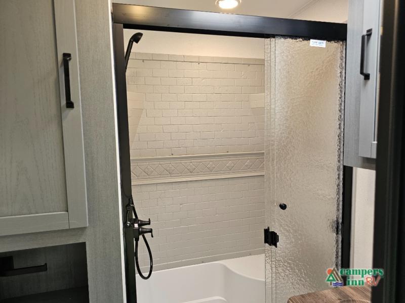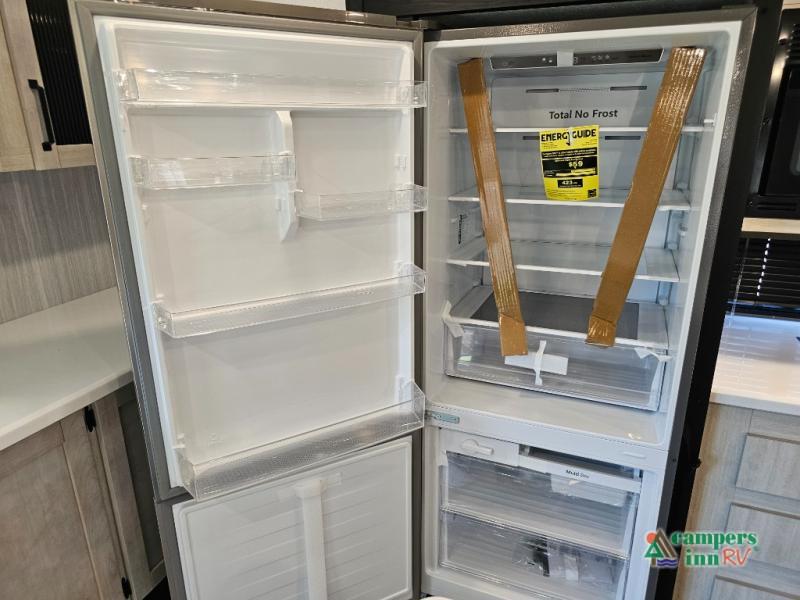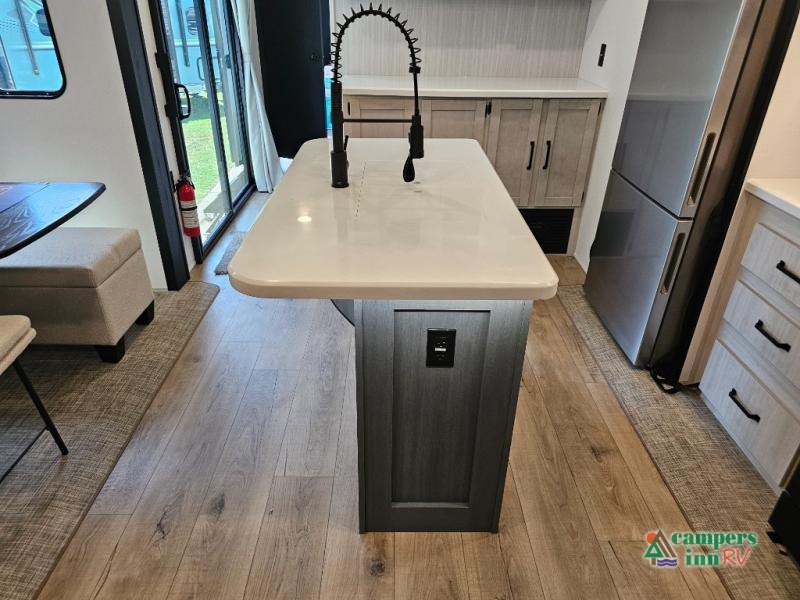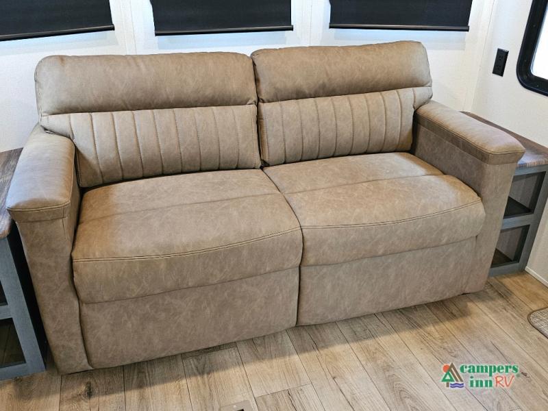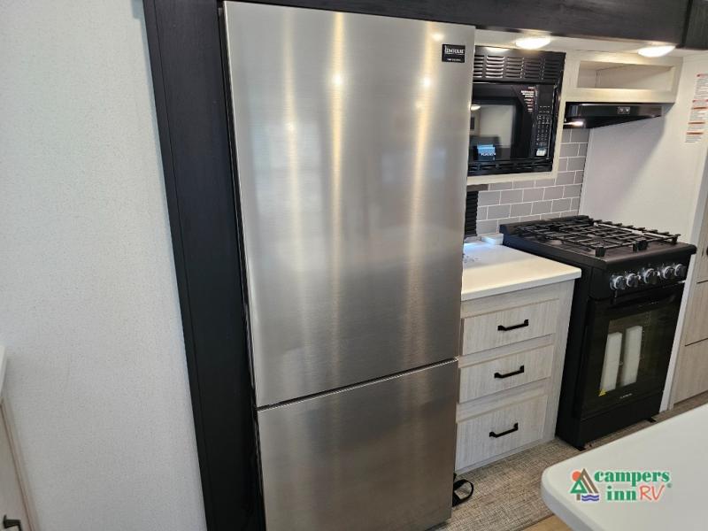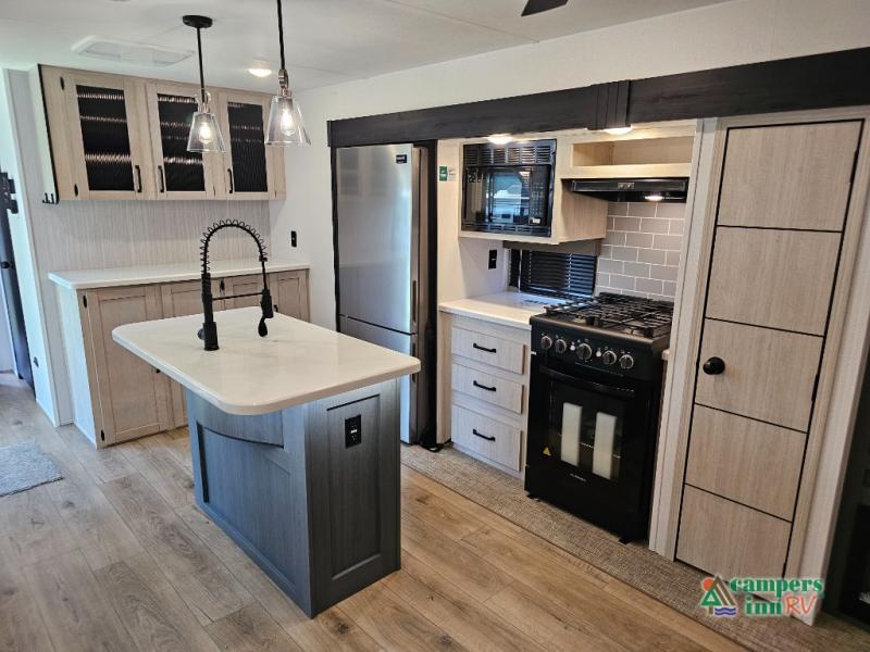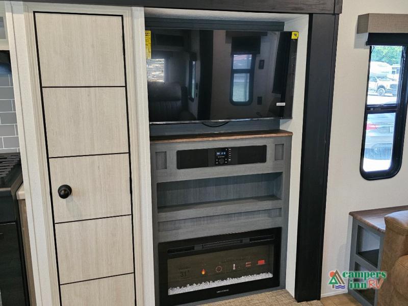 Get ready to enjoy your destination for a weekend or even longer in comfort with the front living and kitchen combined area. The sofa and booth dinette offer relaxing and dining space as well as sleeping space when needed. There are two recliners you are sure to love, as well as a fireplace to make it feel more like home. There is a kitchen island to prepare and serve meals from and wash the dishes. The kitchen offers full amenities including a stainless steel refrigerator and plenty of storage. You will surely enjoy the natural lighting from the patio door, and the second entry/exit is located in the rear private bedroom where you can sleep like a royalty on the king bed. There is also a closet with the option to add washer and dryer prep if you choose!