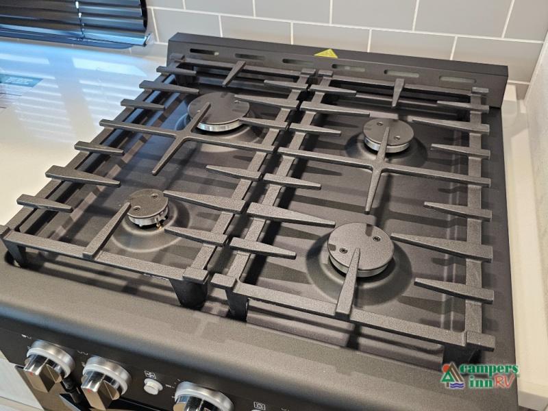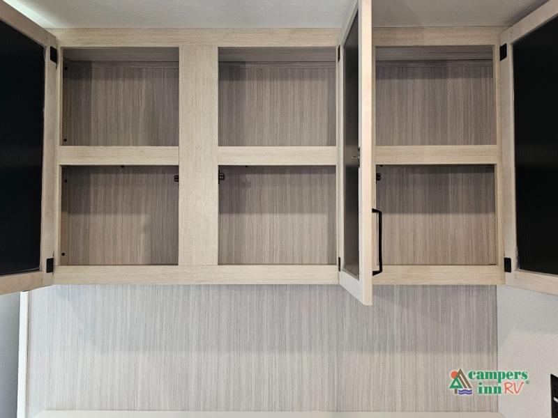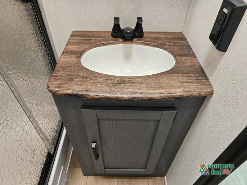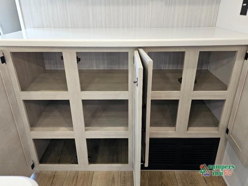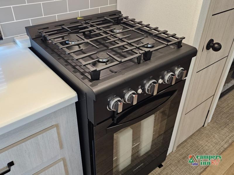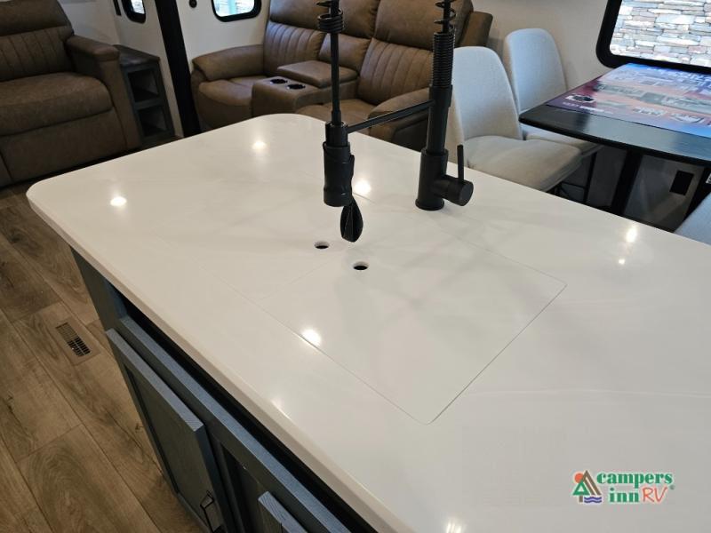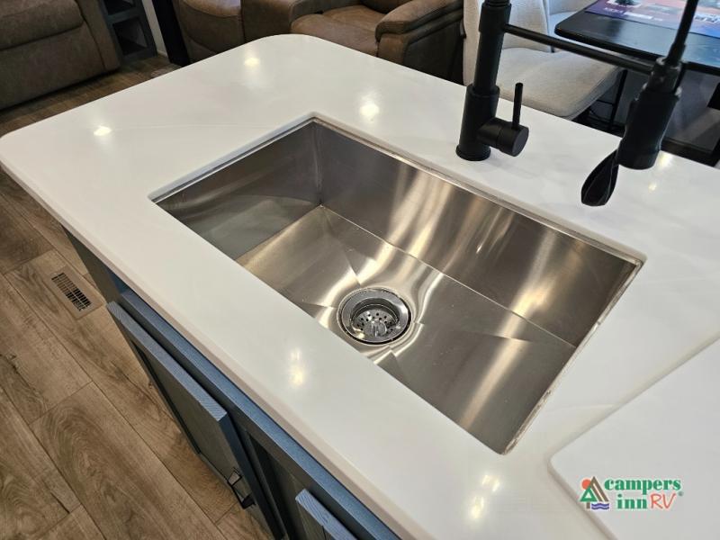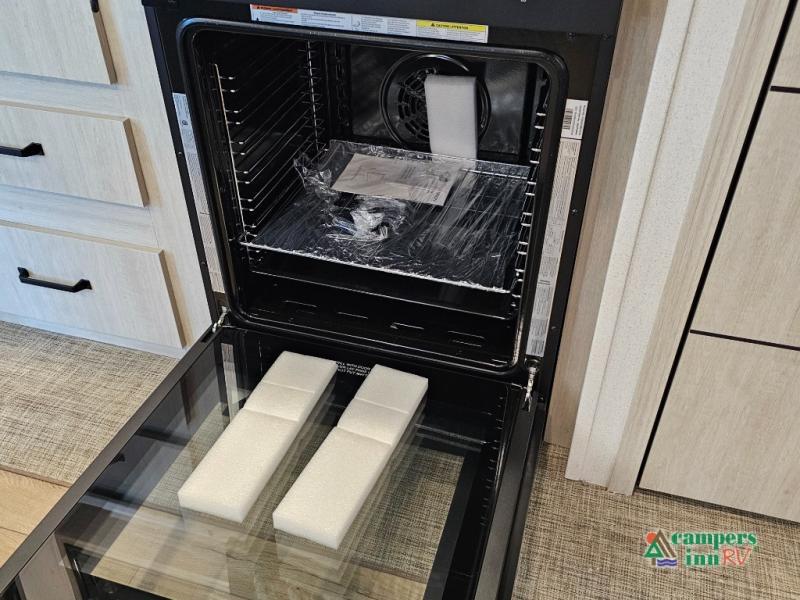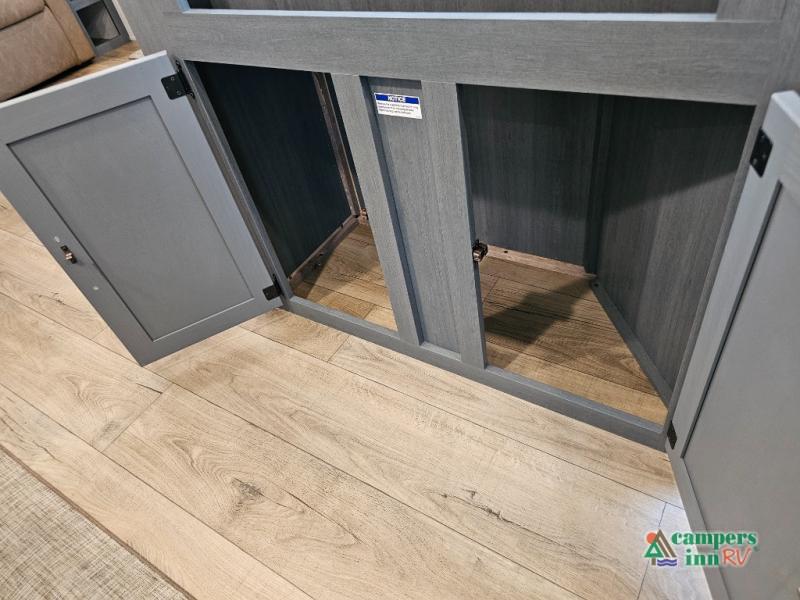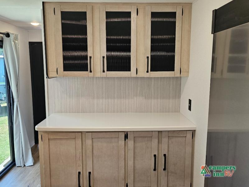 Get ready to enjoy your destination for a weekend or even longer in comfort with the front living and kitchen combined area. The sofa and booth dinette offer relaxing and dining space as well as sleeping space when needed. There are two recliners you are sure to love, as well as a fireplace to make it feel more like home. There is a kitchen island to prepare and serve meals from and wash the dishes. The kitchen offers full amenities including a stainless steel refrigerator and plenty of storage. You will surely enjoy the natural lighting from the patio door, and the second entry/exit is located in the rear private bedroom where you can sleep like a royalty on the king bed. There is also a closet with the option to add washer and dryer prep if you choose!