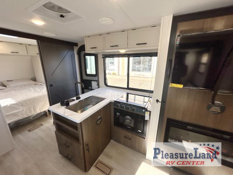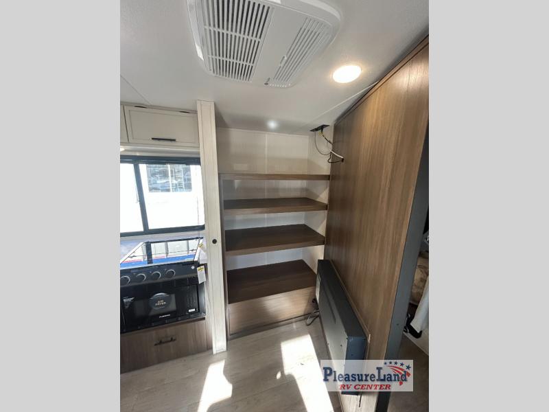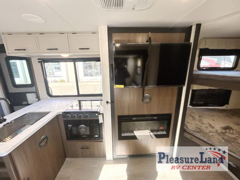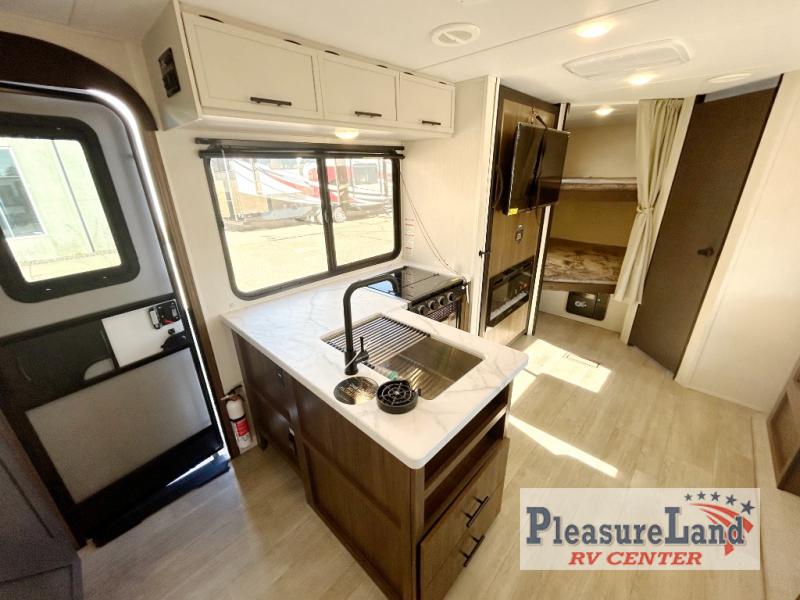 You'll appreciate the added sleeping space in this unit with double-size bunks! You'll have your own space up front in the private bedroom, complete with a camp king bed and storage for your things, and if you need even more sleeping space, the dinette can be used as well. The chef of your group will find a three-burner cooktop and a built-in convection microwave with an air fryer to cook meals, plus there is a 12V refrigerator and large hidden pantry for food storage. This unit also includes a power awning outdoors and an outside refrigerator to keep cold drinks close by.