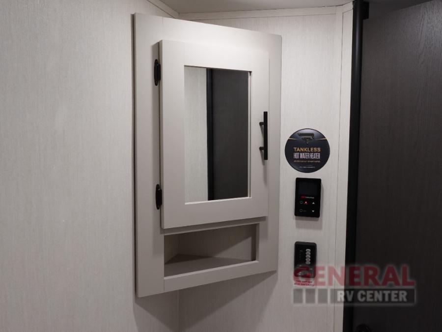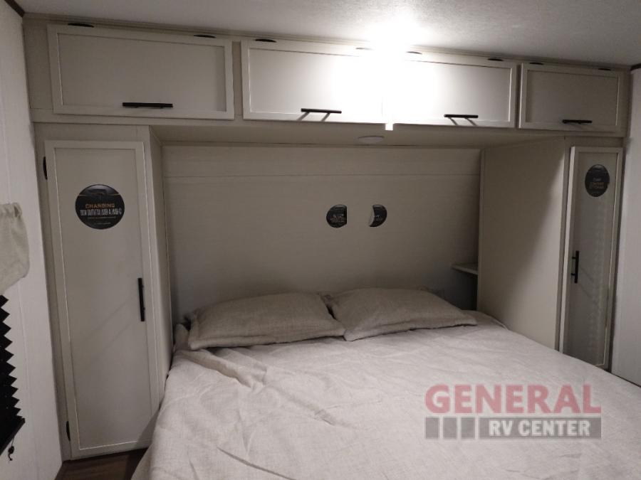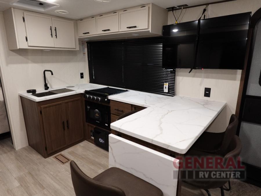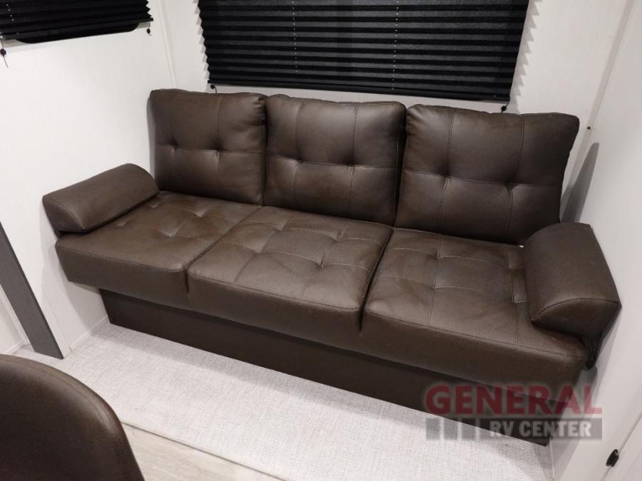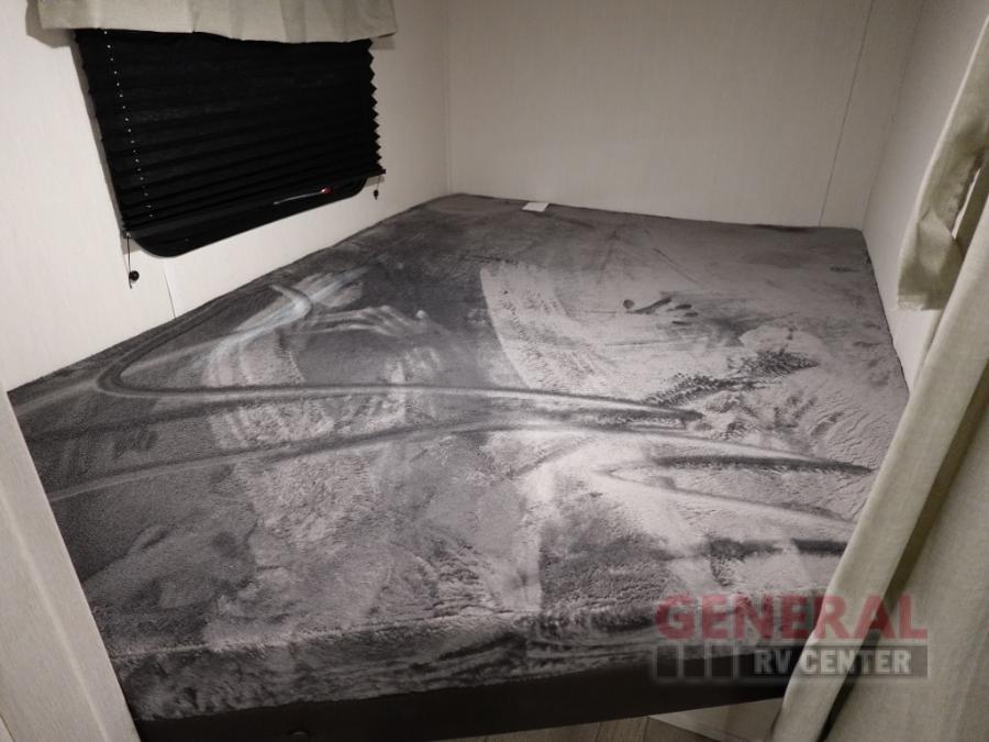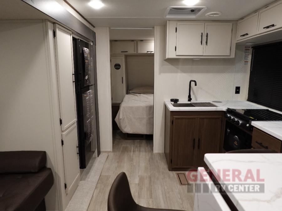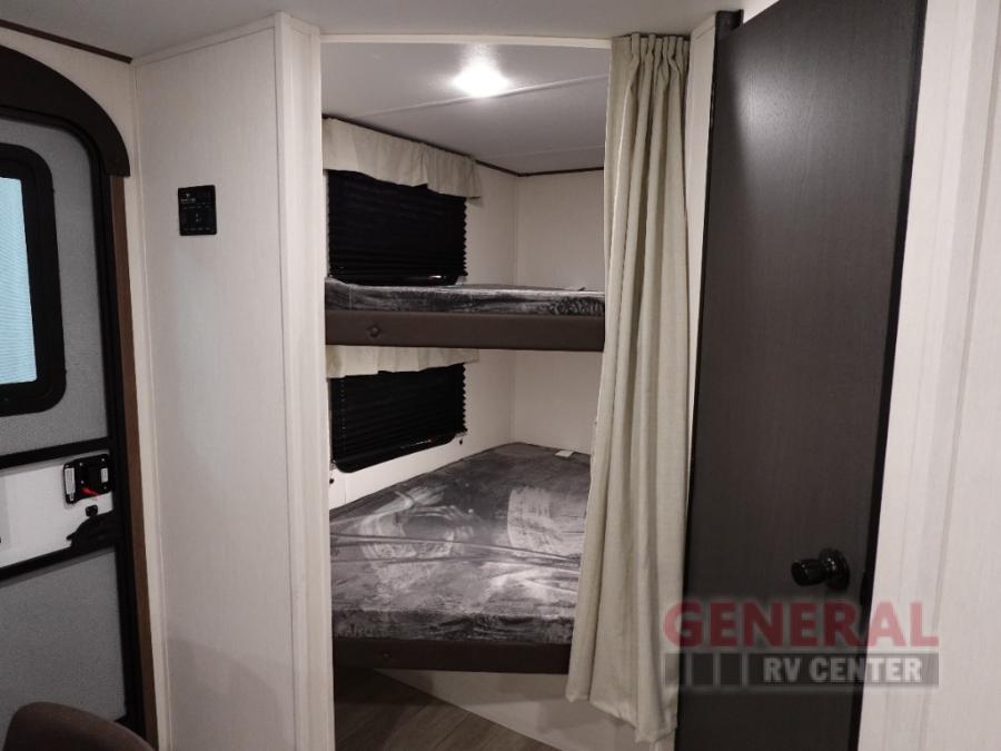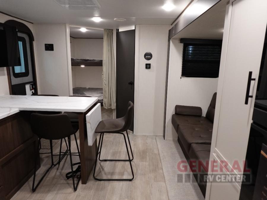 Head to your local state park in this spacious travel trailer! You'll love the oversized windows to let more natural light in, and the sofa slide out will provide more interior space. An L-shaped counter with stools provides a place to enjoy your morning coffee at, or you may find yourselves on the sofa within the slide out. The 12V refrigerator and pantry can hold all your food for the week. You'll feel right at home in the front private bedroom that includes a camp king bed, dual wardrobes, and an overhead cabinet for even more storage, while your guests take the double-size bunks in the back!