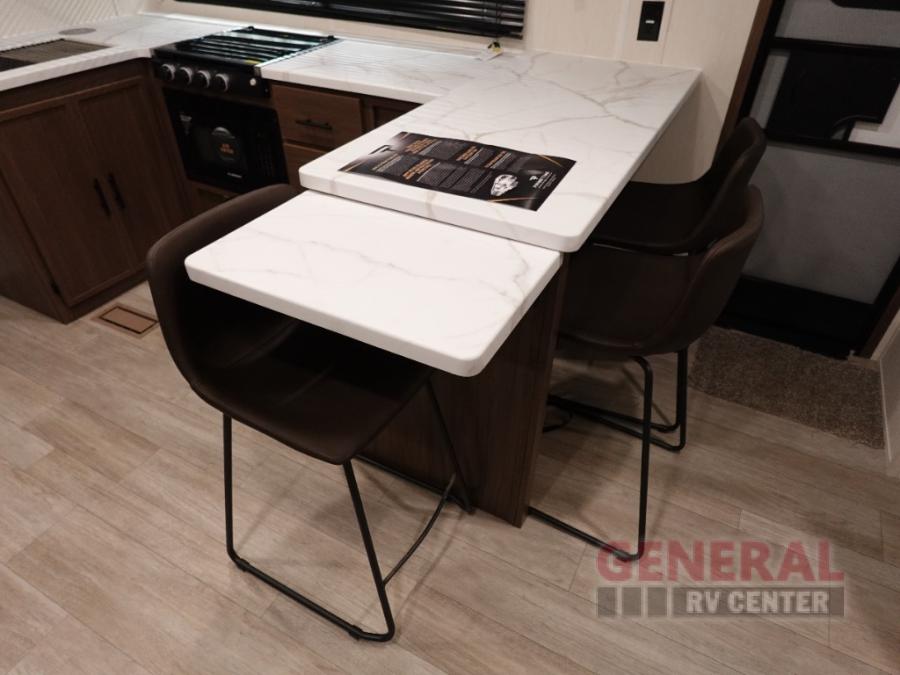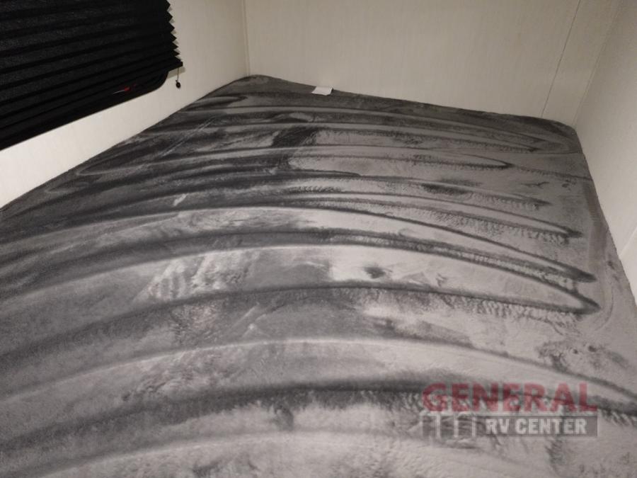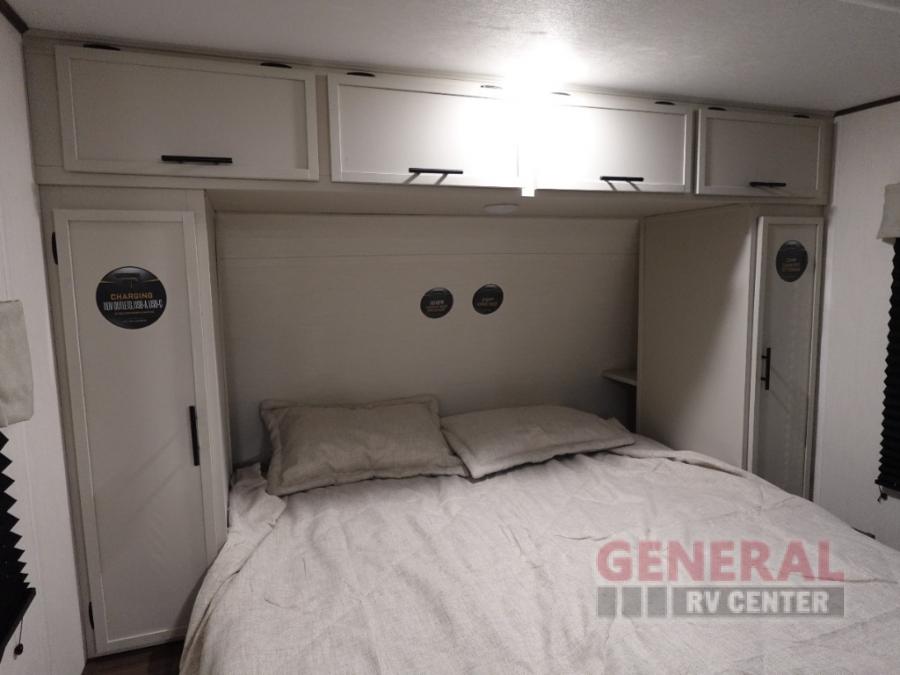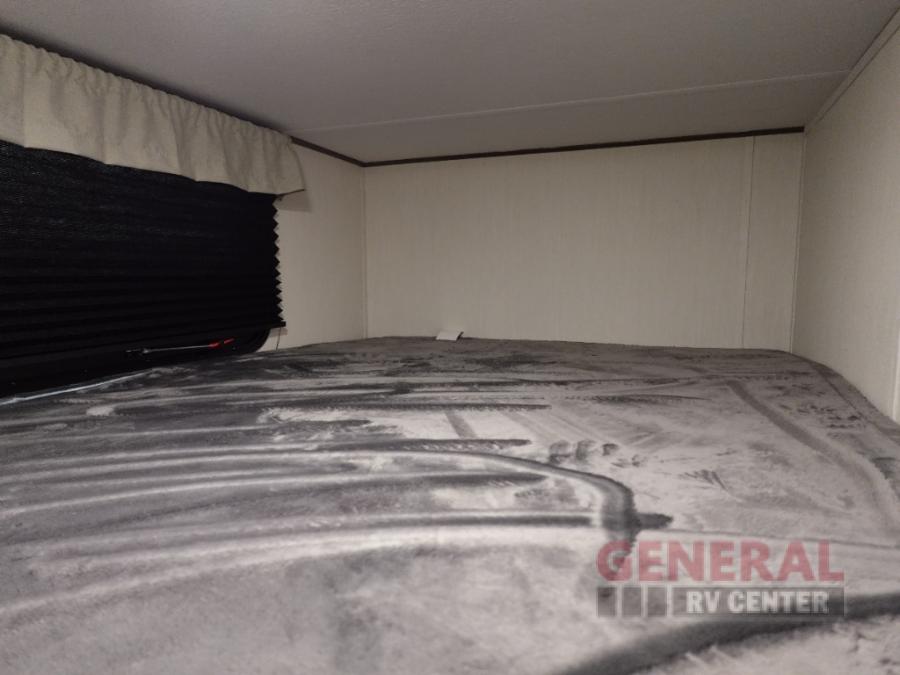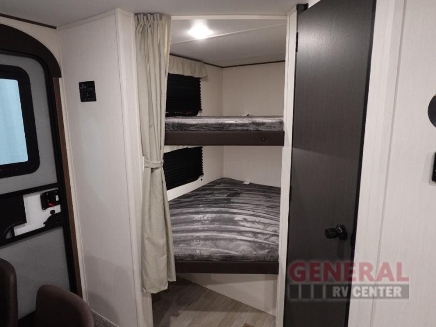Head to your local state park in this spacious travel trailer! You'll love the oversized windows to let more natural light in, and the sofa slide out will provide more interior space. An L-shaped counter with stools provides a place to enjoy your morning coffee at, or you may find yourselves on the sofa within the slide out. The 12V refrigerator and pantry can hold all your food for the week. You'll feel right at home in the front private bedroom that includes a camp king bed, dual wardrobes, and an overhead cabinet for even more storage, while your guests take the double-size bunks in the back!