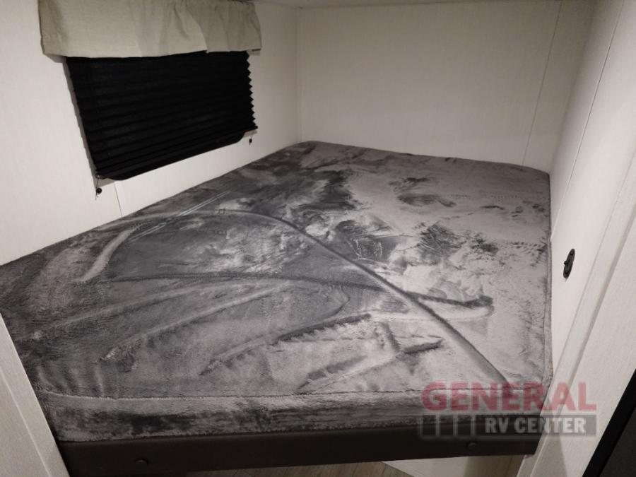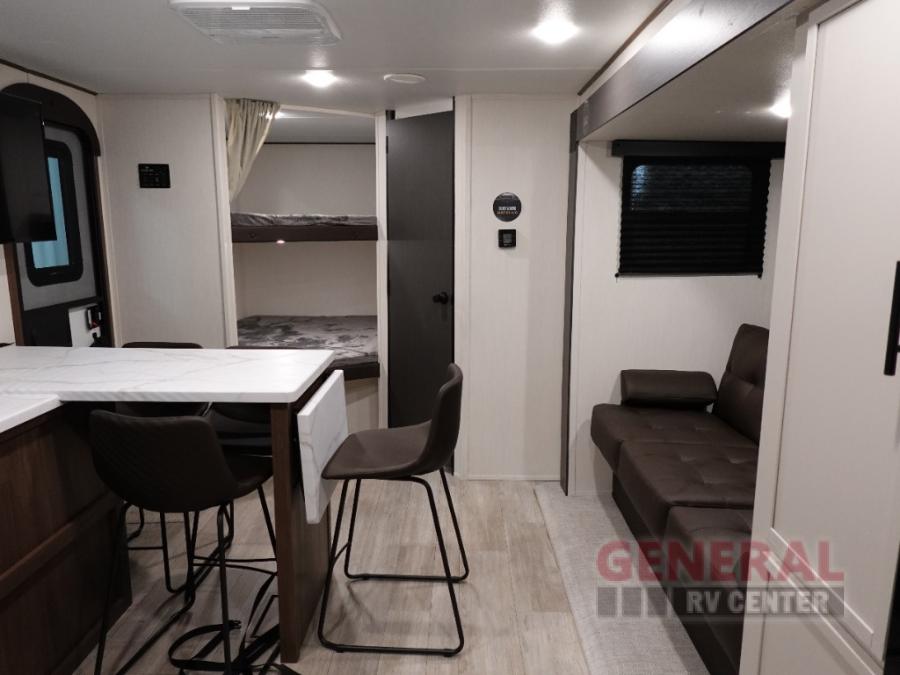 Head to your local state park in this spacious travel trailer! You'll love the oversized windows to let more natural light in, and the sofa slide out will provide more interior space. An L-shaped counter with stools provides a place to enjoy your morning coffee at, or you may find yourselves on the sofa within the slide out. The 12V refrigerator and pantry can hold all your food for the week. You'll feel right at home in the front private bedroom that includes a camp king bed, dual wardrobes, and an overhead cabinet for even more storage, while your guests take the double-size bunks in the back!