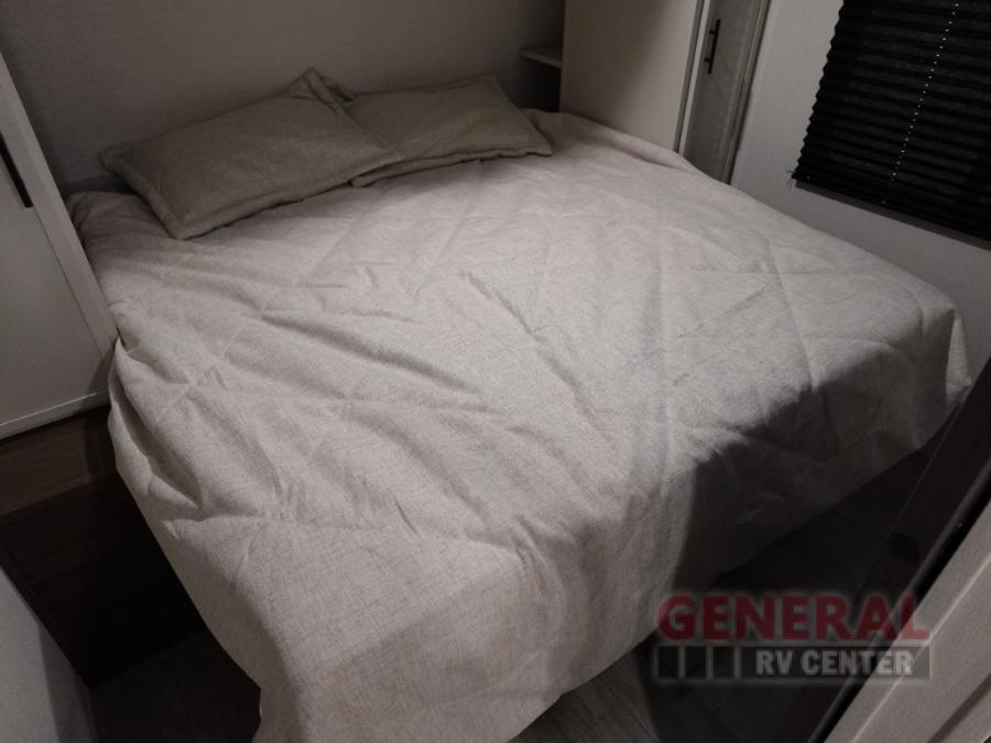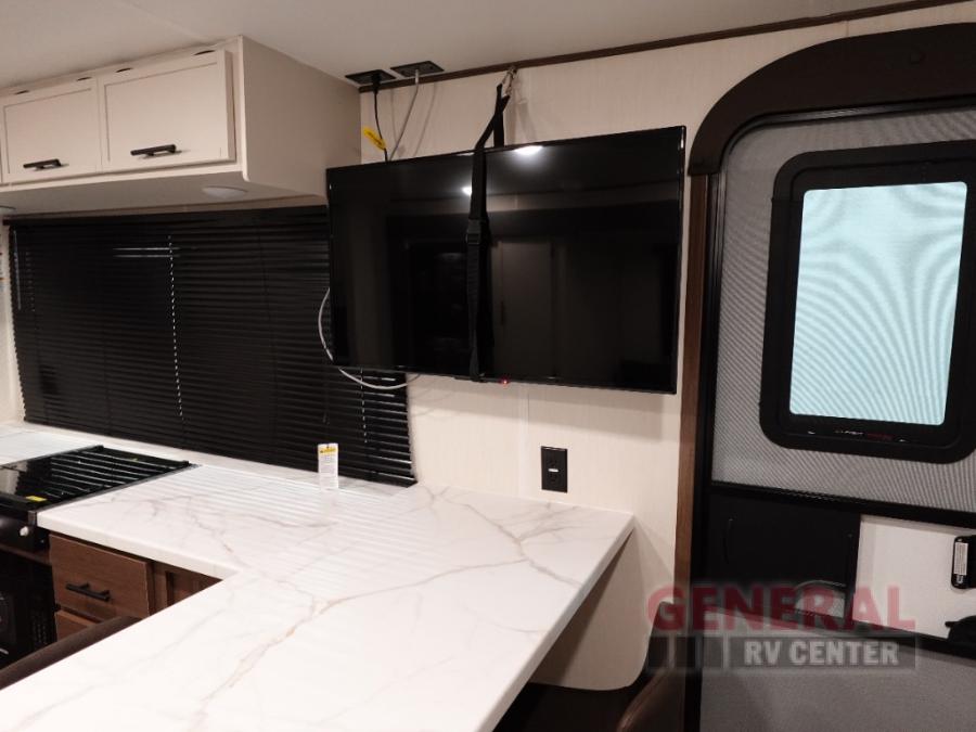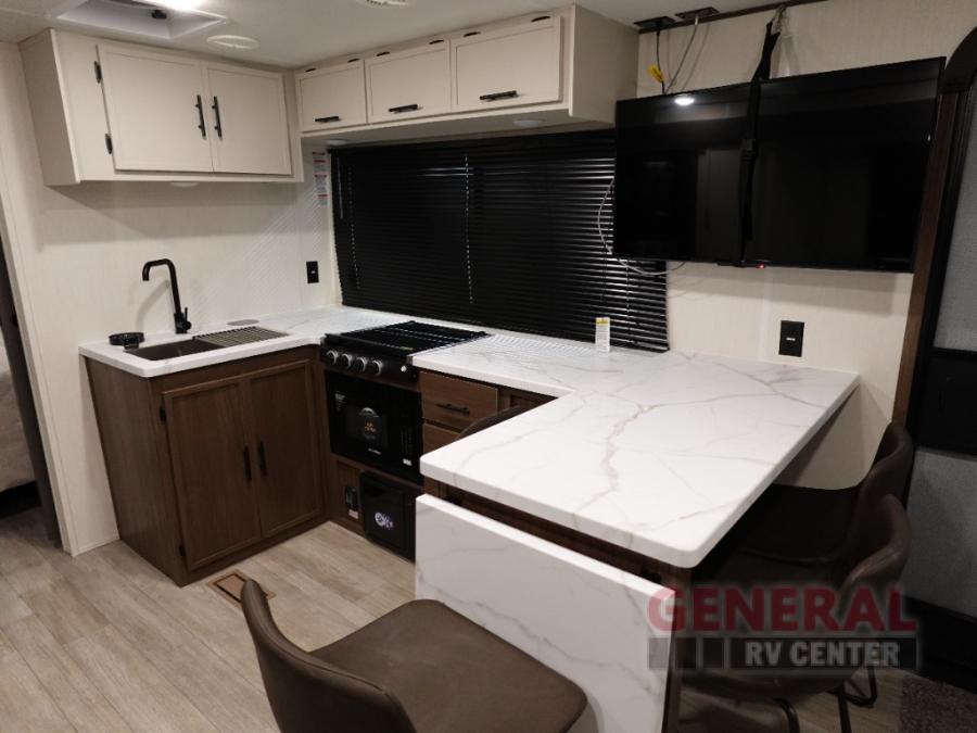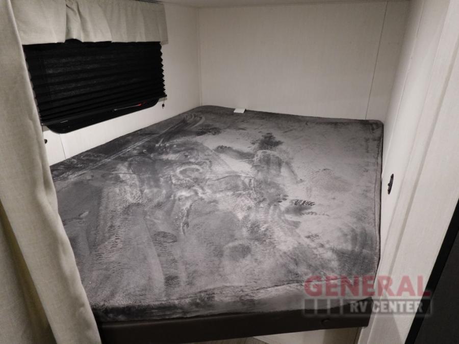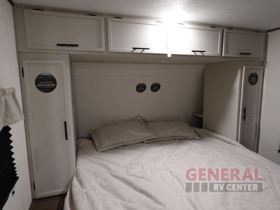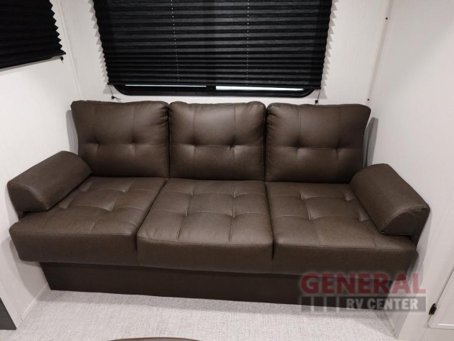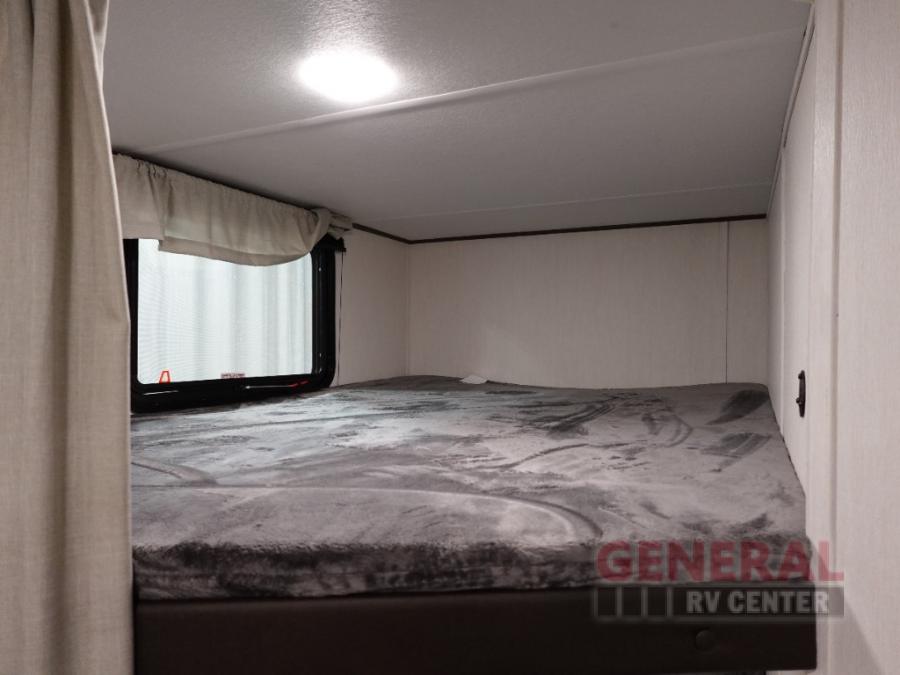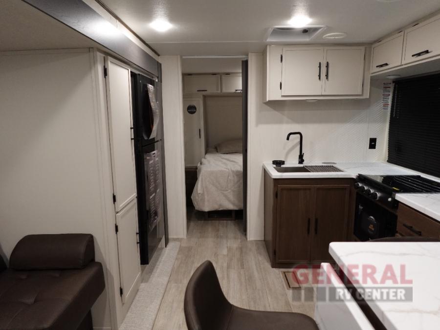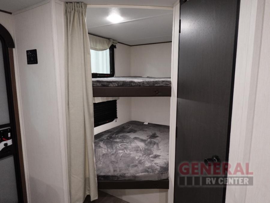 Head to your local state park in this spacious travel trailer! You'll love the oversized windows to let more natural light in, and the sofa slide out will provide more interior space. An L-shaped counter with stools provides a place to enjoy your morning coffee at, or you may find yourselves on the sofa within the slide out. The 12V refrigerator and pantry can hold all your food for the week. You'll feel right at home in the front private bedroom that includes a camp king bed, dual wardrobes, and an overhead cabinet for even more storage, while your guests take the double-size bunks in the back!