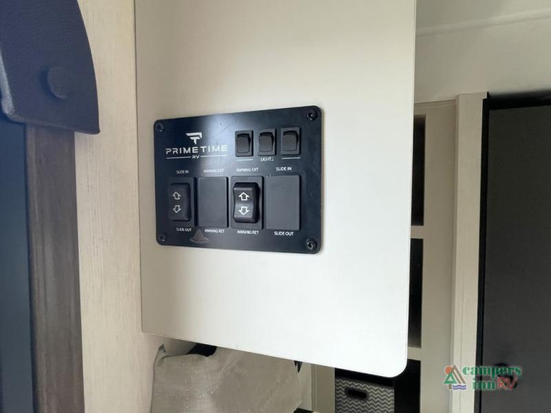 The Prime Time Avenger 25MKO is a mid-size travel trailer perfect for weekend getaways or extended trips. Enjoy your favorite shows on the 50 inch TV from the theater seating, or take a break at the built in desk and chair setup ideal for remote work. The L shaped counter provides additional space for dining or meal prep, and the full rear bathroom offers plenty of room to get ready for the day.