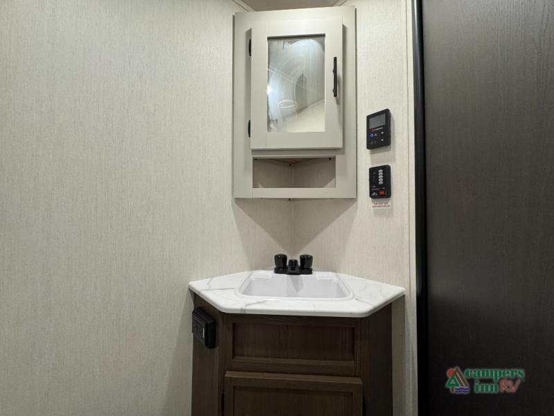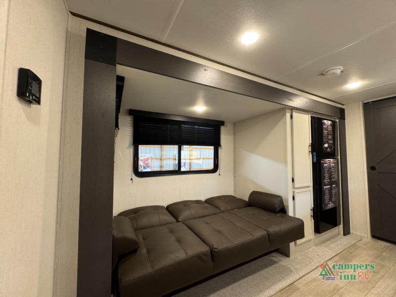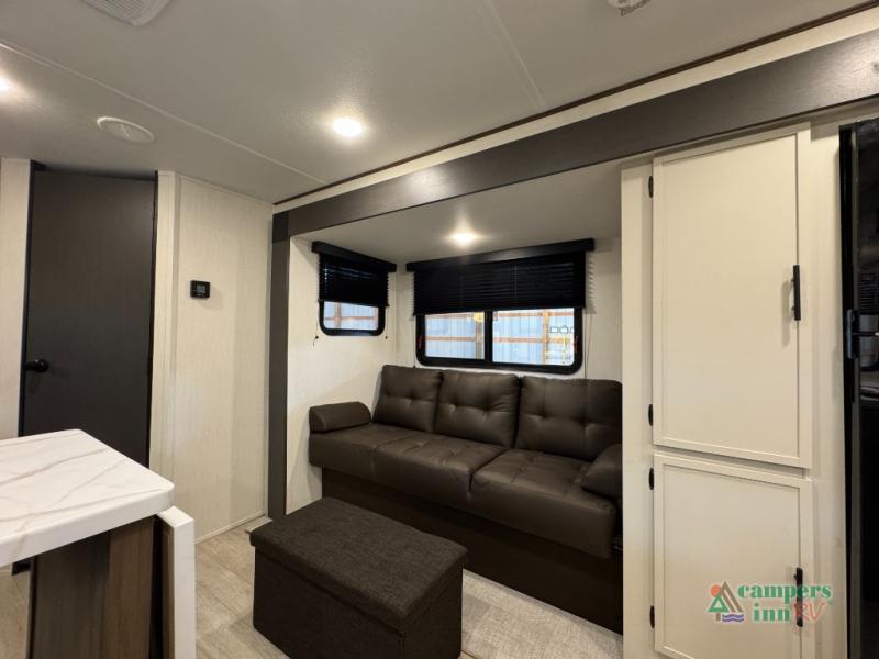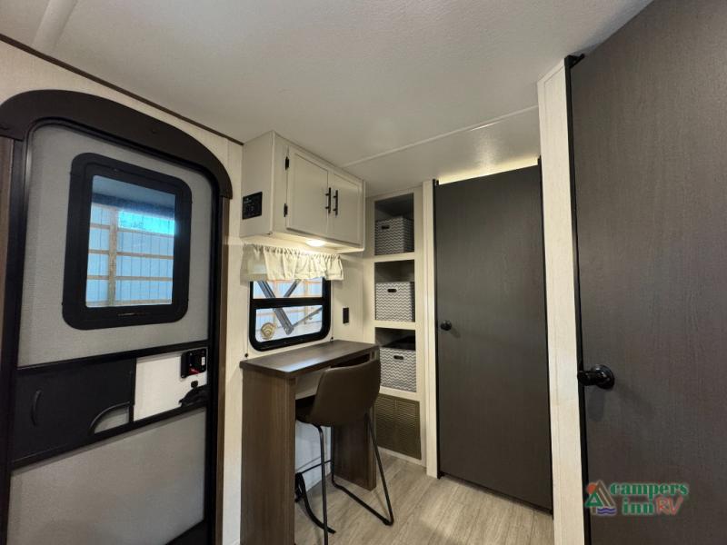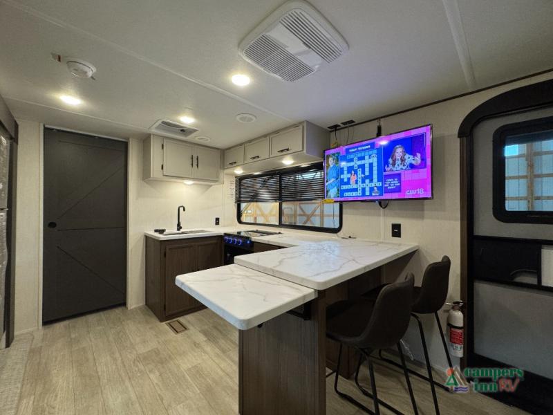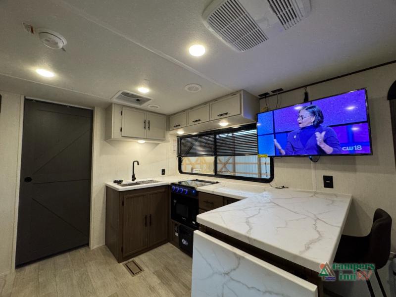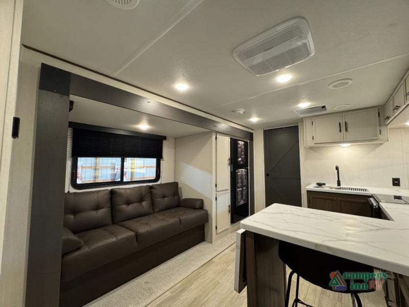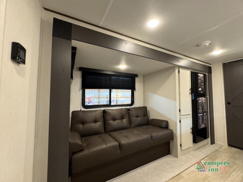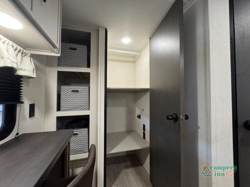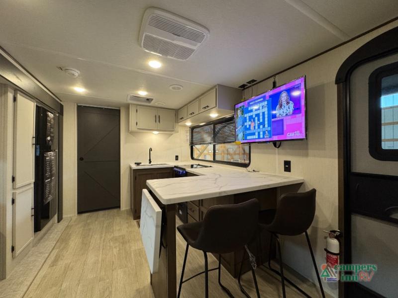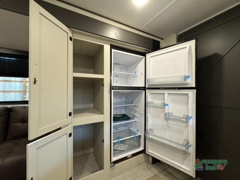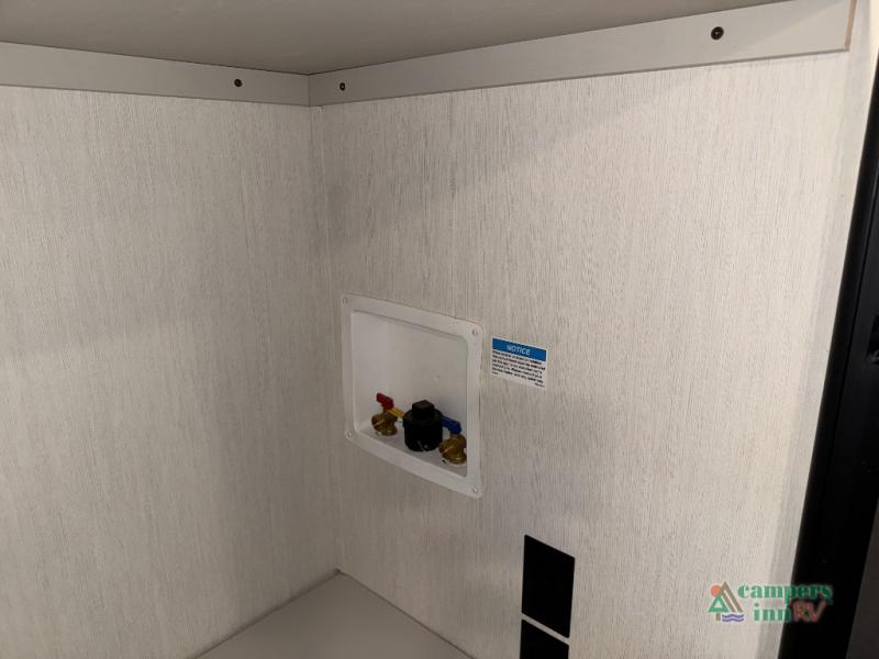 Head to your local state park in this spacious travel trailer! Once you arrive at the campground, you can grab a cold drink from the exterior refrigerator, then head inside to make lunch. An L-shaped counter with two stools provides a place to enjoy your morning coffee at, or you may find yourselves on the sofa within the slide out. The pantry and 12V refrigerator is also found here and can hold all your food for the week. You'll feel right at home in the front private bedroom that includes a camp king bed, dual wardrobes, and an overhead cabinet for even more storage. This model also includes washer and dryer prep if you choose to add those appliances!