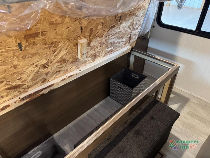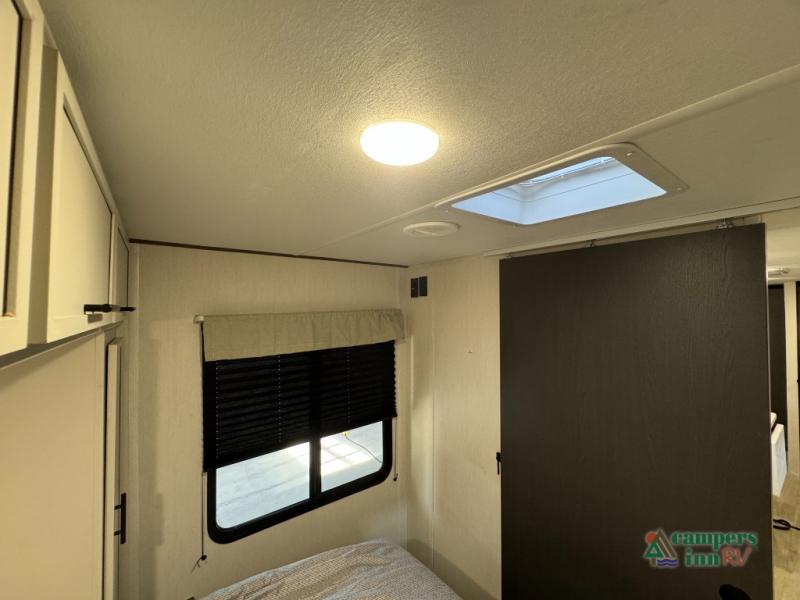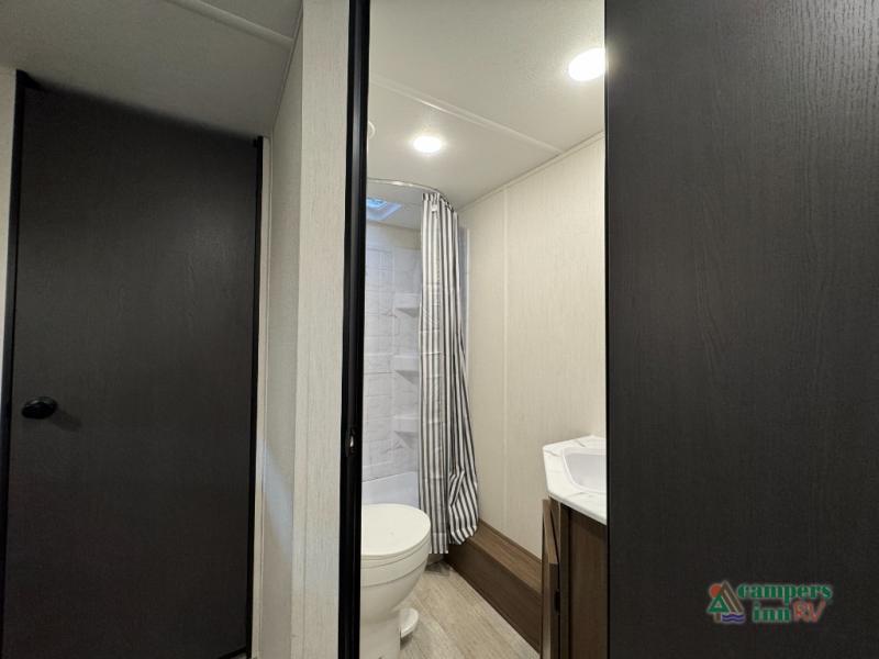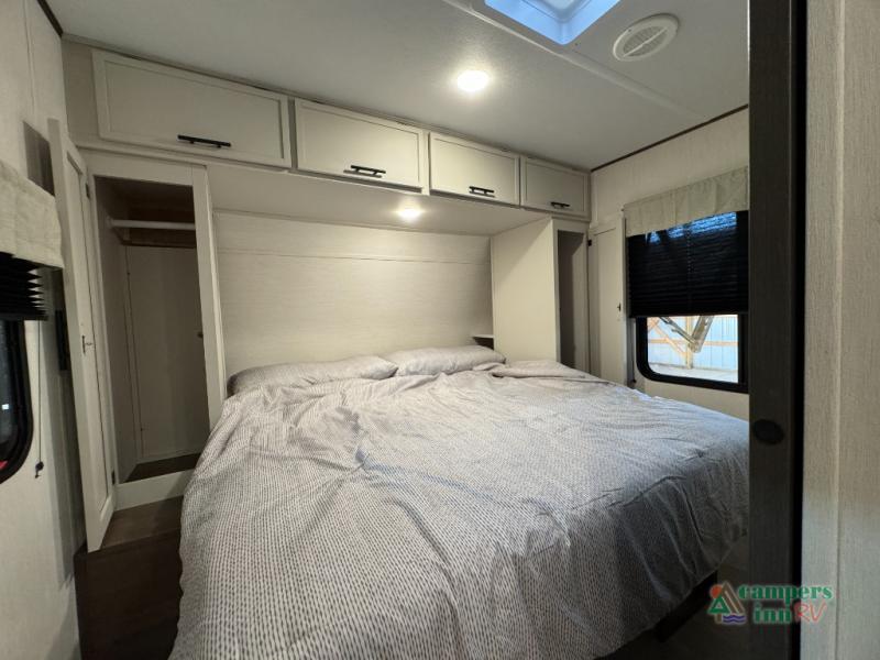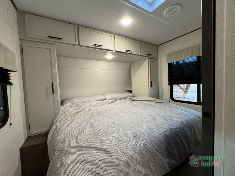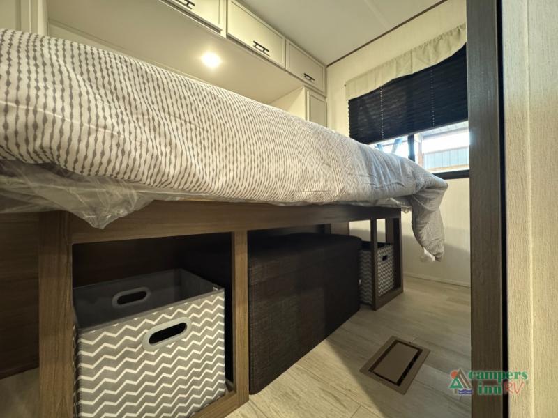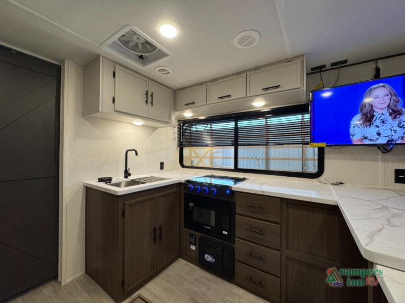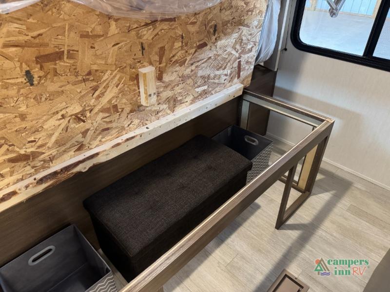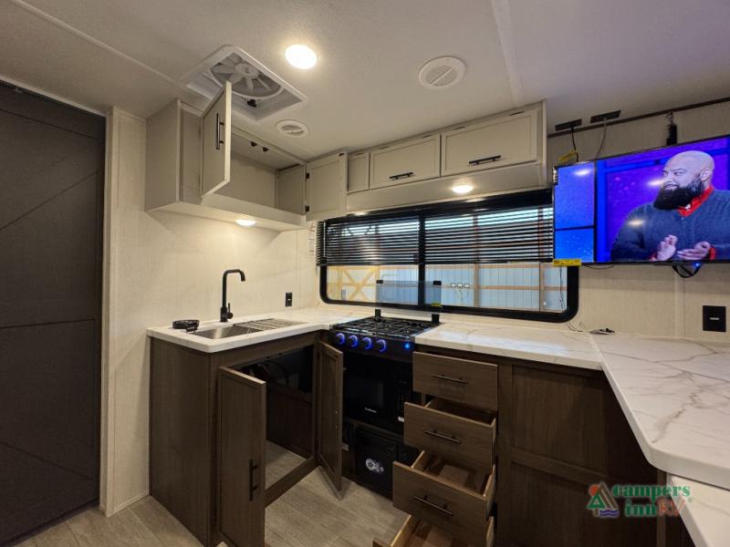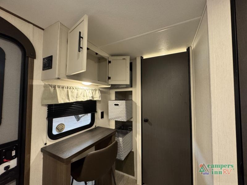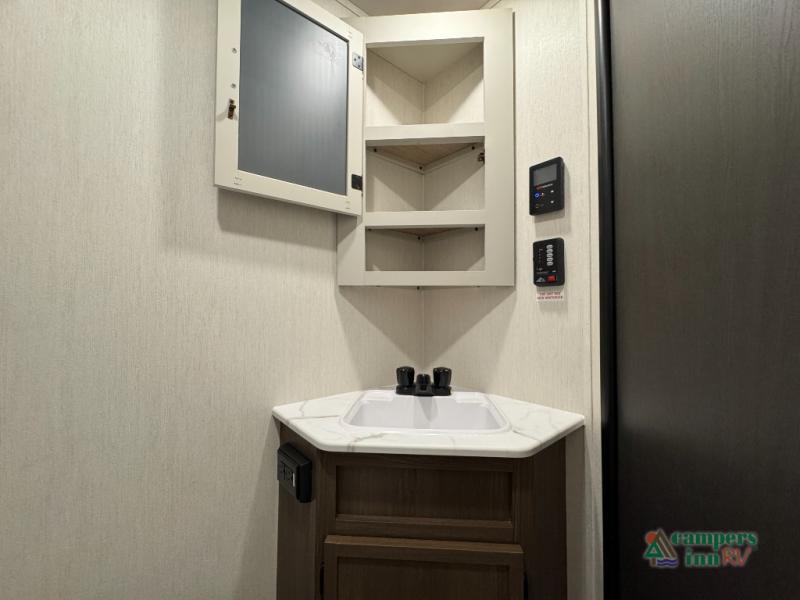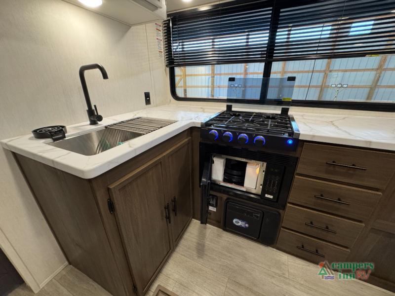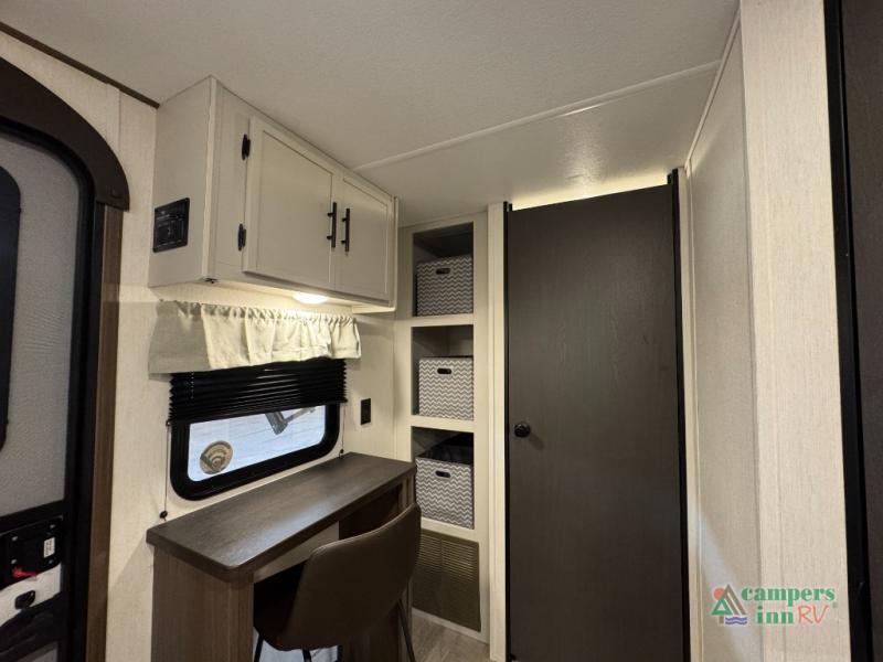Head to your local state park in this spacious travel trailer! Once you arrive at the campground, you can grab a cold drink from the exterior refrigerator, then head inside to make lunch. An L-shaped counter with two stools provides a place to enjoy your morning coffee at, or you may find yourselves on the sofa within the slide out. The pantry and 12V refrigerator is also found here and can hold all your food for the week. You'll feel right at home in the front private bedroom that includes a camp king bed, dual wardrobes, and an overhead cabinet for even more storage. This model also includes washer and dryer prep if you choose to add those appliances!