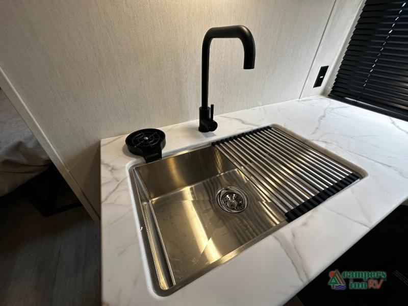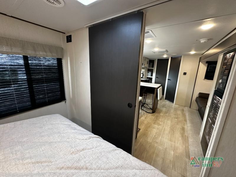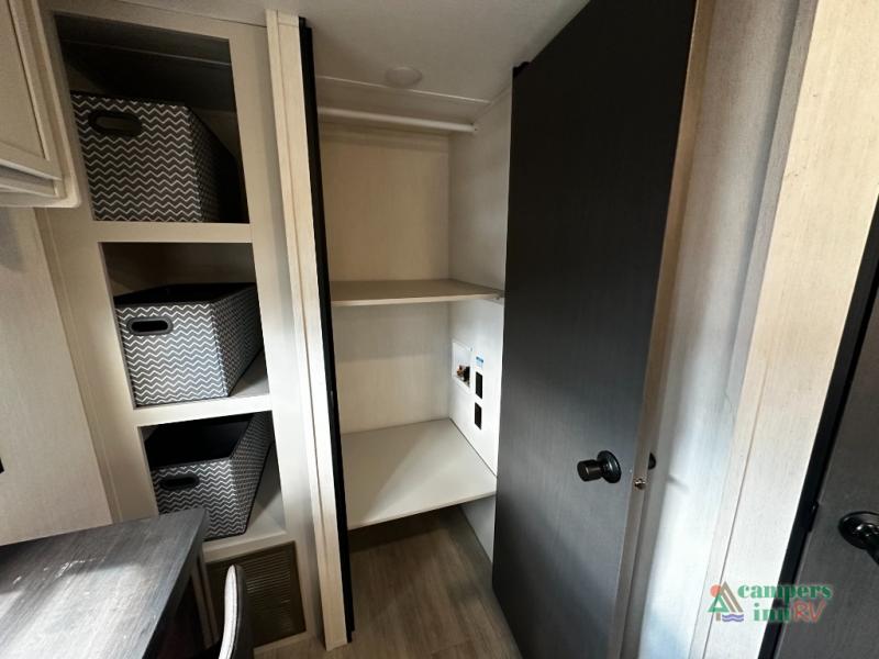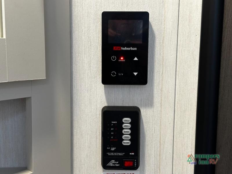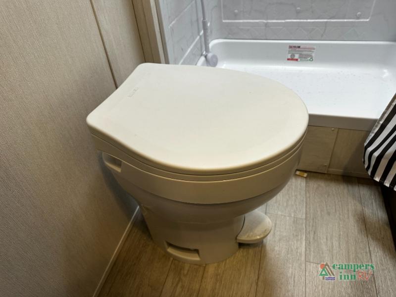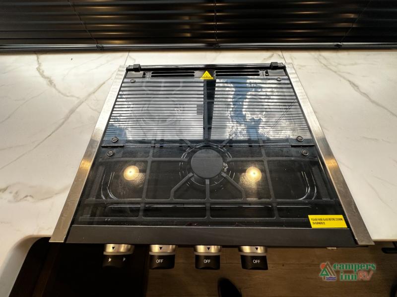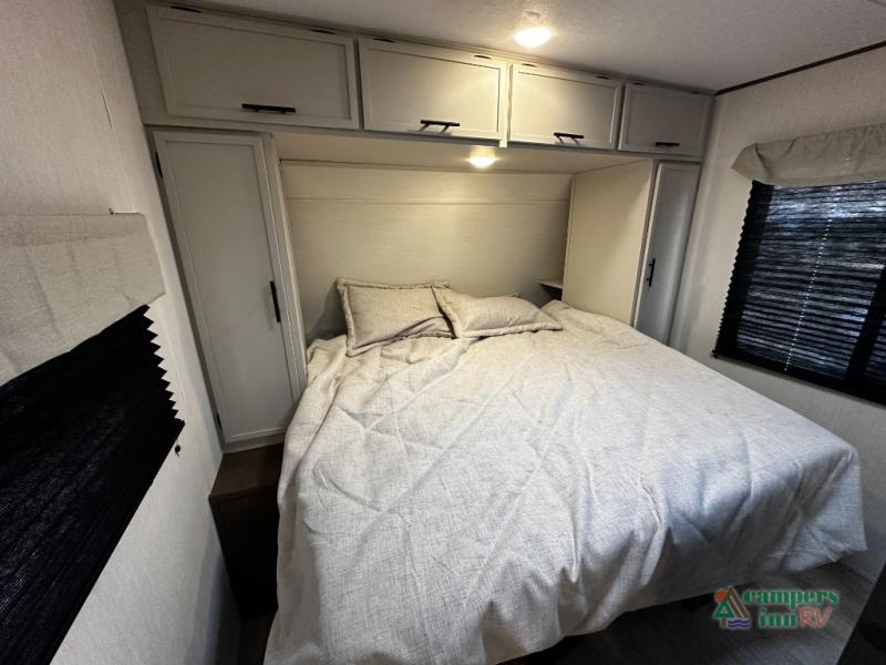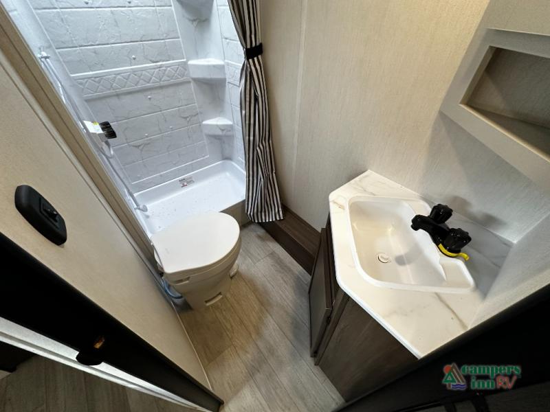 Step inside and discover a thoughtfully designed interior that maximizes space and functionality. The mid-kitchen layout features modern appliances, ample counter space, and plenty of cabinetry, making meal prep simple and convenient while traveling. The front bedroom provides a comfortable queen bed with convenient wardrobe storage, offering a private retreat after a full day of adventure. The dinette provides seating for meals or relaxing, and easily converts into additional sleeping space when needed. A full bathroom with a shower and well-planned storage ensures comfort for everyone on the road.