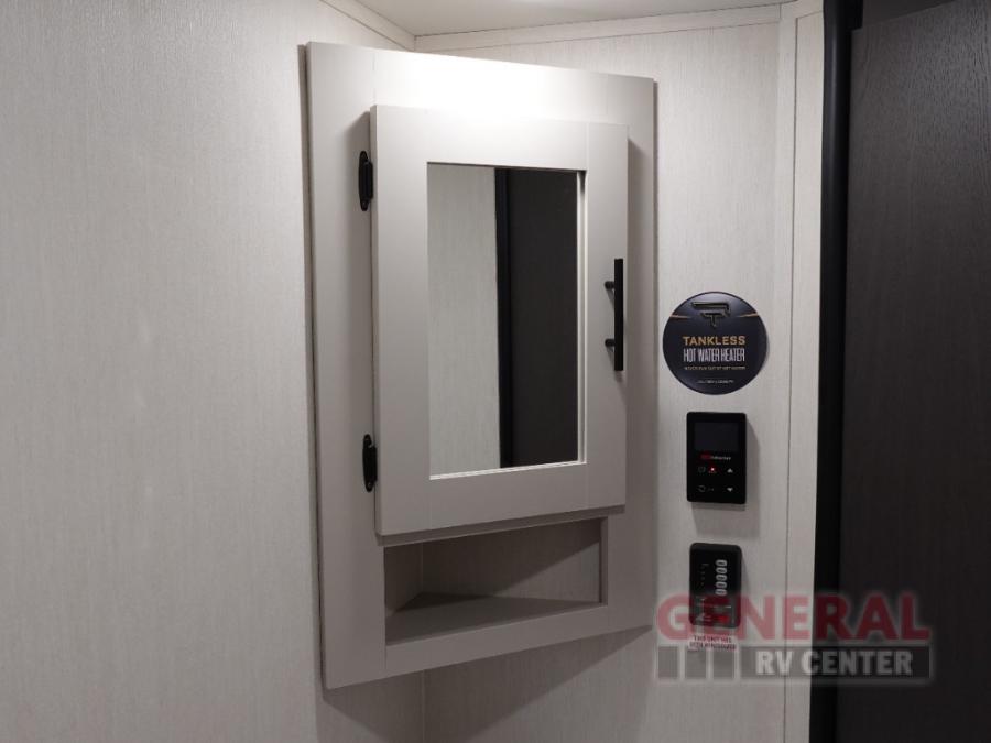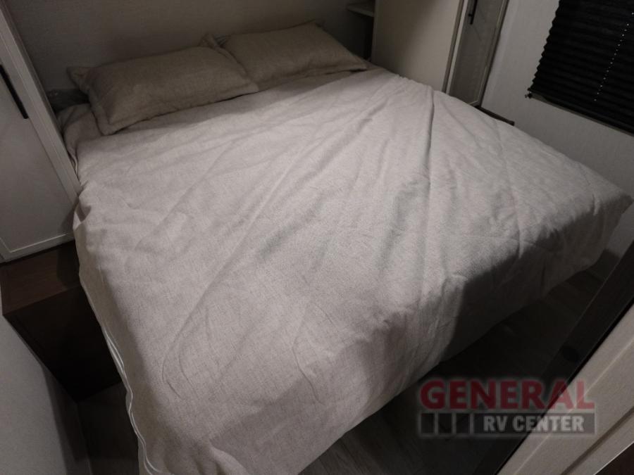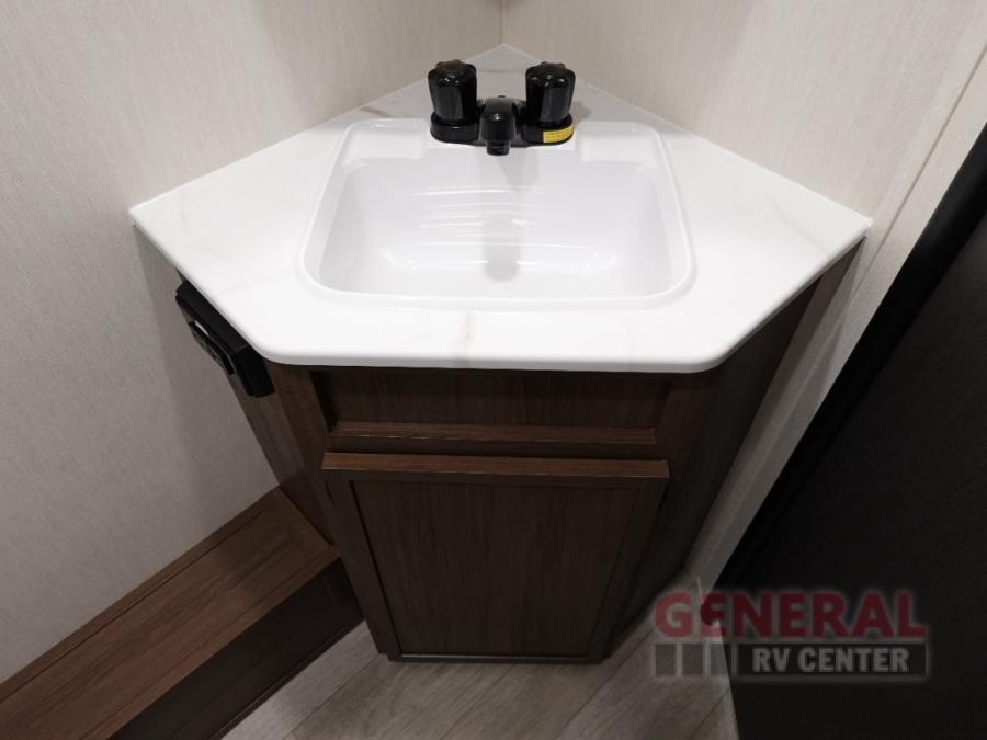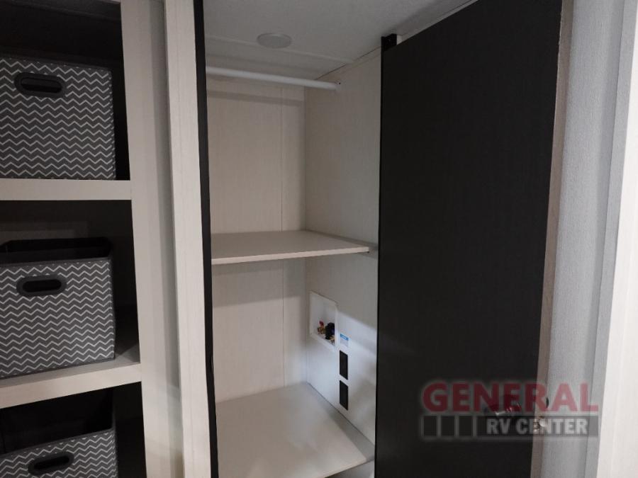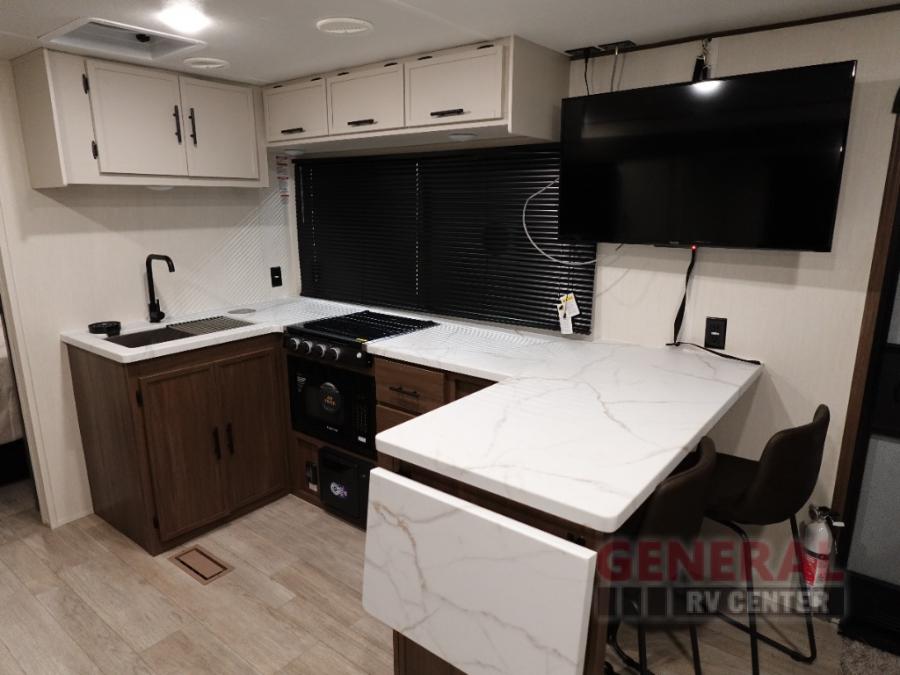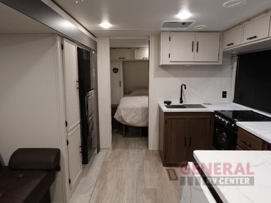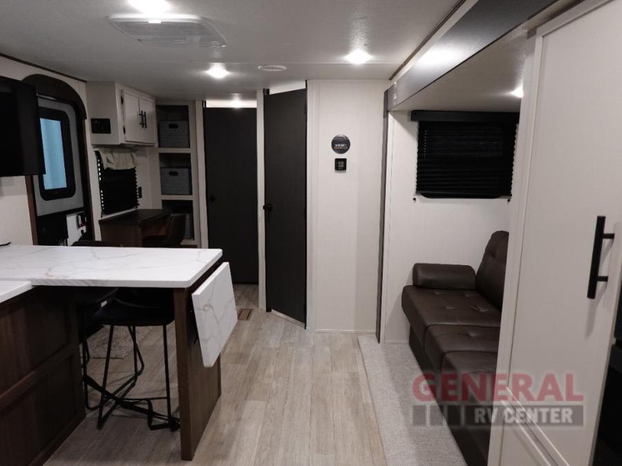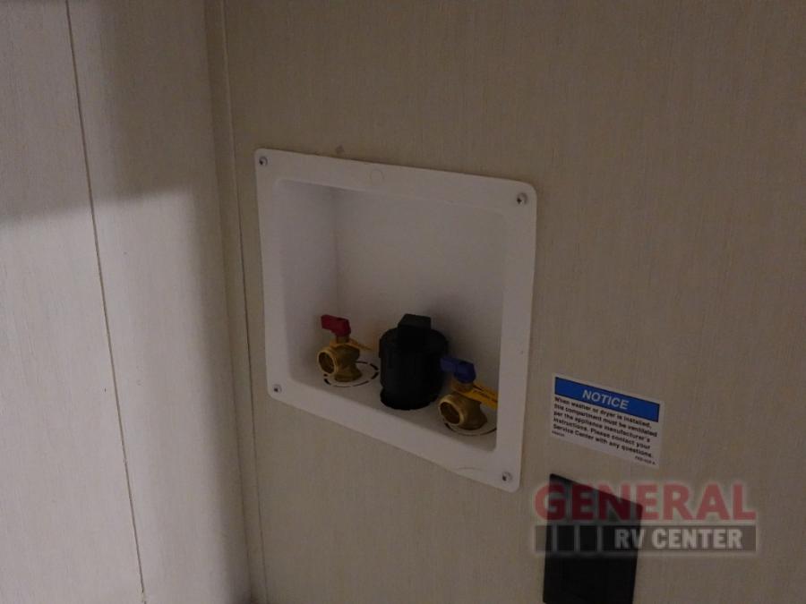 Head to your local state park in this spacious travel trailer! Once you arrive at the campground, you can grab a cold drink from the exterior refrigerator, then head inside to make lunch. An L-shaped counter with two stools provides a place to enjoy your morning coffee at, or you may find yourselves on the sofa within the slide out. The pantry and 12V refrigerator is also found here and can hold all your food for the week. You'll feel right at home in the front private bedroom that includes a camp king bed, dual wardrobes, and an overhead cabinet for even more storage. This model also includes washer and dryer prep if you choose to add those appliances!