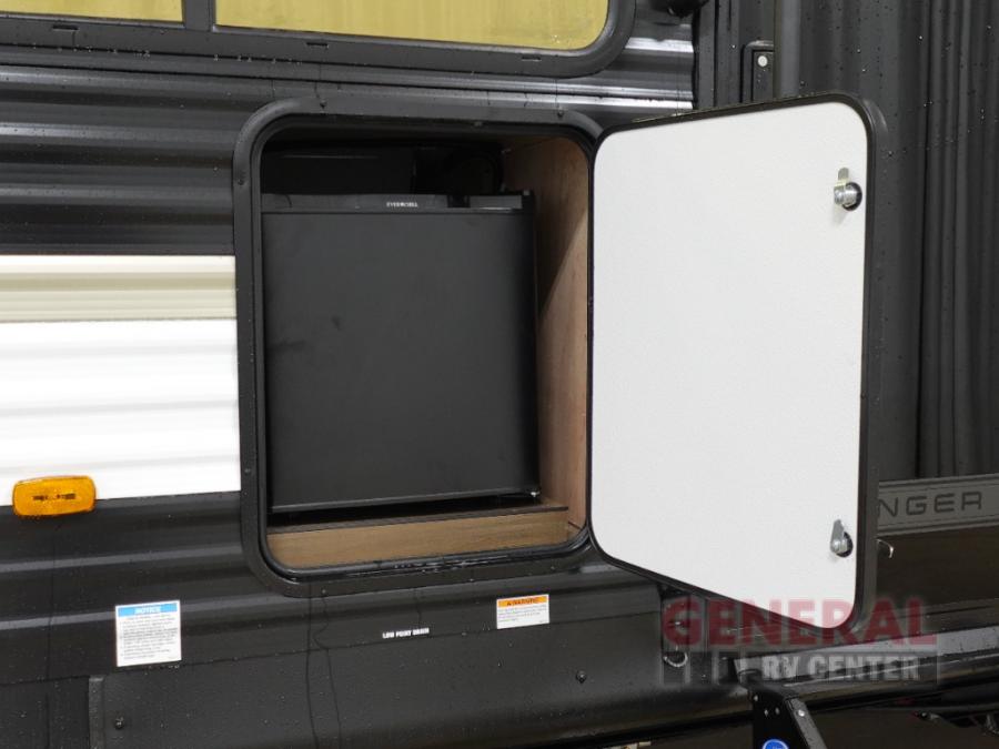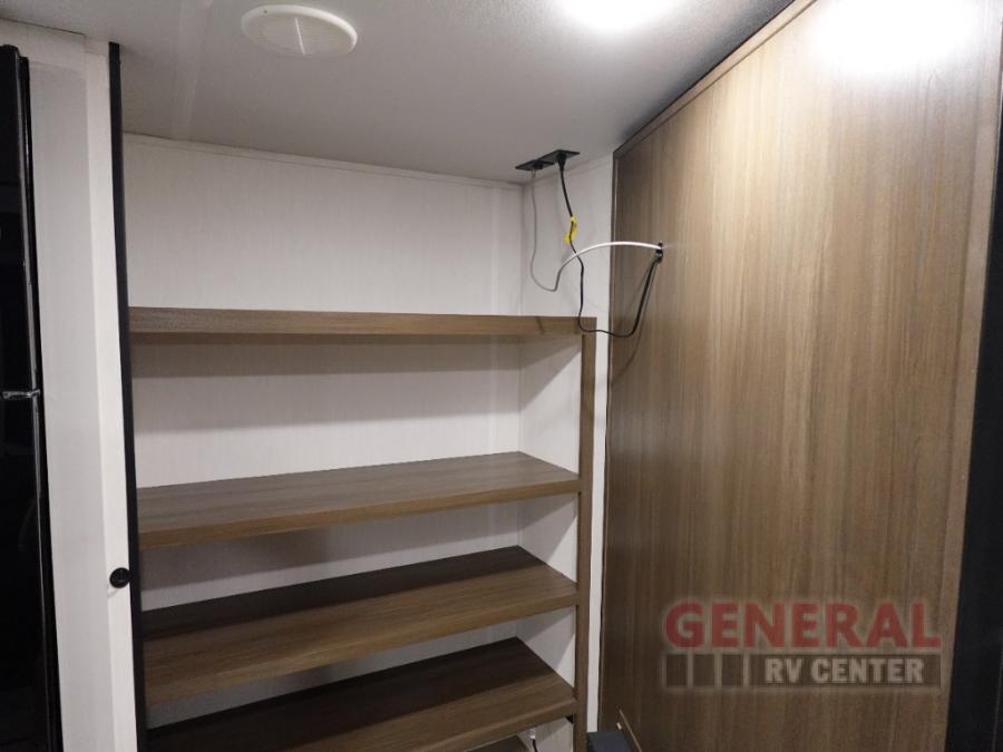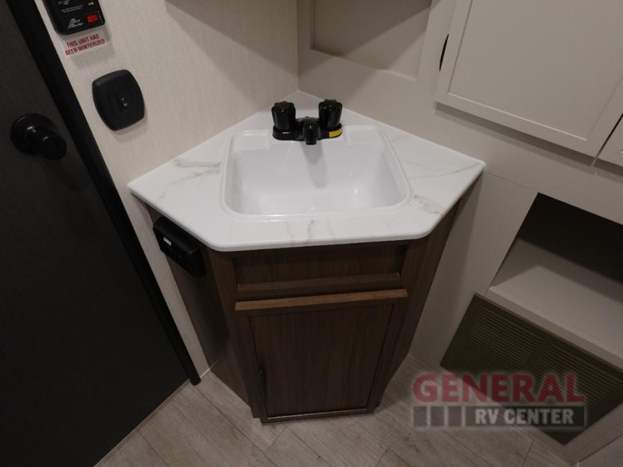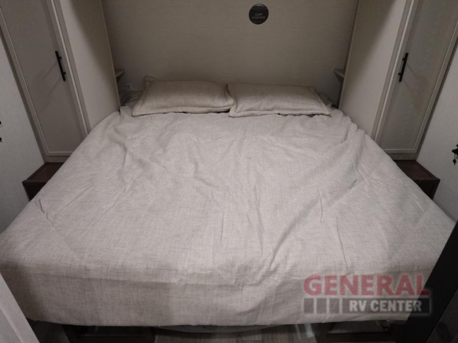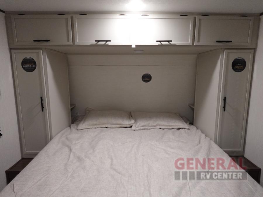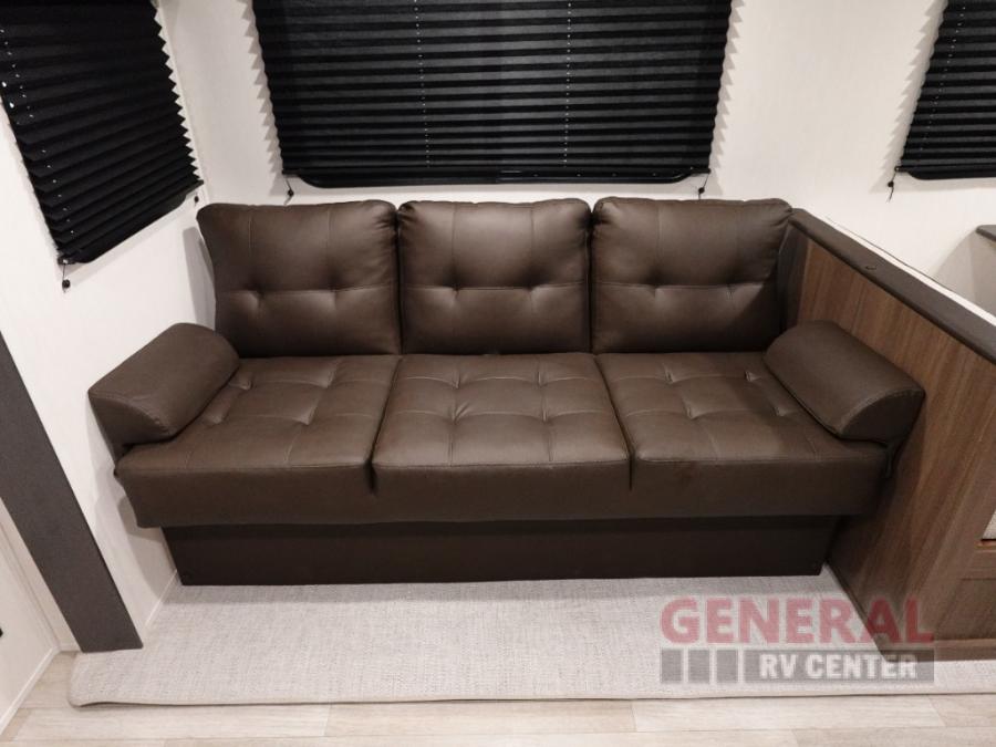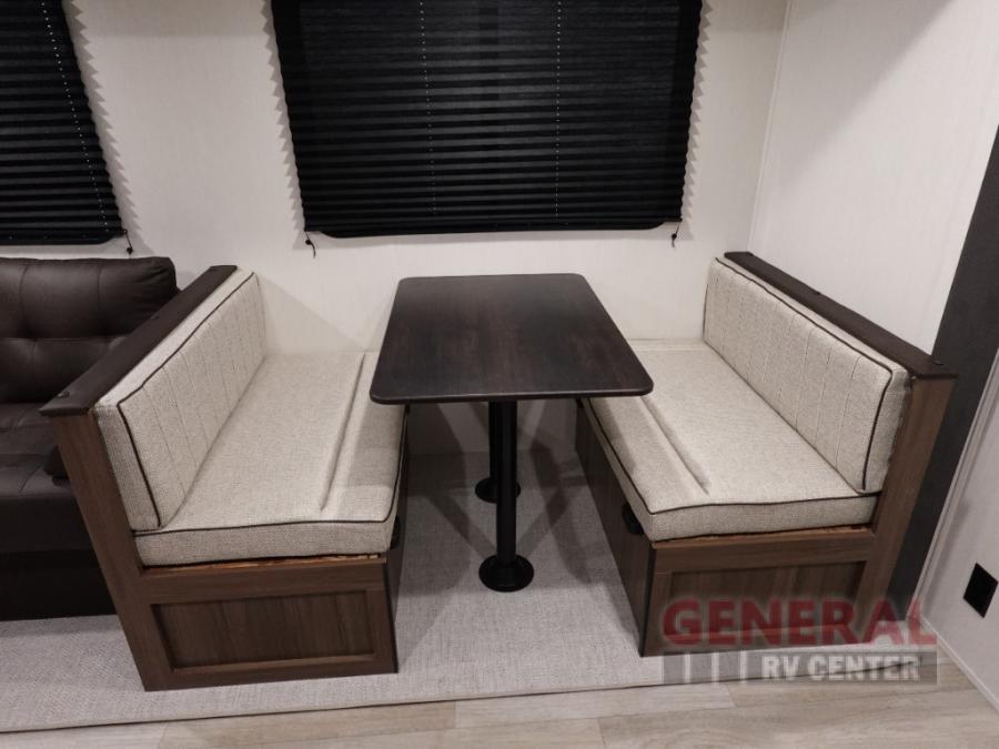 You'll appreciate the added space in this travel trailer thanks to the large slide out!  The booth dinette and sofa are found here, and there is a moveable storage ottoman for extra blankets or board games. You'll have your own space up front in the private bedroom, complete with a camp king bed and storage for your things. The chef of your group will find a three burner cooktop and a built-in convection microwave with an air fryer to cook meals, plus there is a 12V refrigerator and hidden pantry for food storage. This unit also includes a power awning outdoors and an outside refrigerator to keep cold drinks close by.
