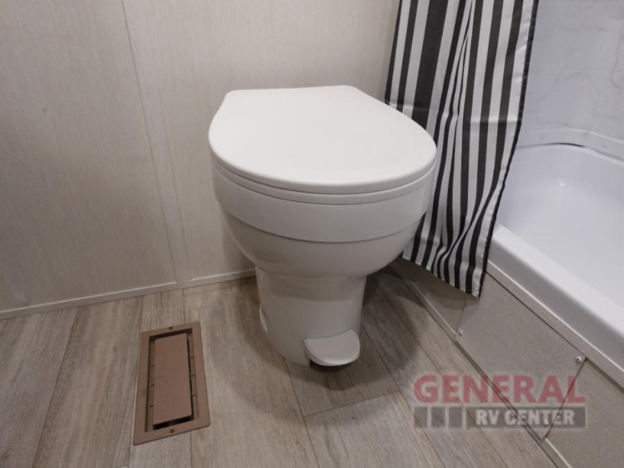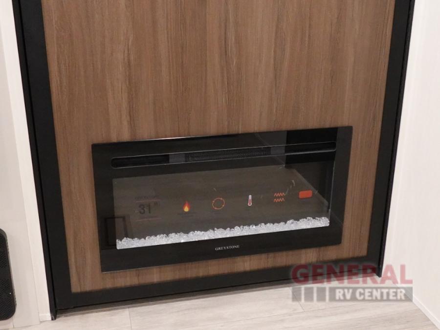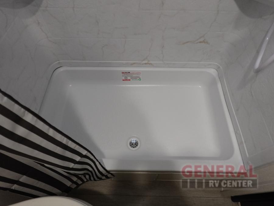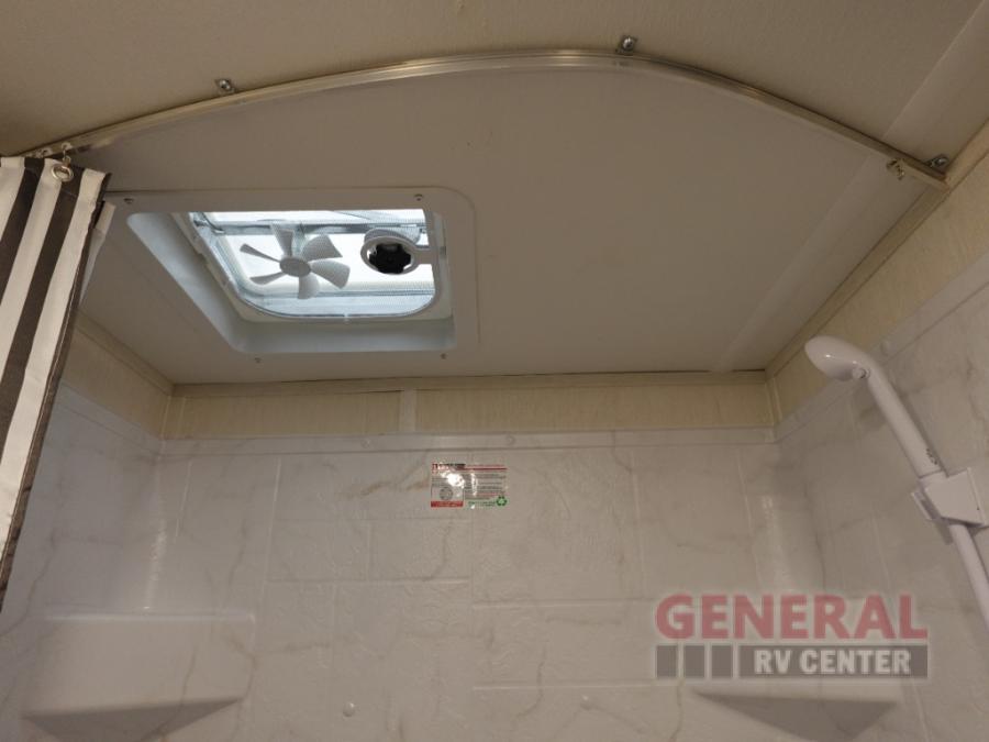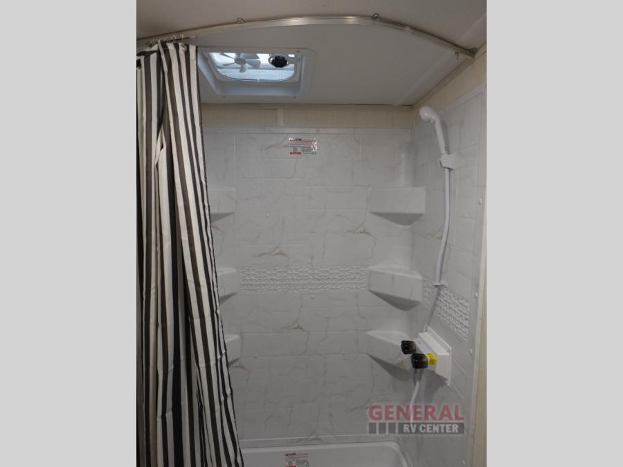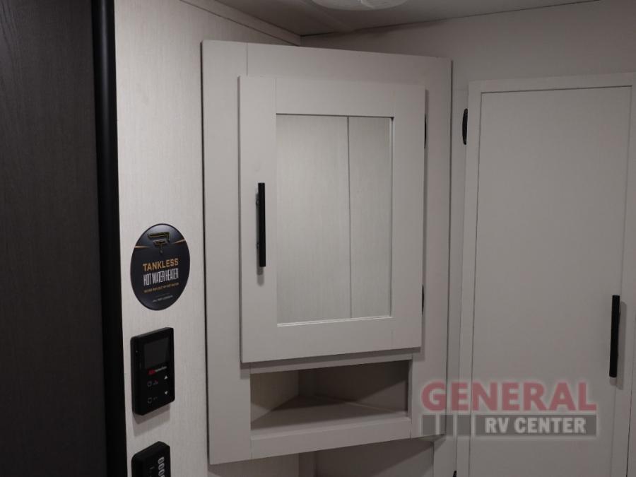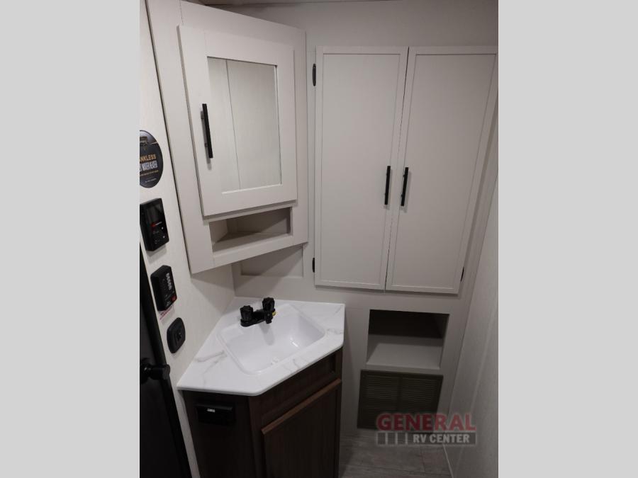 You'll appreciate the added space in this travel trailer thanks to the large slide out!  The booth dinette and sofa are found here, and there is a moveable storage ottoman for extra blankets or board games. You'll have your own space up front in the private bedroom, complete with a camp king bed and storage for your things. The chef of your group will find a three burner cooktop and a built-in convection microwave with an air fryer to cook meals, plus there is a 12V refrigerator and hidden pantry for food storage. This unit also includes a power awning outdoors and an outside refrigerator to keep cold drinks close by.