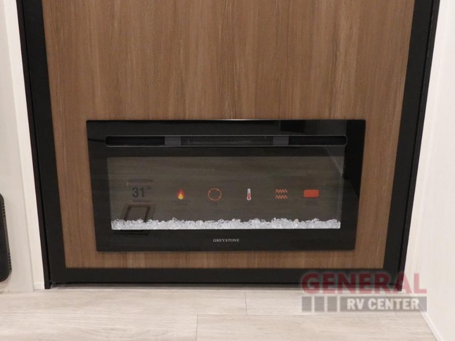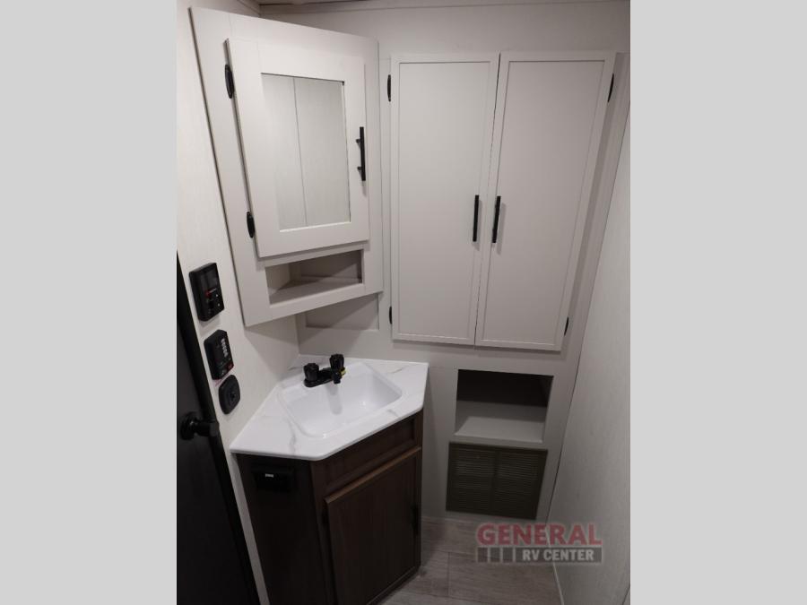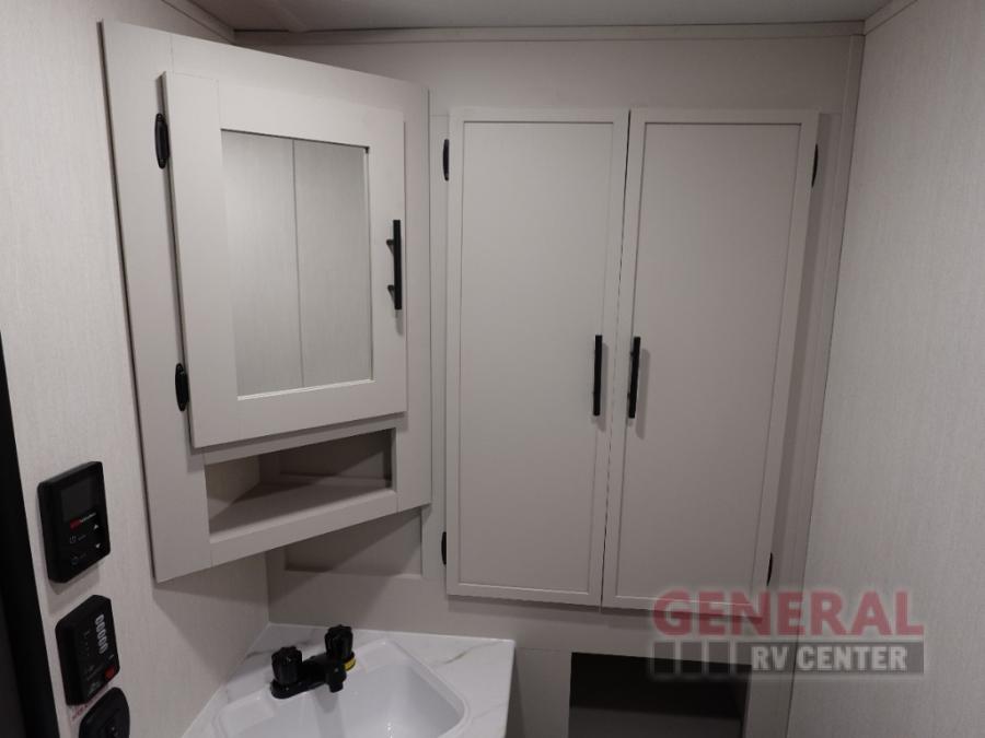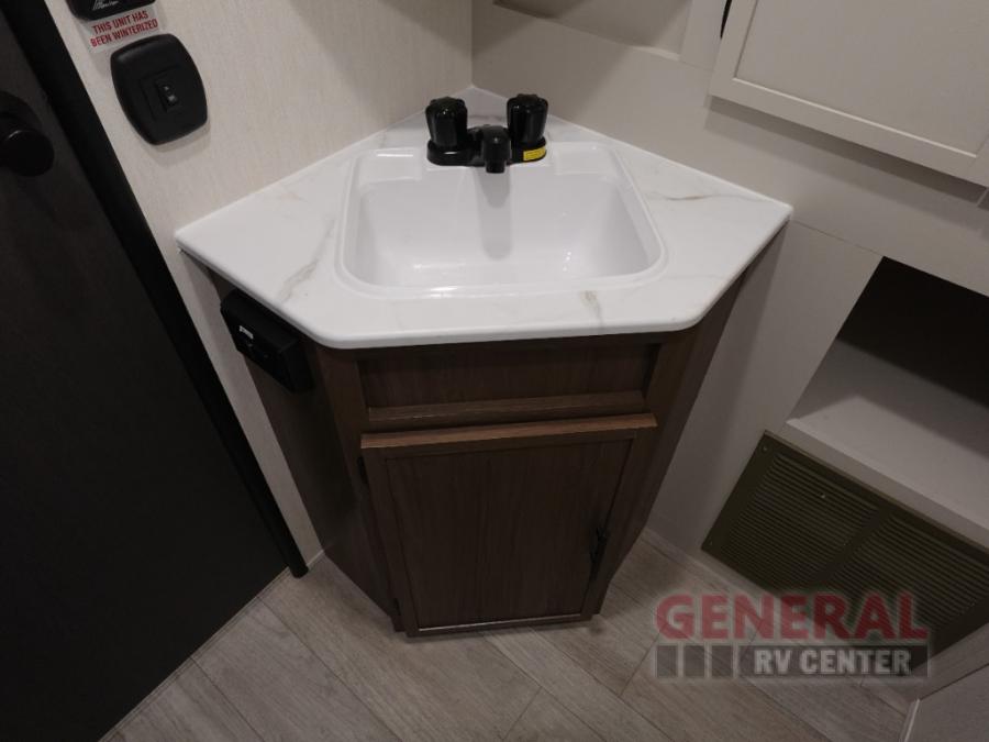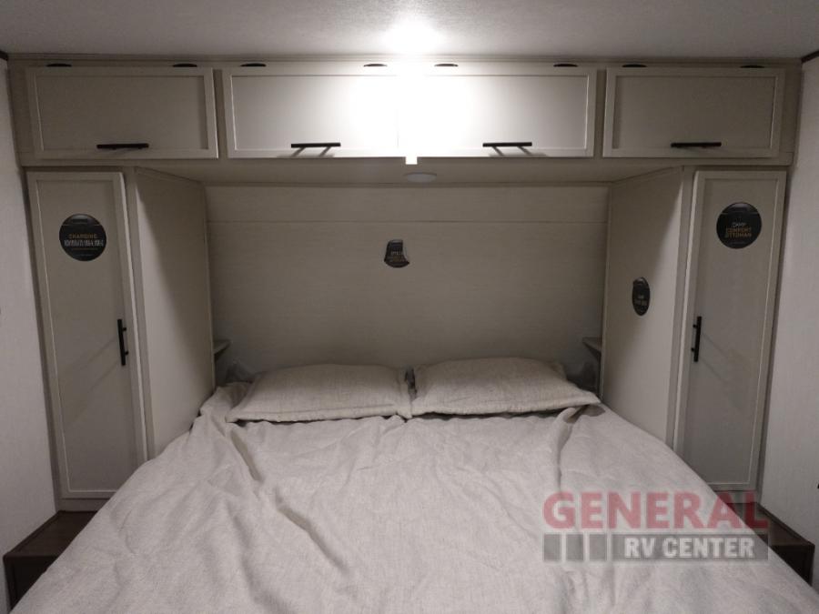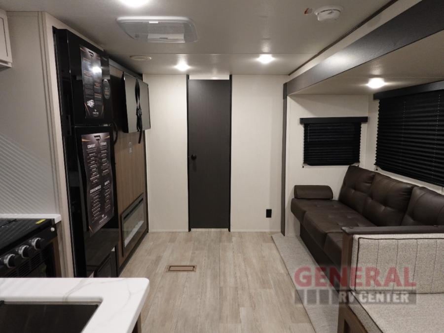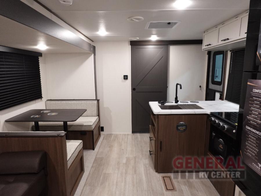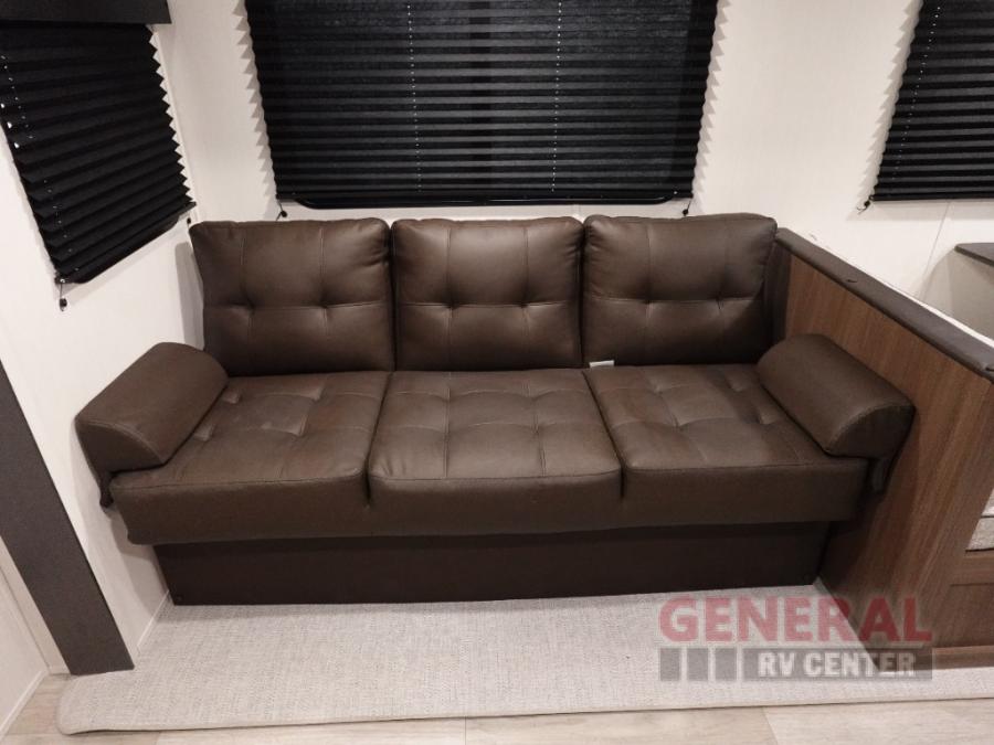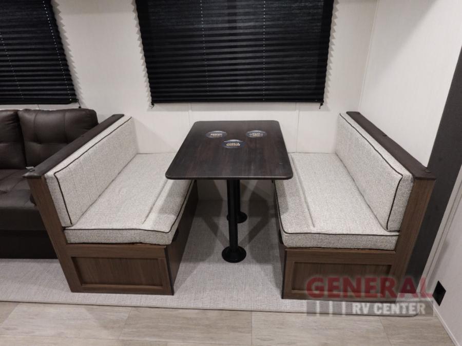 You'll appreciate the added space in this travel trailer thanks to the large slide out!  The booth dinette and sofa are found here, and there is a moveable storage ottoman for extra blankets or board games. You'll have your own space up front in the private bedroom, complete with a camp king bed and storage for your things. The chef of your group will find a three burner cooktop and a built-in convection microwave with an air fryer to cook meals, plus there is a 12V refrigerator and hidden pantry for food storage. This unit also includes a power awning outdoors and an outside refrigerator to keep cold drinks close by.