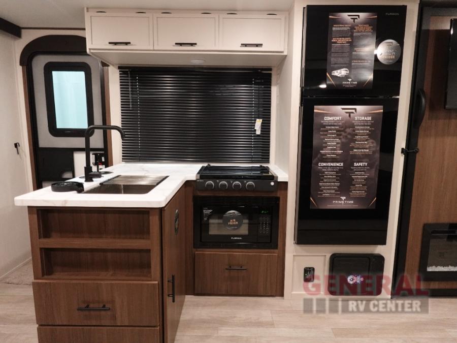 With any Avenger travel trailer by Prime Time RV, you will find innovation, a solid build, and comfort at every turn. Each model is built with Tuff Coat on the exterior metal, a fully enclosed underbelly, and a PVC roof membrane to help extend the life of your trailer. You will also find automotive name badging on the exterior, along with an exterior shower, front rail LED light strips, plus an XL padded entry grab handle to name a few conveniences. There are plenty of storage spaces inside, as well as Congoleum flooring and woven PVC marine grade slide out flooring, a designer shower surround, and seamless pressed countertops. You are sure to appreciate the onboard water filtration system, tankless water heater, plus 30K BTU furnace and 15K ducted A/C to help keep you comfortable.