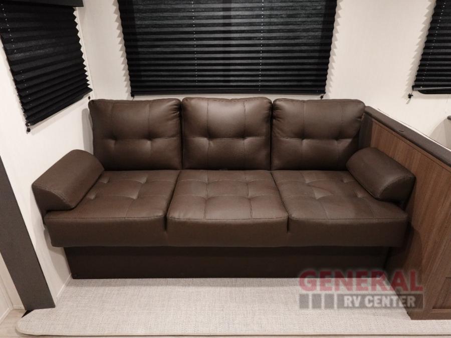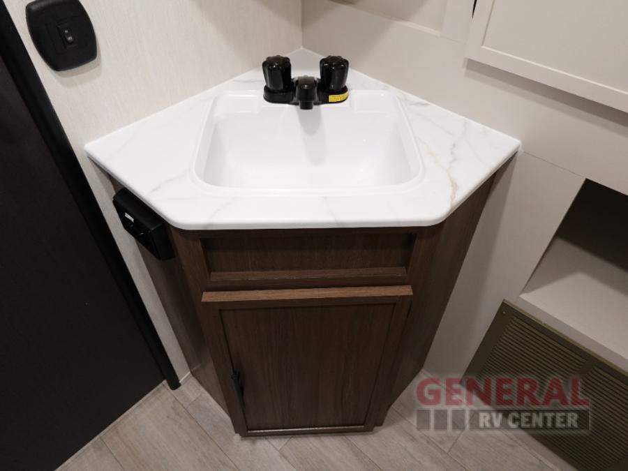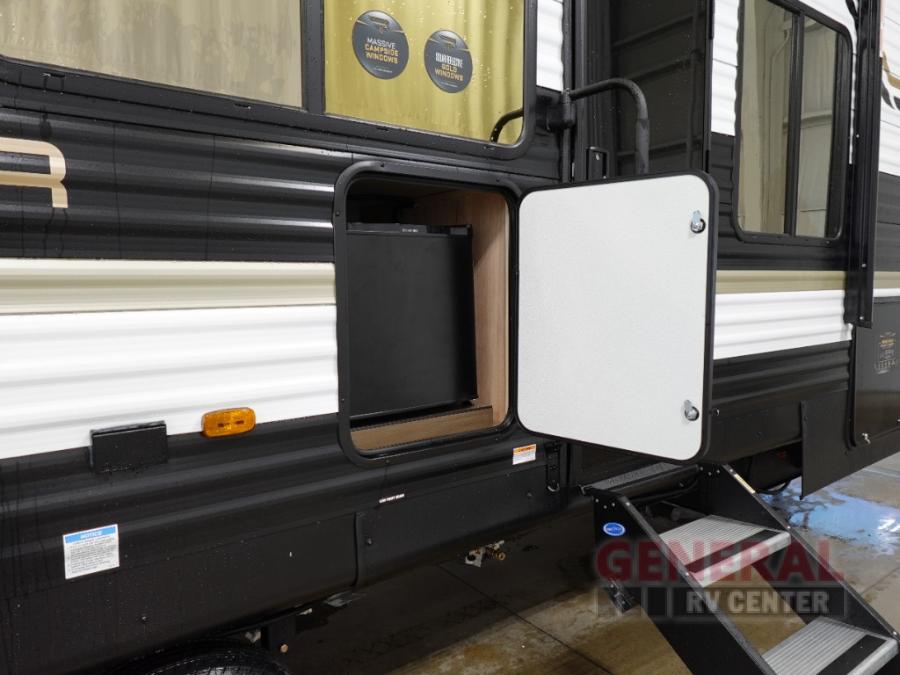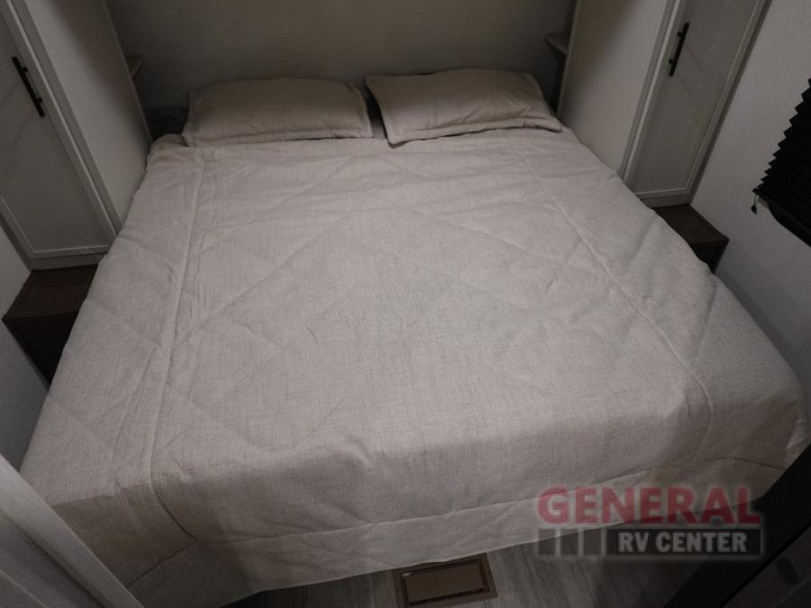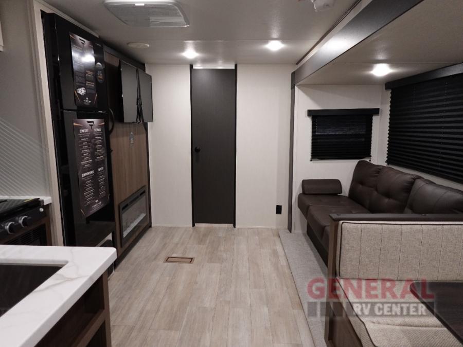 You'll appreciate the added space in this travel trailer thanks to the large slide out!  The booth dinette and sofa are found here, and there is a moveable storage ottoman for extra blankets or board games. You'll have your own space up front in the private bedroom, complete with a camp king bed and storage for your things. The chef of your group will find a three burner cooktop and a built-in convection microwave with an air fryer to cook meals, plus there is a 12V refrigerator and hidden pantry for food storage. This unit also includes a power awning outdoors and an outside refrigerator to keep cold drinks close by.