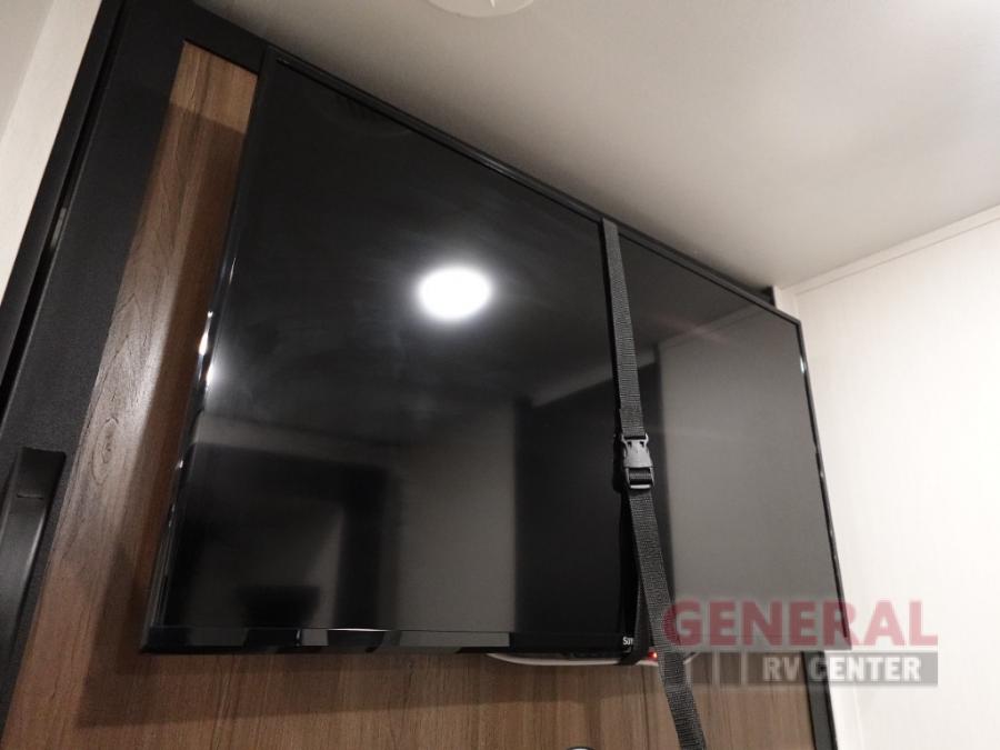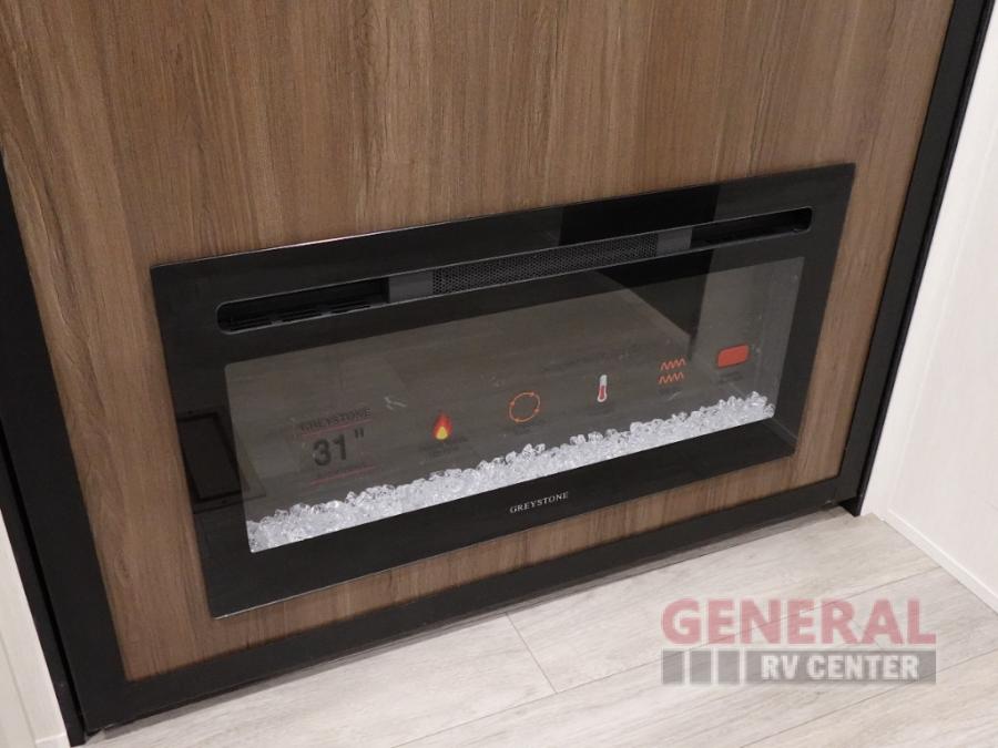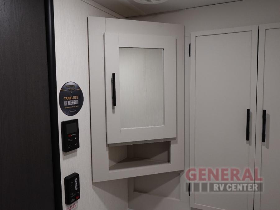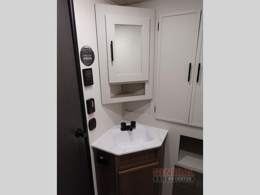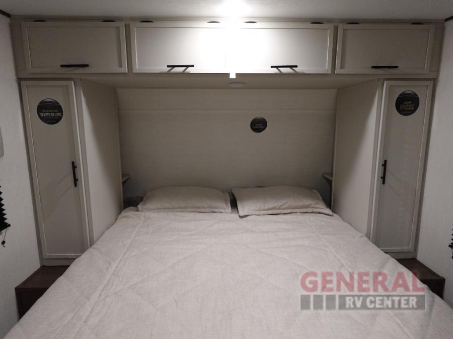 You'll appreciate the added space in this travel trailer thanks to the large slide out!  The booth dinette and sofa are found here, and there is a moveable storage ottoman for extra blankets or board games. You'll have your own space up front in the private bedroom, complete with a camp king bed and storage for your things. The chef of your group will find a three burner cooktop and a built-in convection microwave with an air fryer to cook meals, plus there is a 12V refrigerator and hidden pantry for food storage. This unit also includes a power awning outdoors and an outside refrigerator to keep cold drinks close by.