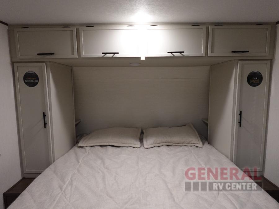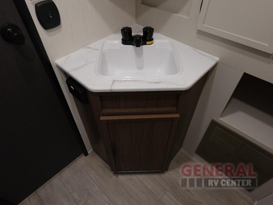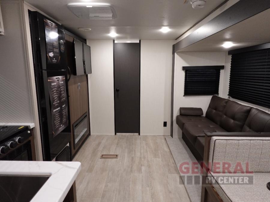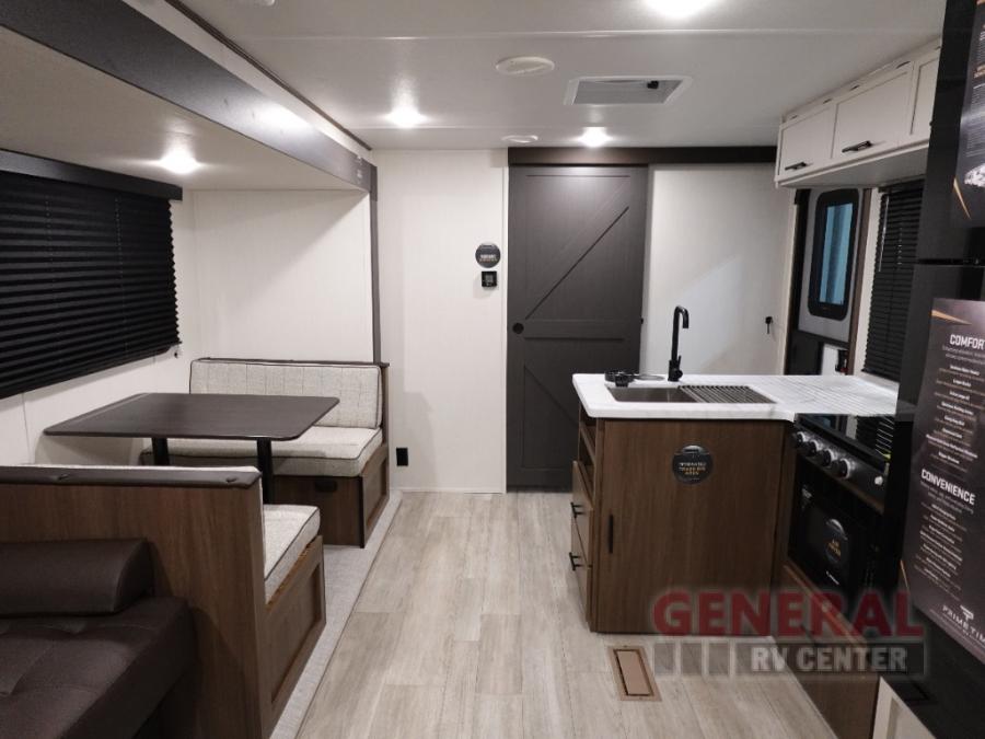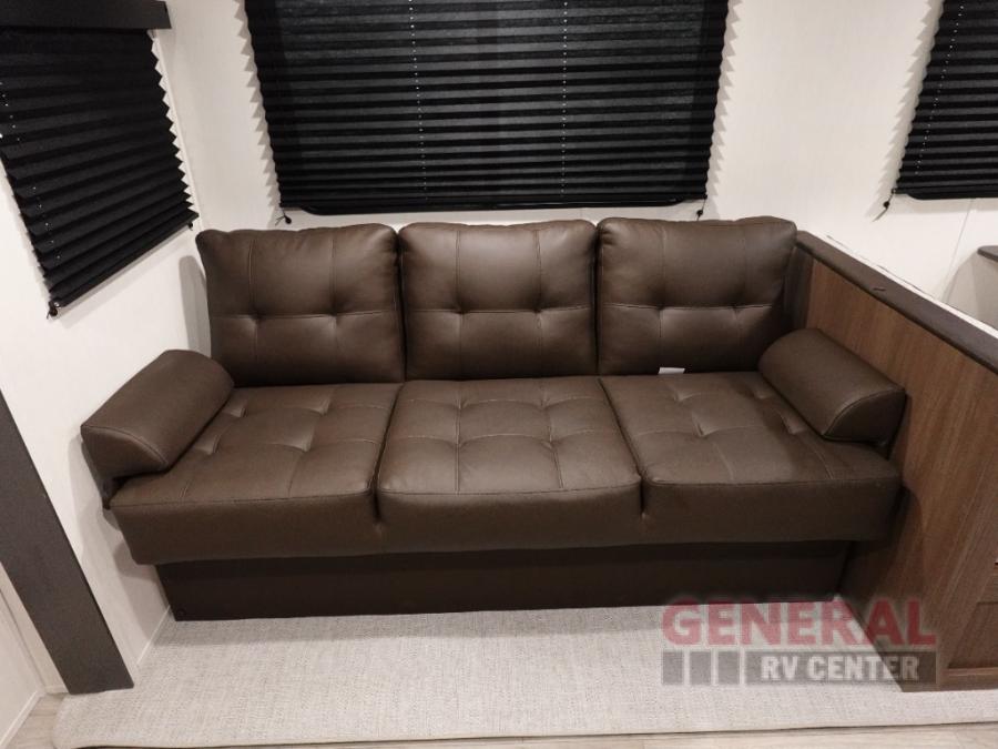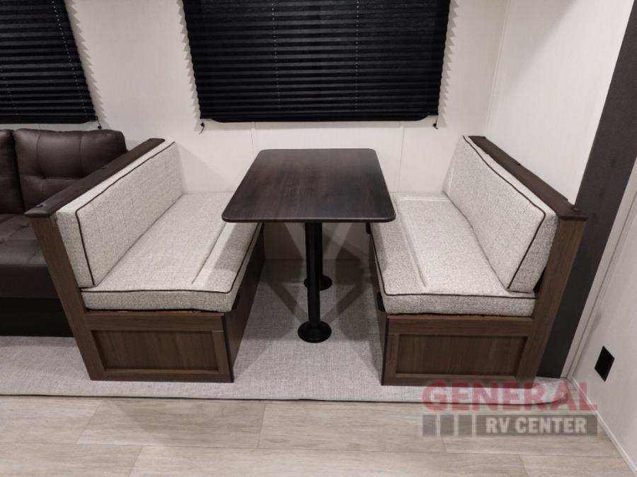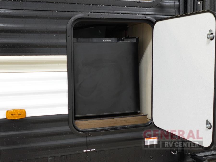 You'll appreciate the added space in this travel trailer thanks to the large slide out!  The booth dinette and sofa are found here, and there is a moveable storage ottoman for extra blankets or board games. You'll have your own space up front in the private bedroom, complete with a camp king bed and storage for your things. The chef of your group will find a three burner cooktop and a built-in convection microwave with an air fryer to cook meals, plus there is a 12V refrigerator and hidden pantry for food storage. This unit also includes a power awning outdoors and an outside refrigerator to keep cold drinks close by.