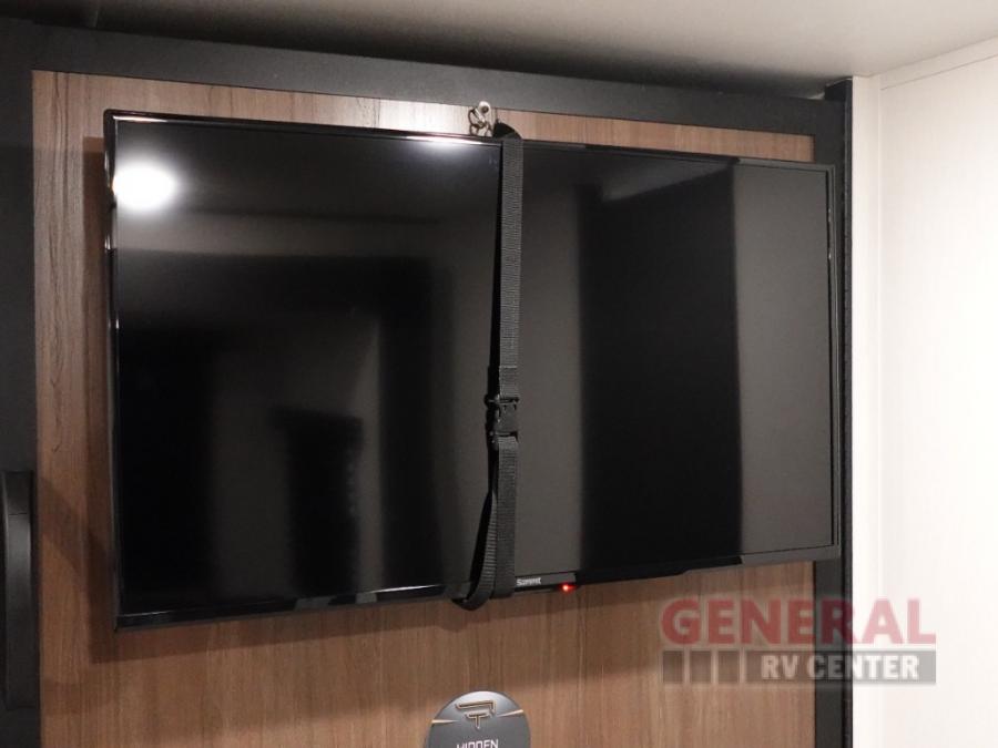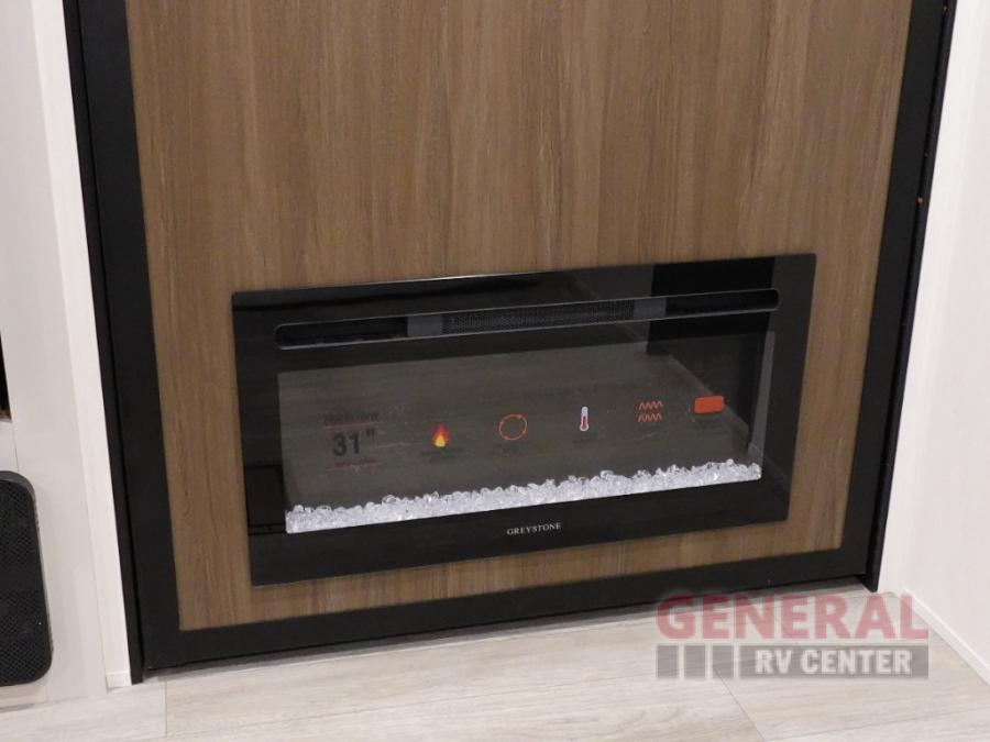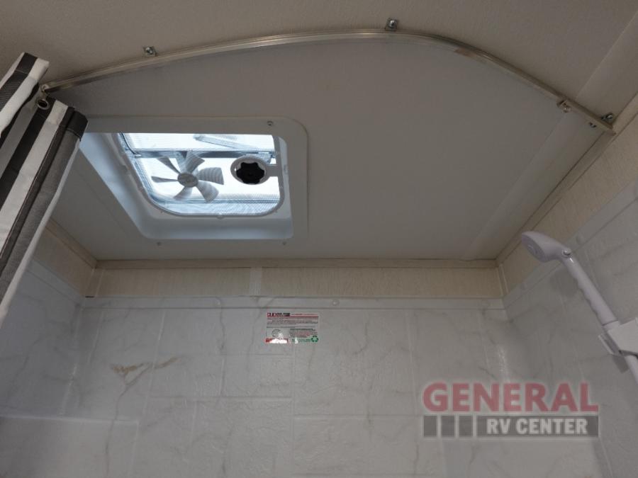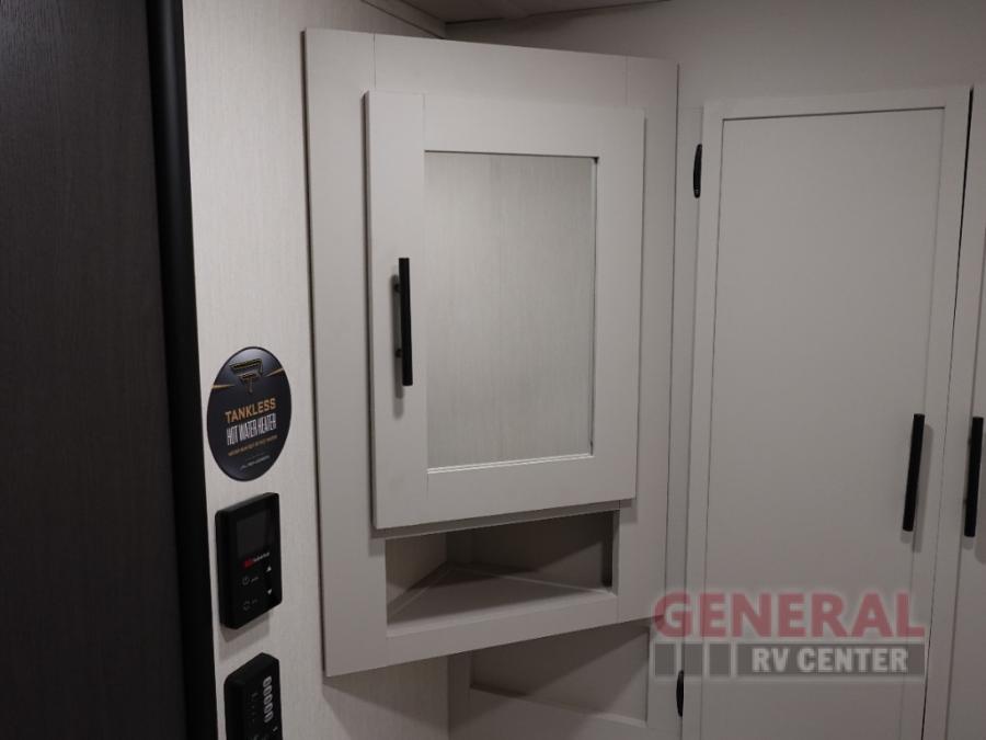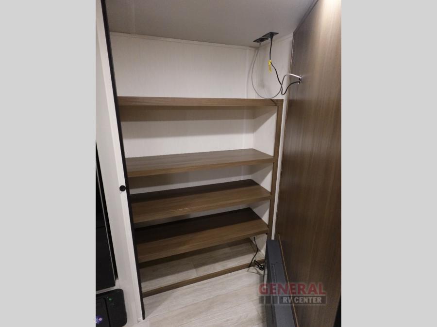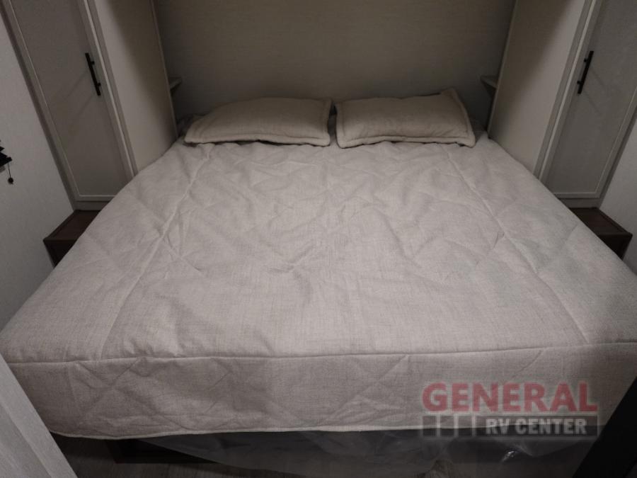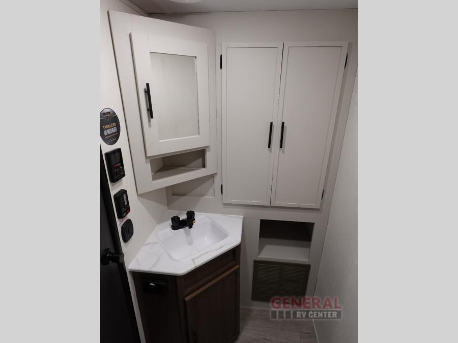 You'll appreciate the added space in this travel trailer thanks to the large slide out!  The booth dinette and sofa are found here, and there is a moveable storage ottoman for extra blankets or board games. You'll have your own space up front in the private bedroom, complete with a camp king bed and storage for your things. The chef of your group will find a three burner cooktop and a built-in convection microwave with an air fryer to cook meals, plus there is a 12V refrigerator and hidden pantry for food storage. This unit also includes a power awning outdoors and an outside refrigerator to keep cold drinks close by.