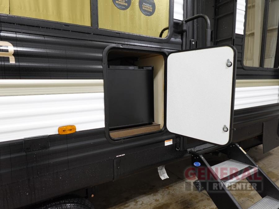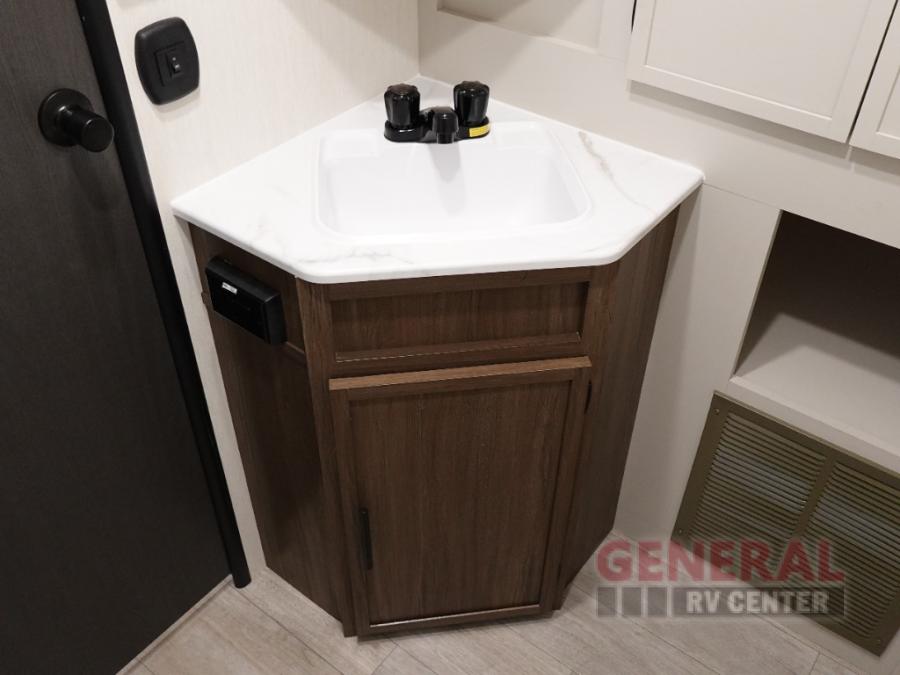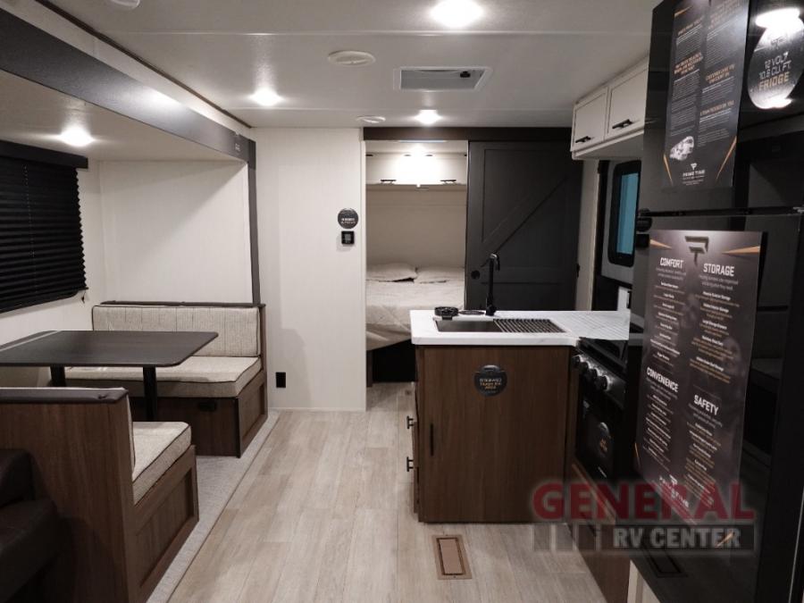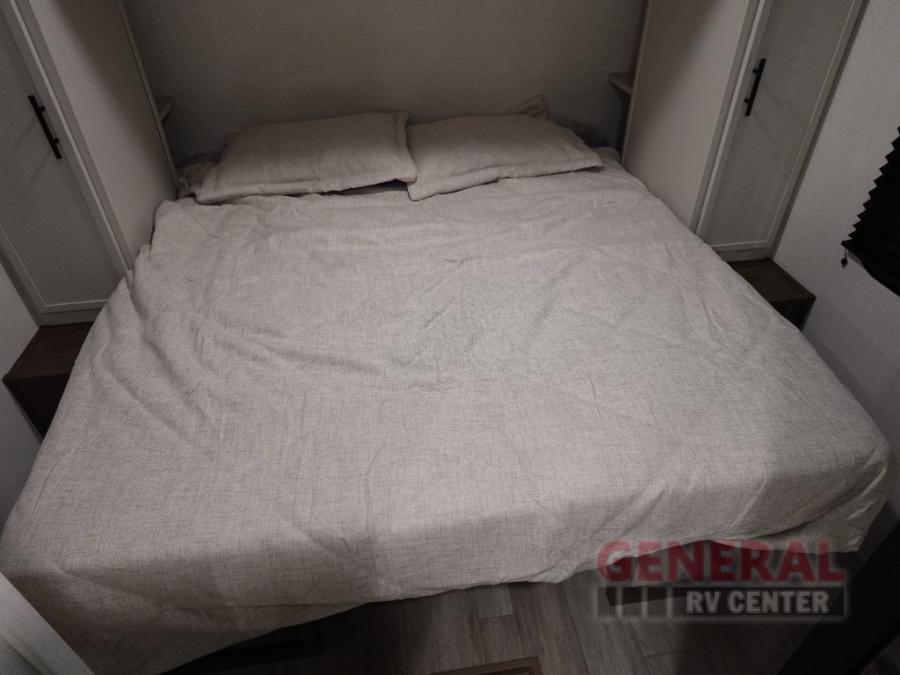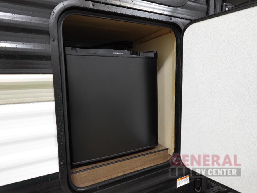 You'll appreciate the added space in this travel trailer thanks to the large slide out!  The booth dinette and sofa are found here, and there is a moveable storage ottoman for extra blankets or board games. You'll have your own space up front in the private bedroom, complete with a camp king bed and storage for your things. The chef of your group will find a three burner cooktop and a built-in convection microwave with an air fryer to cook meals, plus there is a 12V refrigerator and hidden pantry for food storage. This unit also includes a power awning outdoors and an outside refrigerator to keep cold drinks close by.