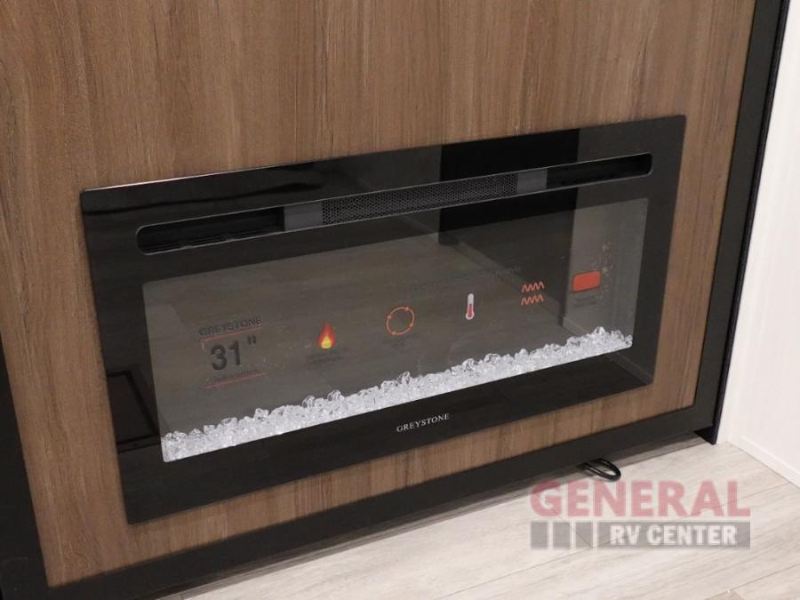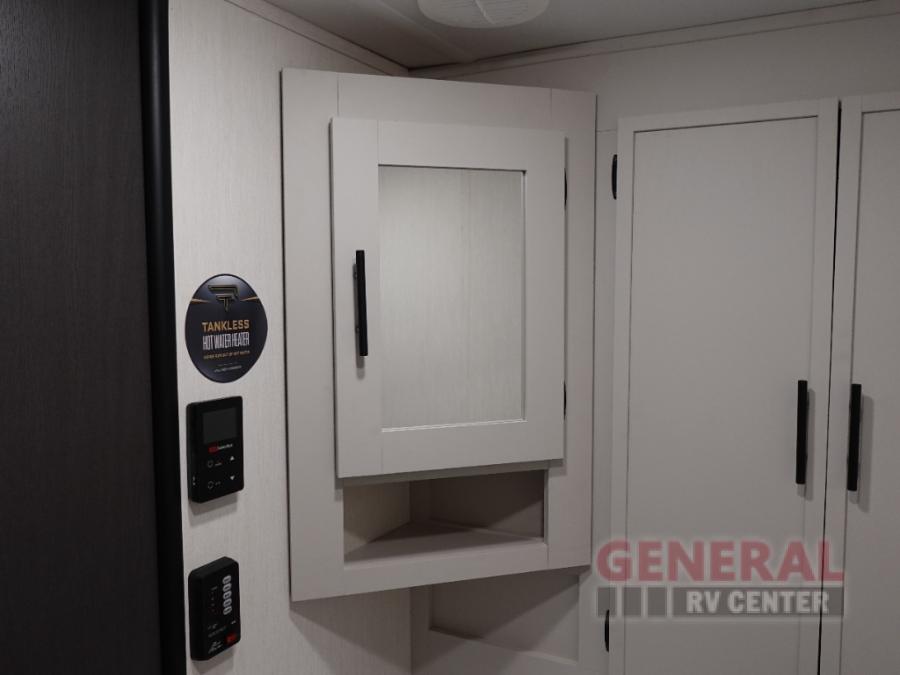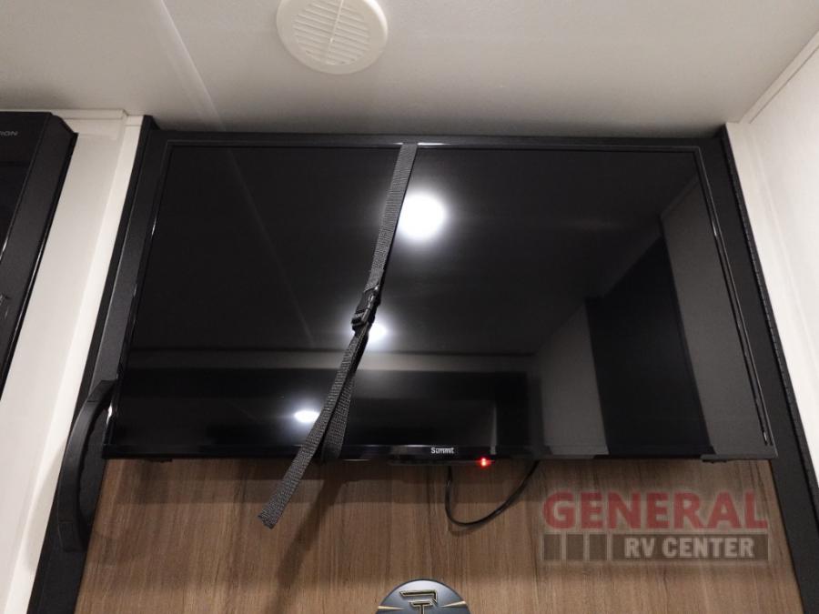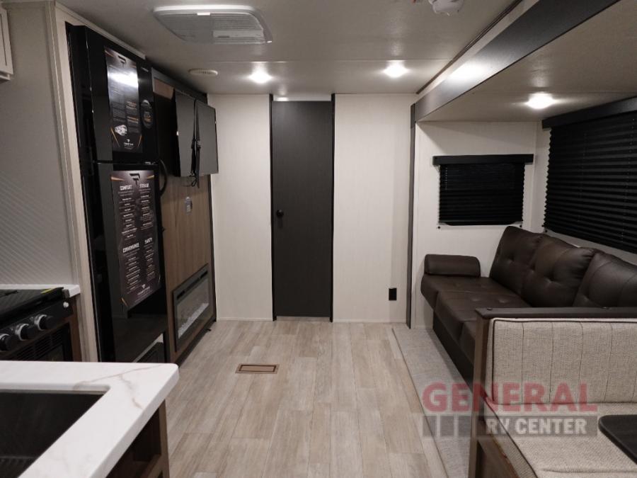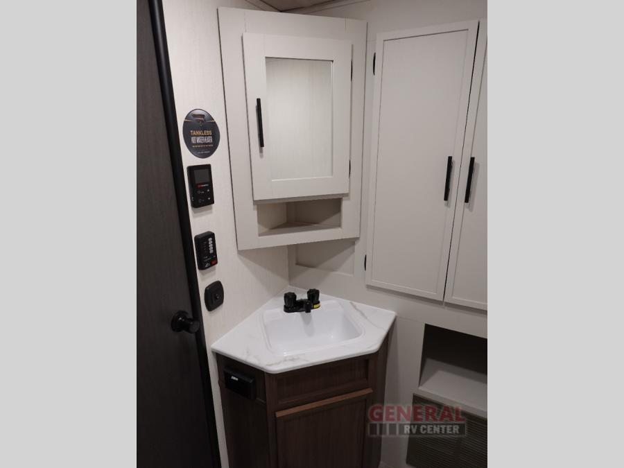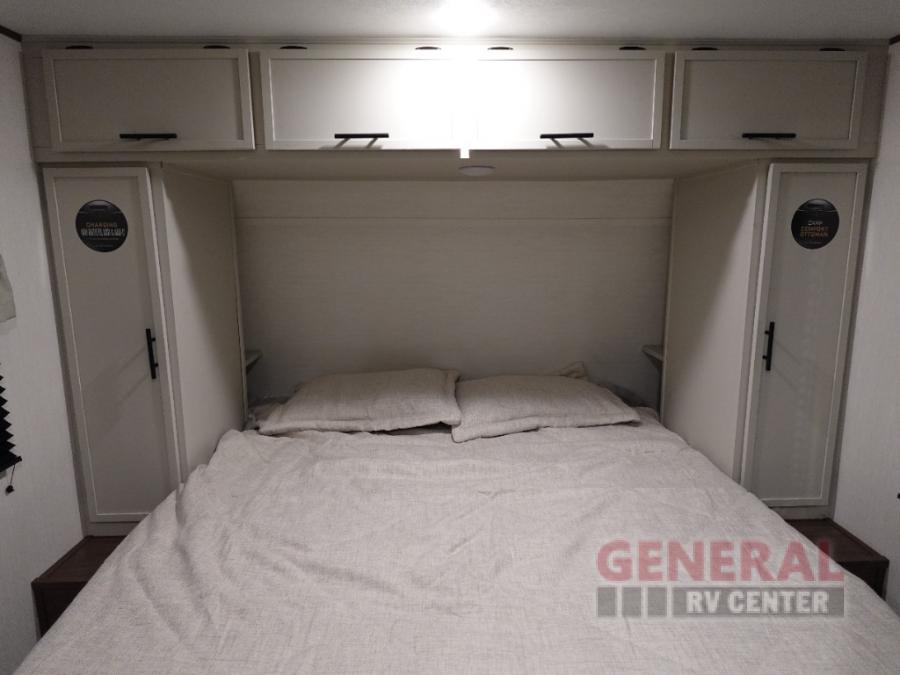 You'll appreciate the added space in this travel trailer thanks to the large slide out!  The booth dinette and sofa are found here, and there is a moveable storage ottoman for extra blankets or board games. You'll have your own space up front in the private bedroom, complete with a camp king bed and storage for your things. The chef of your group will find a three burner cooktop and a built-in convection microwave with an air fryer to cook meals, plus there is a 12V refrigerator and hidden pantry for food storage. This unit also includes a power awning outdoors and an outside refrigerator to keep cold drinks close by.