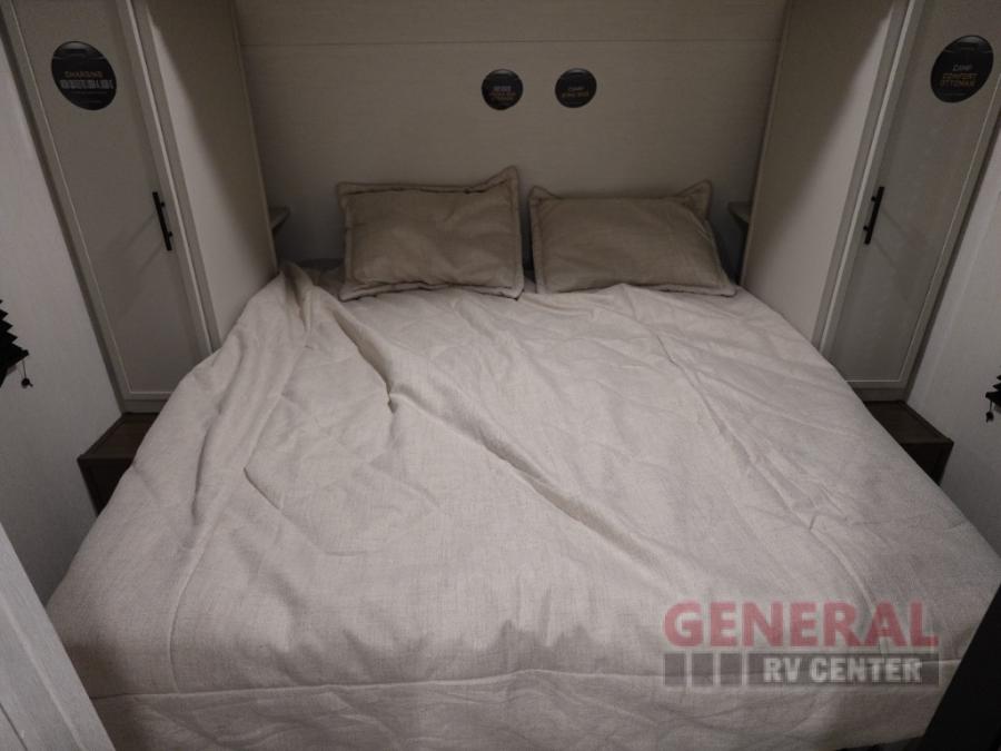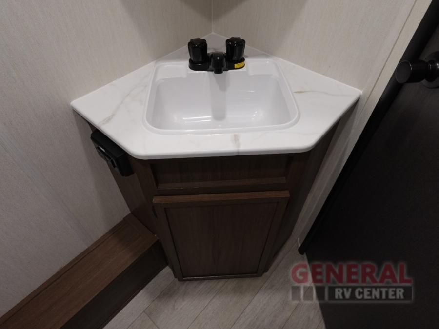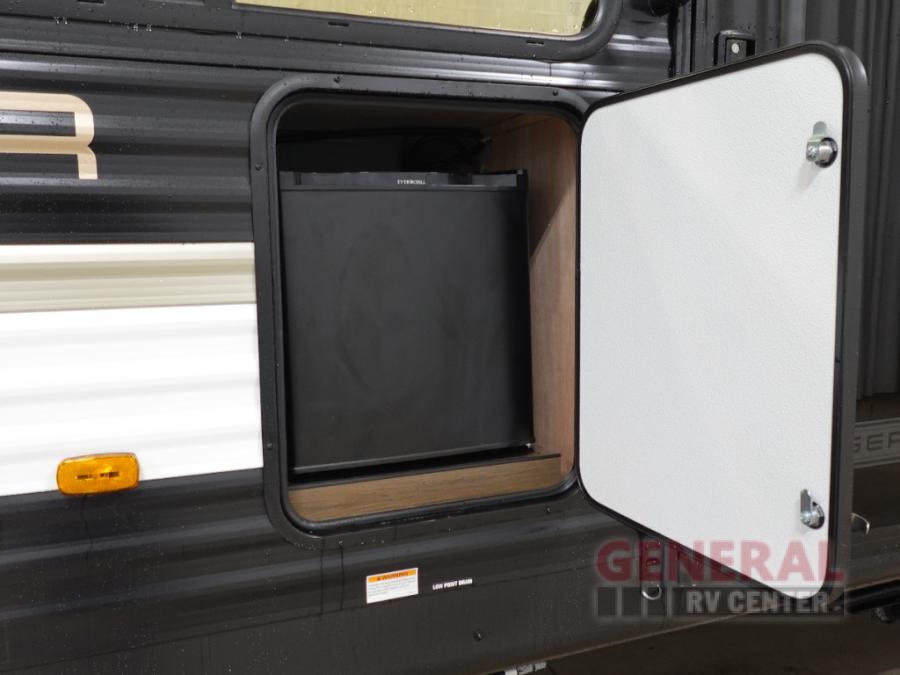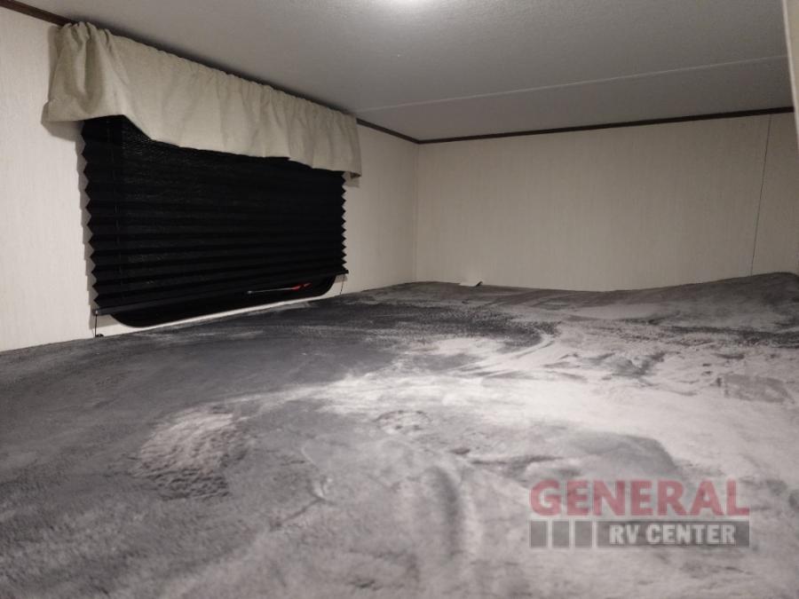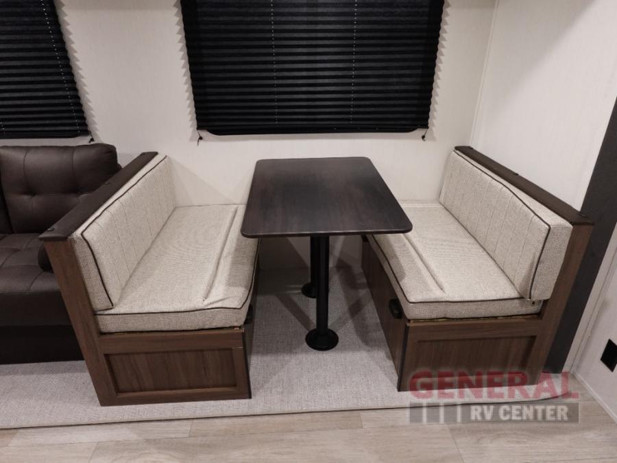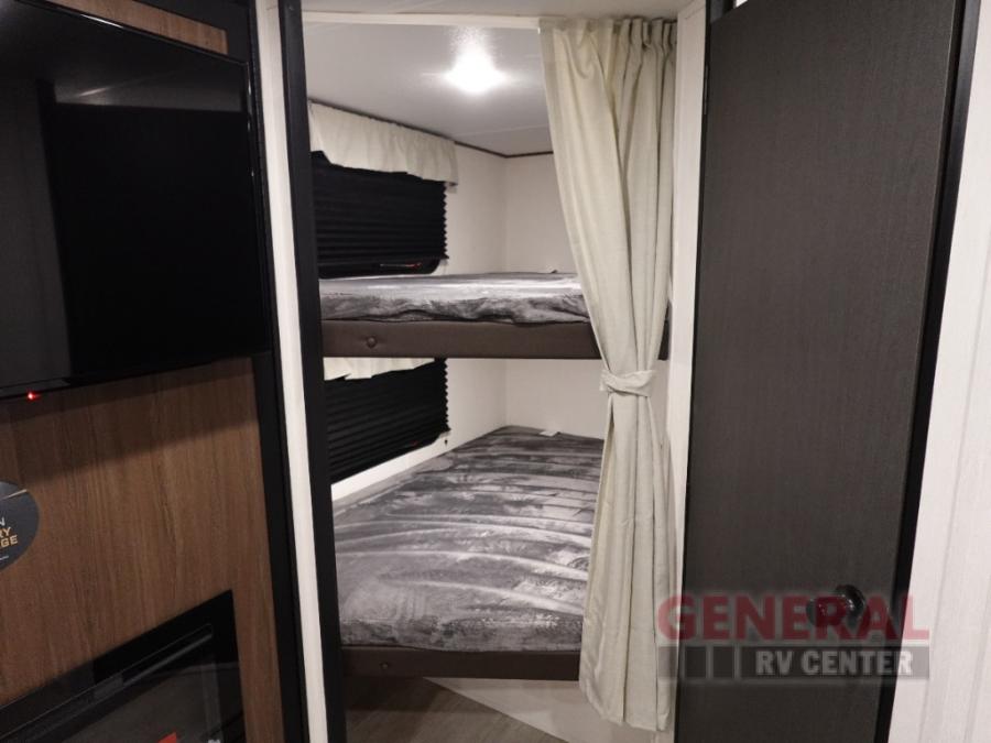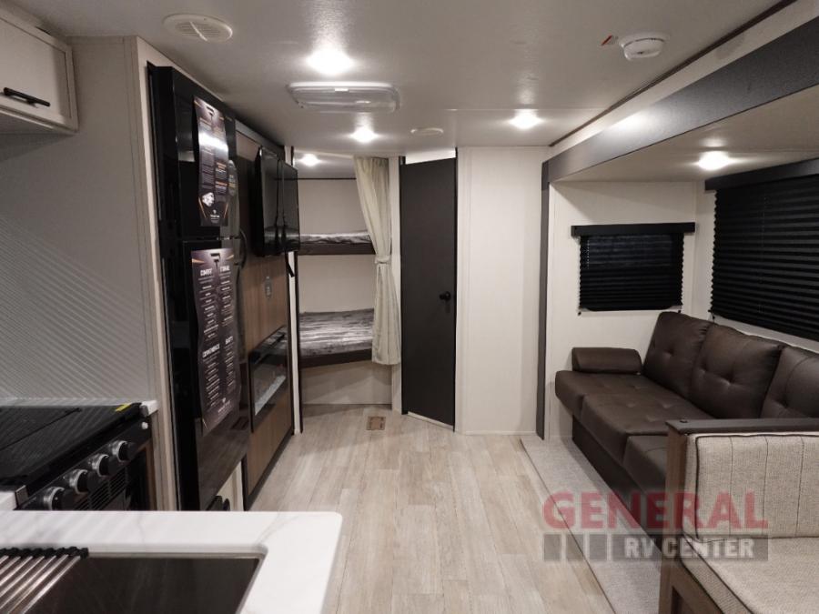 You'll appreciate the added space in this travel trailer thanks to the large slide out! The booth dinette and sofa are found here, and there is a moveable storage ottoman for extra blankets or board games. You'll have your own space up front in the private bedroom, complete with a camp king bed and storage for your things, while your guests take the double-size bunk beds towards the back. The chef of your group will find a three burner cooktop and a built-in convection microwave with an air fryer to cook meals, plus there is a 12V refrigerator and large hidden pantry for food storage. This unit also includes a power awning outdoors and an outside refrigerator to keep cold drinks close by.