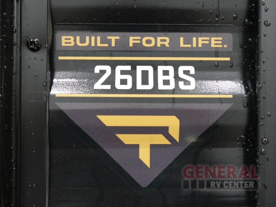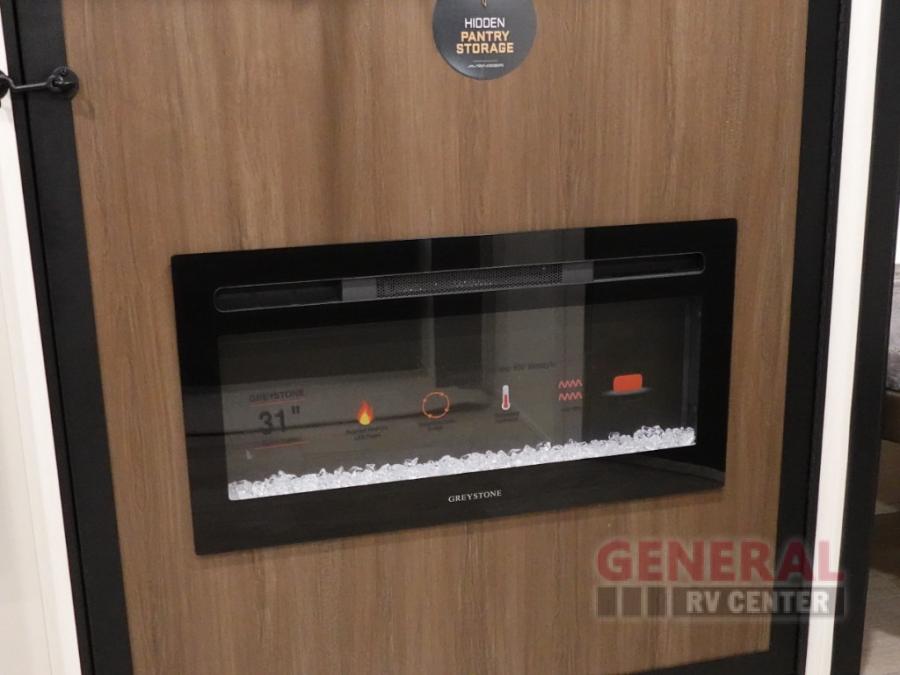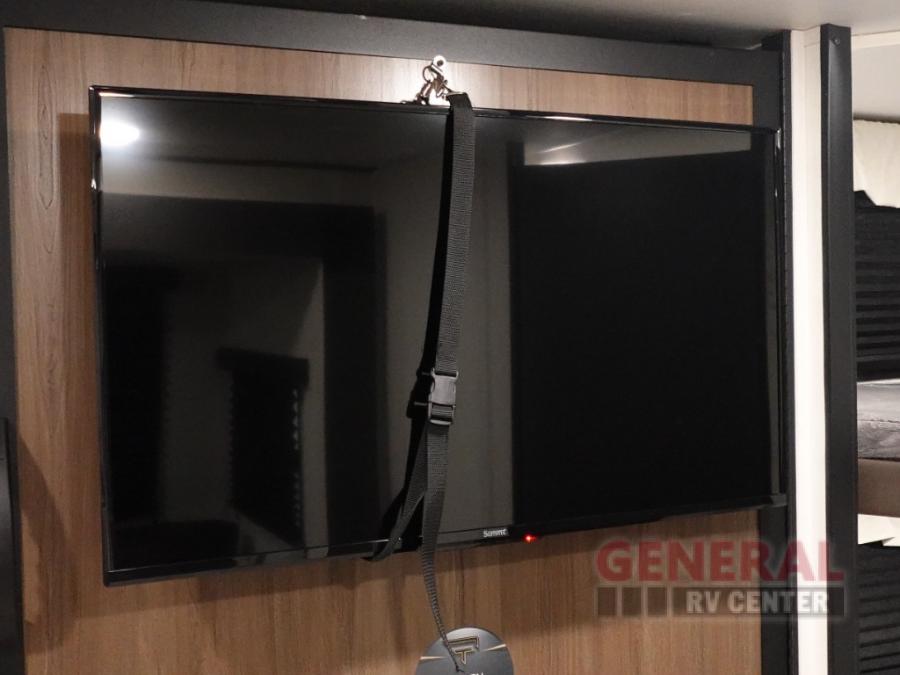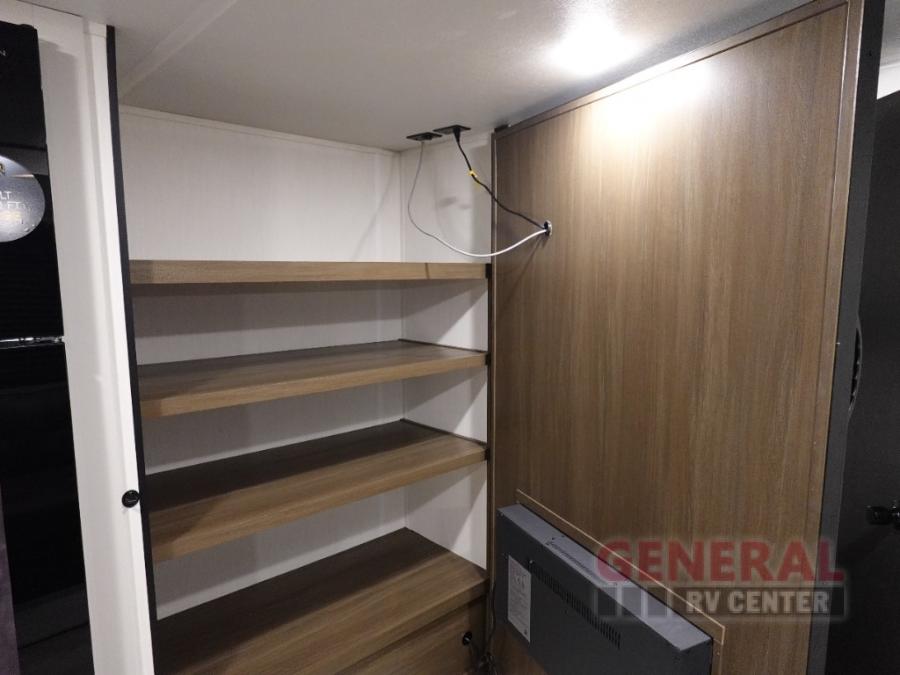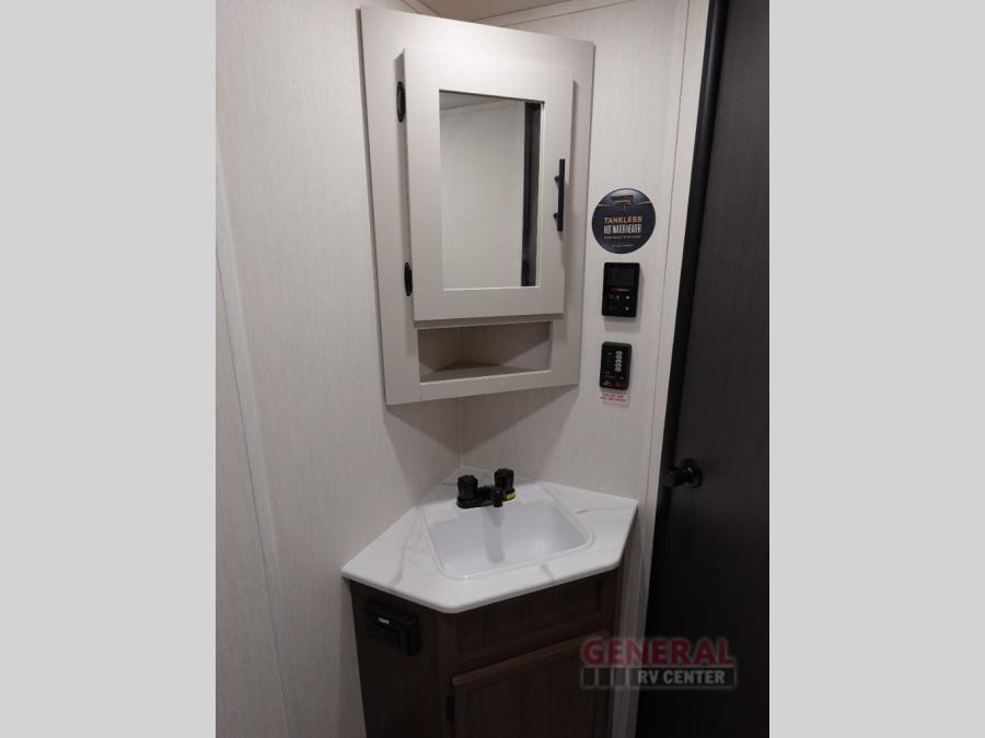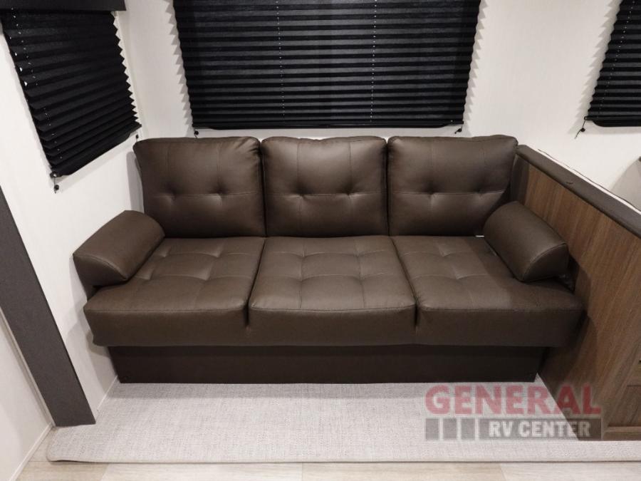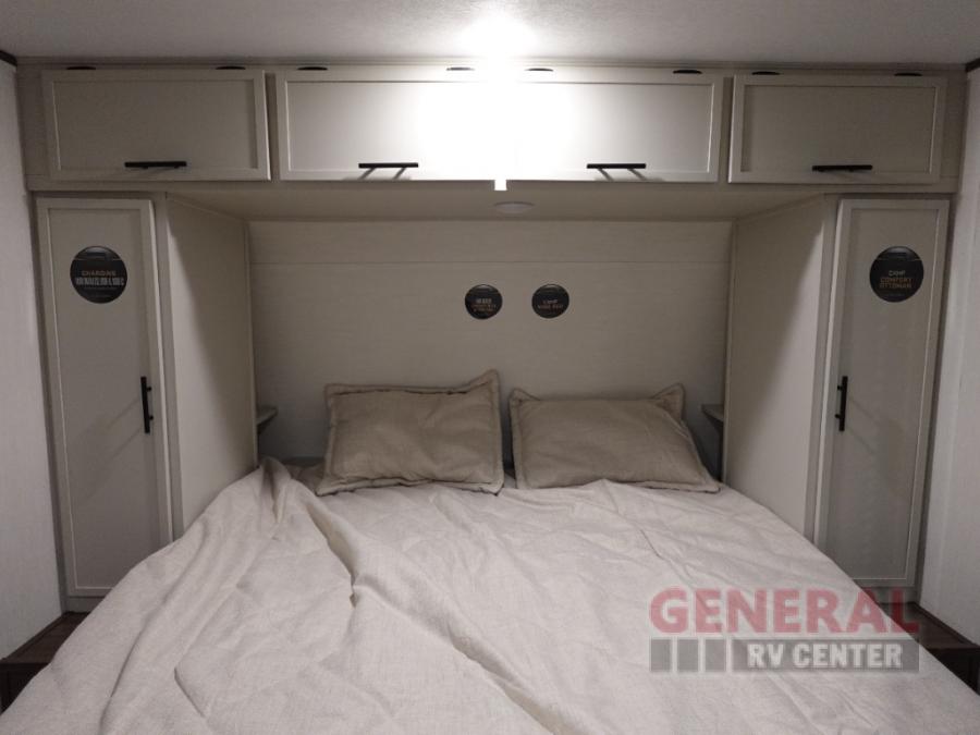 You'll appreciate the added space in this travel trailer thanks to the large slide out! The booth dinette and sofa are found here, and there is a moveable storage ottoman for extra blankets or board games. You'll have your own space up front in the private bedroom, complete with a camp king bed and storage for your things, while your guests take the double-size bunk beds towards the back. The chef of your group will find a three burner cooktop and a built-in convection microwave with an air fryer to cook meals, plus there is a 12V refrigerator and large hidden pantry for food storage. This unit also includes a power awning outdoors and an outside refrigerator to keep cold drinks close by.