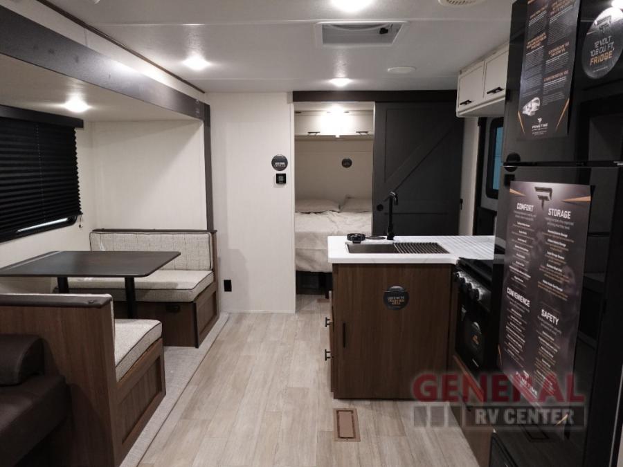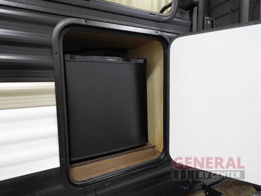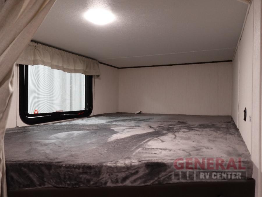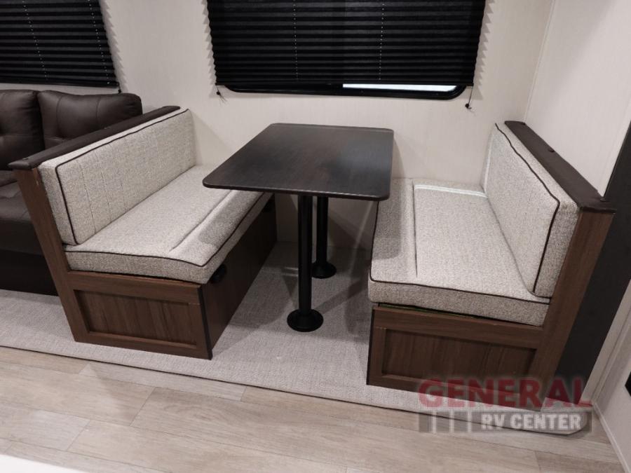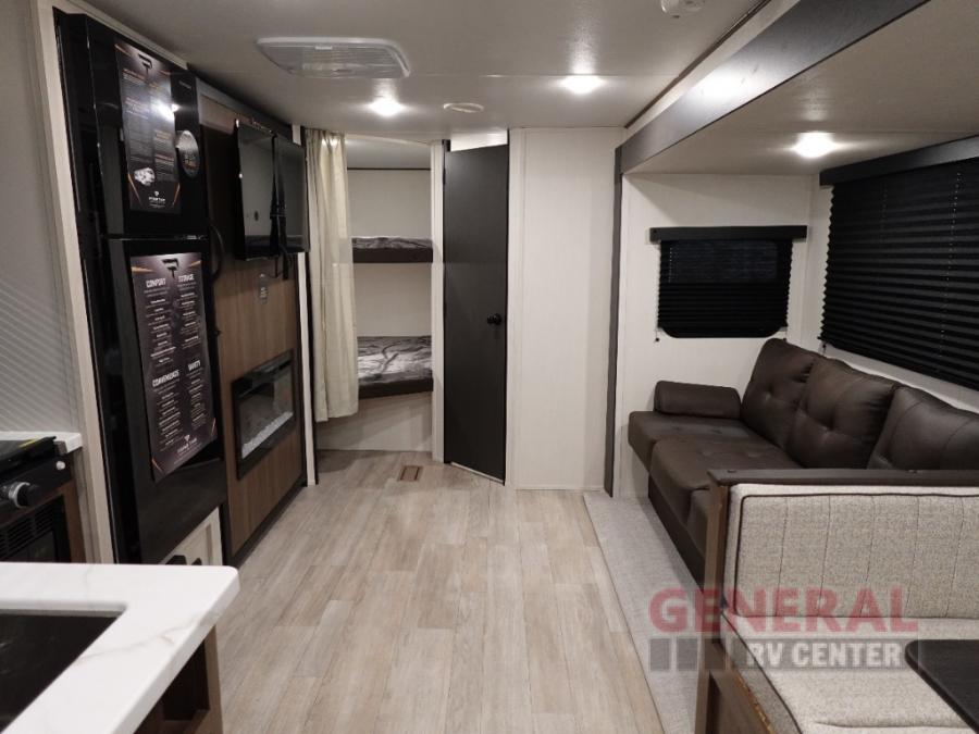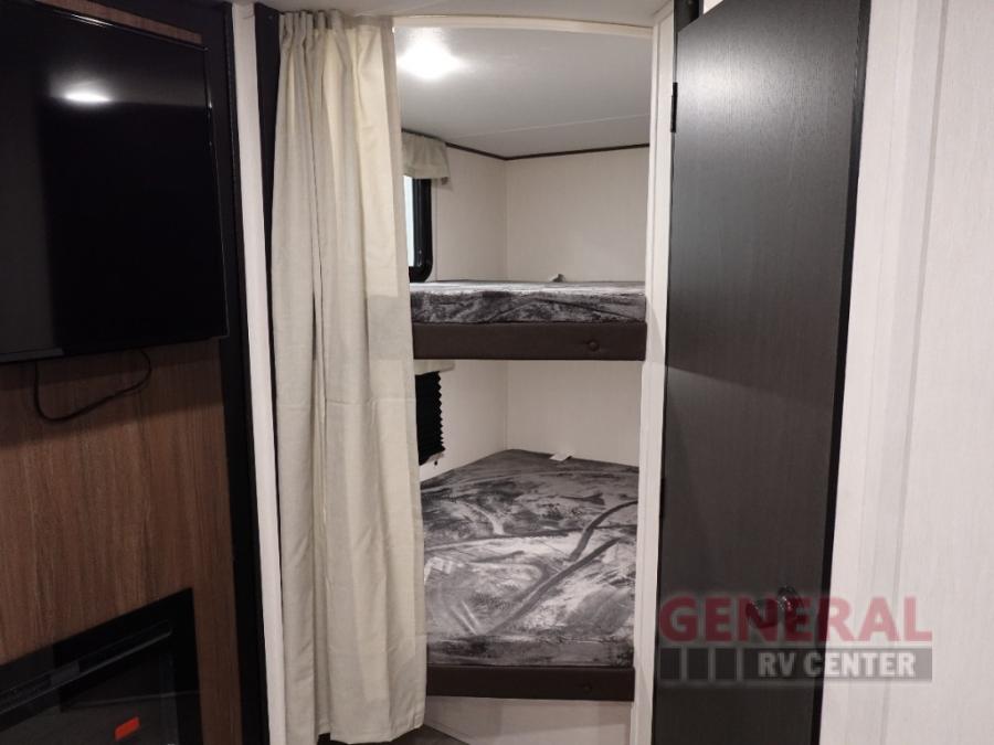 You'll appreciate the added space in this travel trailer thanks to the large slide out! The booth dinette and sofa are found here, and there is a moveable storage ottoman for extra blankets or board games. You'll have your own space up front in the private bedroom, complete with a camp king bed and storage for your things, while your guests take the double-size bunk beds towards the back. The chef of your group will find a three burner cooktop and a built-in convection microwave with an air fryer to cook meals, plus there is a 12V refrigerator and large hidden pantry for food storage. This unit also includes a power awning outdoors and an outside refrigerator to keep cold drinks close by.