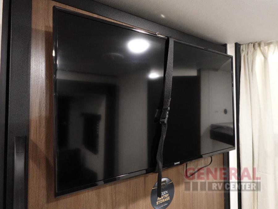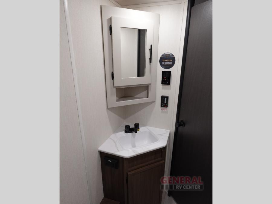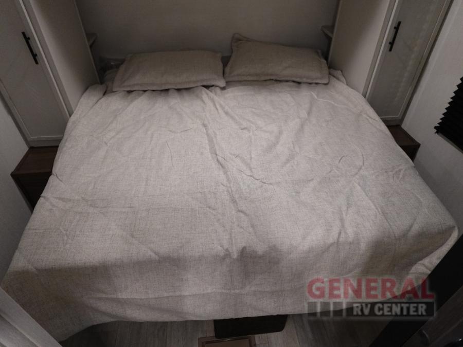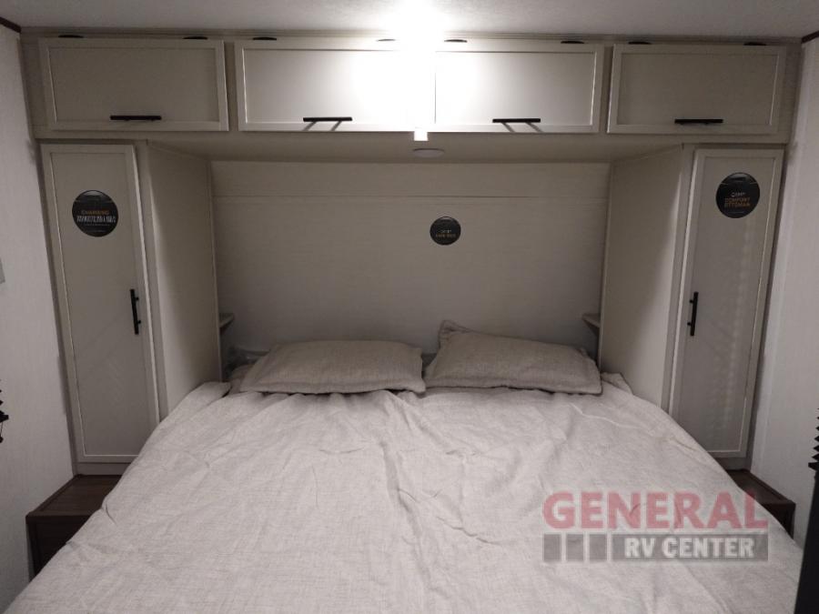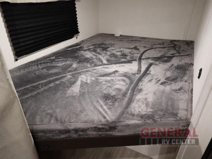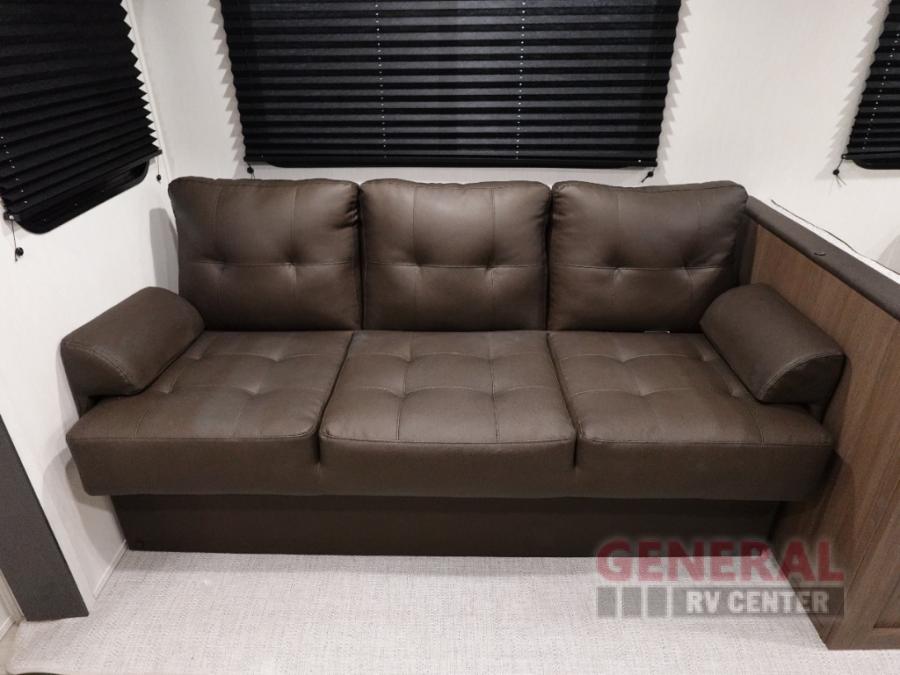 You'll appreciate the added space in this travel trailer thanks to the large slide out! The booth dinette and sofa are found here, and there is a moveable storage ottoman for extra blankets or board games. You'll have your own space up front in the private bedroom, complete with a camp king bed and storage for your things, while your guests take the double-size bunk beds towards the back. The chef of your group will find a three burner cooktop and a built-in convection microwave with an air fryer to cook meals, plus there is a 12V refrigerator and large hidden pantry for food storage. This unit also includes a power awning outdoors and an outside refrigerator to keep cold drinks close by.