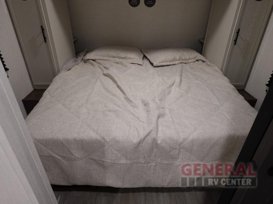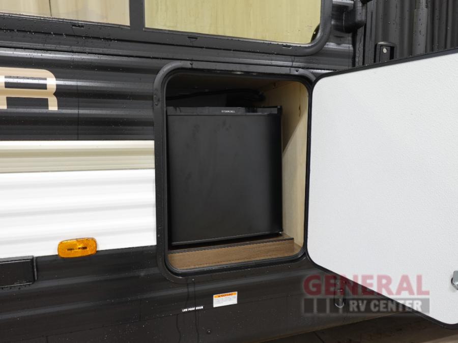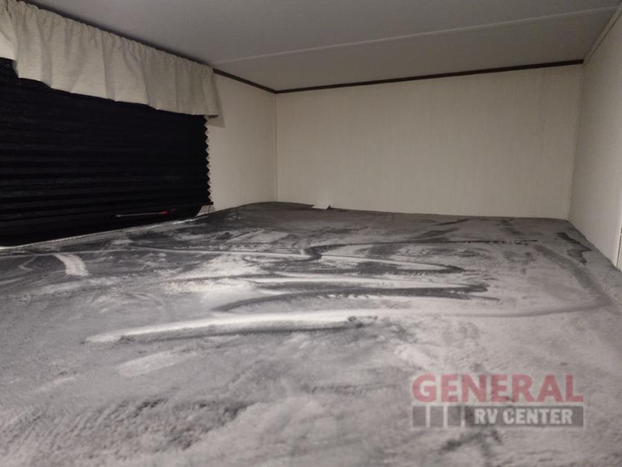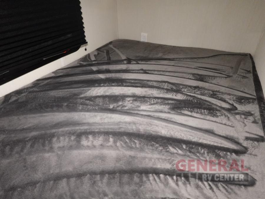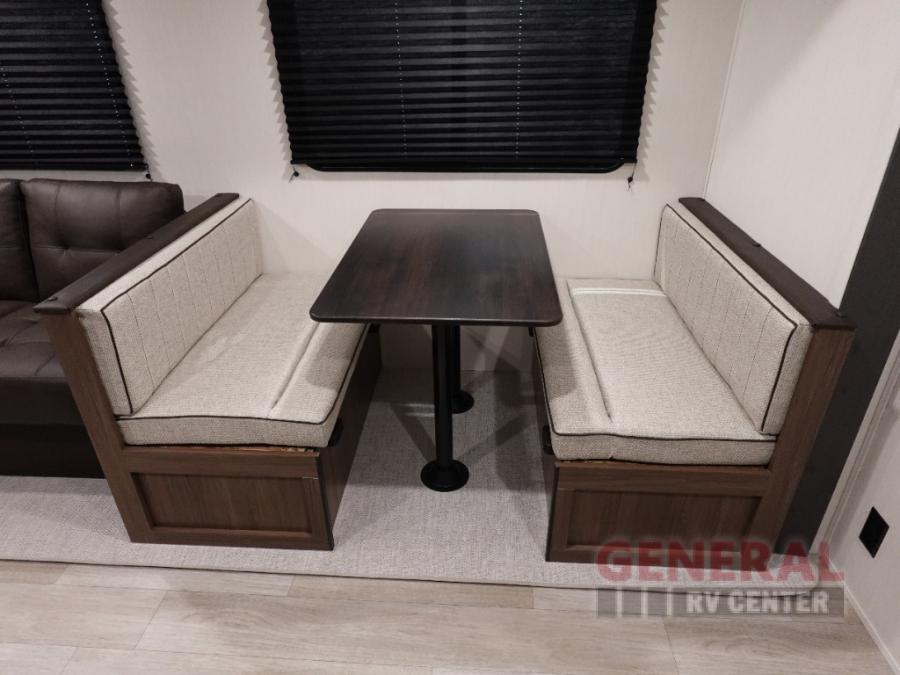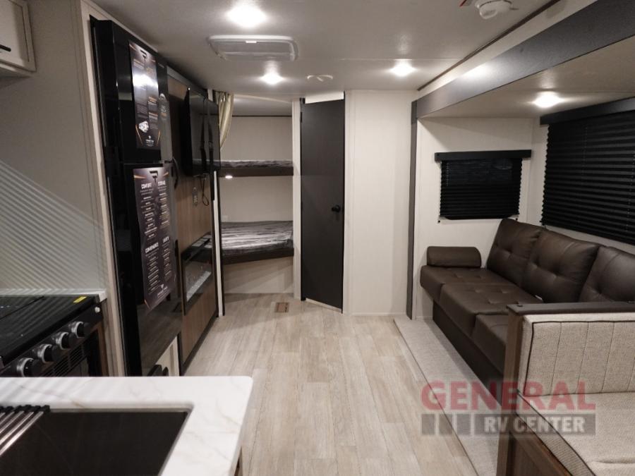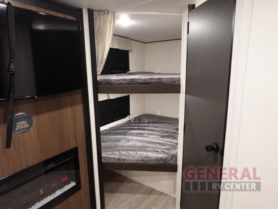 You'll appreciate the added space in this travel trailer thanks to the large slide out! The booth dinette and sofa are found here, and there is a moveable storage ottoman for extra blankets or board games. You'll have your own space up front in the private bedroom, complete with a camp king bed and storage for your things, while your guests take the double-size bunk beds towards the back. The chef of your group will find a three burner cooktop and a built-in convection microwave with an air fryer to cook meals, plus there is a 12V refrigerator and large hidden pantry for food storage. This unit also includes a power awning outdoors and an outside refrigerator to keep cold drinks close by.
