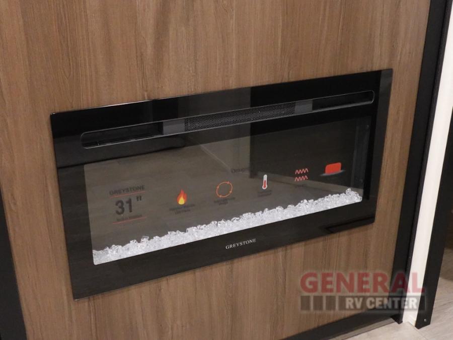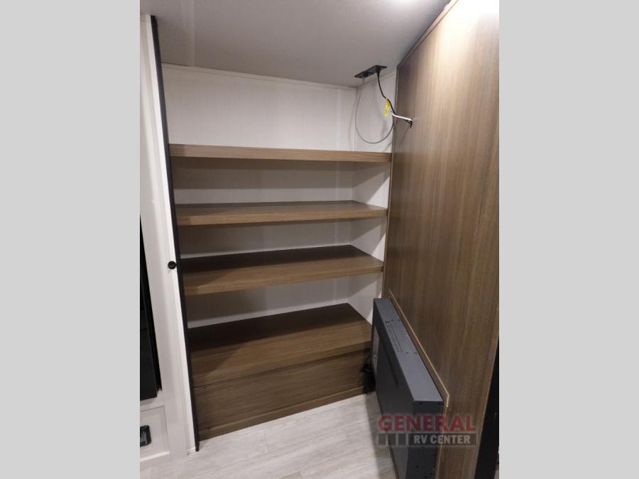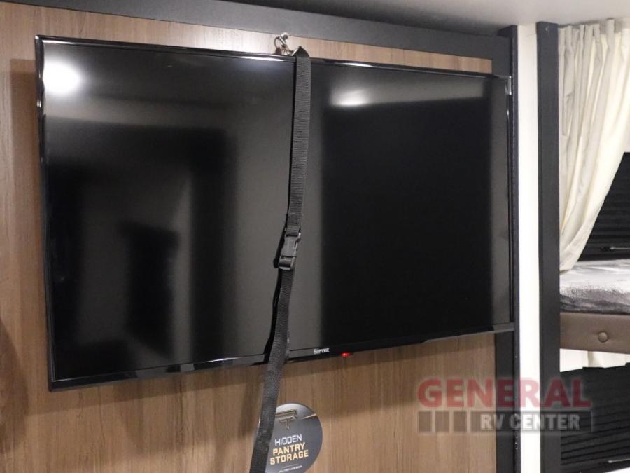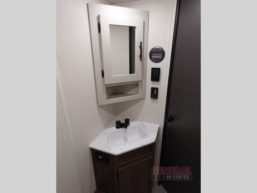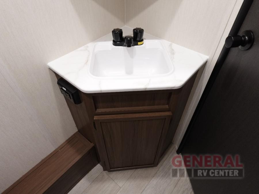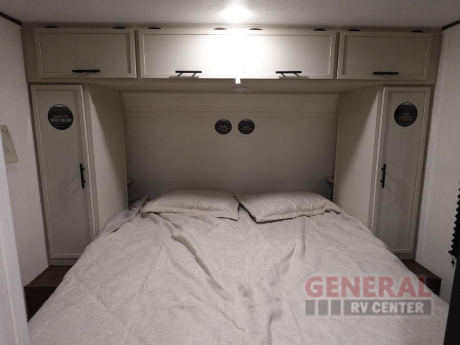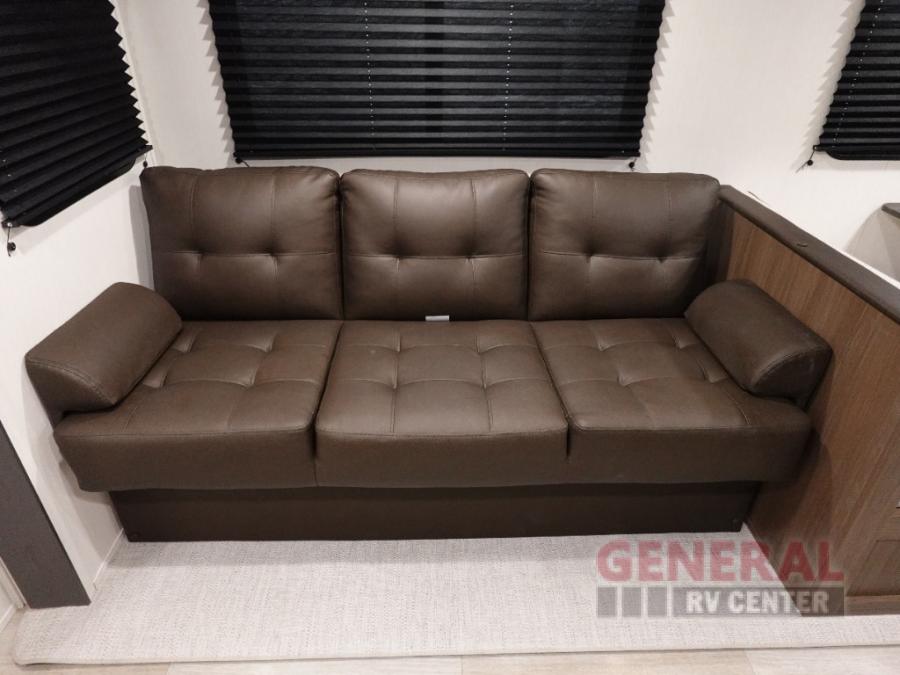 You'll appreciate the added space in this travel trailer thanks to the large slide out! The booth dinette and sofa are found here, and there is a moveable storage ottoman for extra blankets or board games. You'll have your own space up front in the private bedroom, complete with a camp king bed and storage for your things, while your guests take the double-size bunk beds towards the back. The chef of your group will find a three burner cooktop and a built-in convection microwave with an air fryer to cook meals, plus there is a 12V refrigerator and large hidden pantry for food storage. This unit also includes a power awning outdoors and an outside refrigerator to keep cold drinks close by.