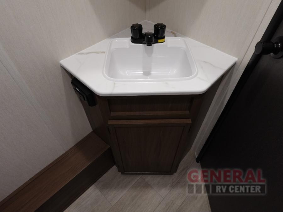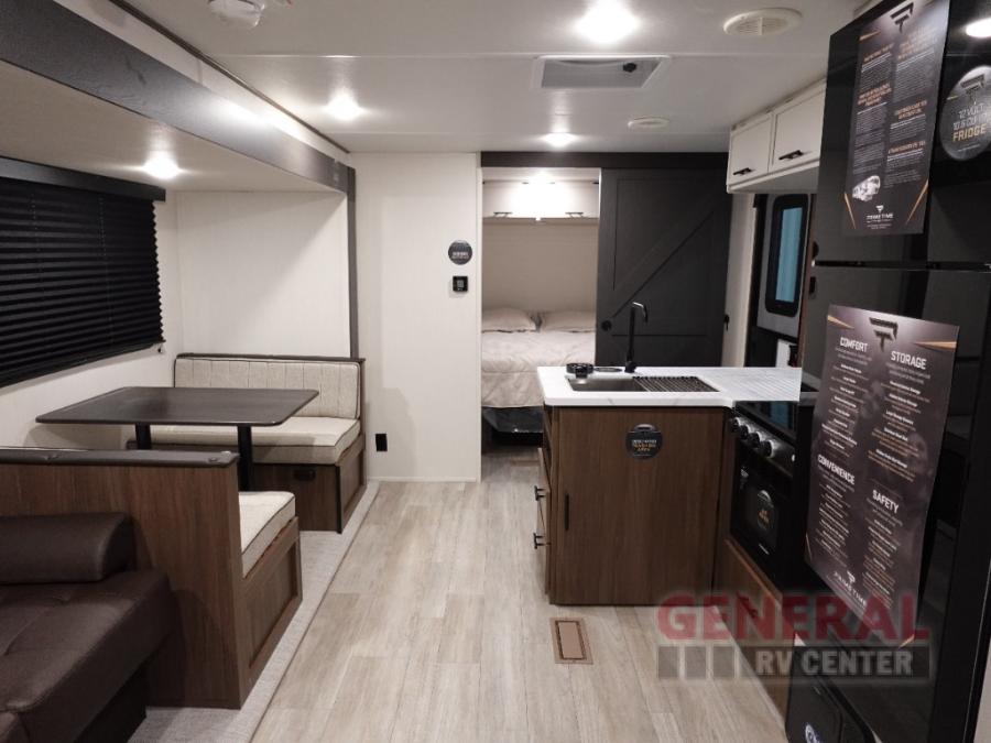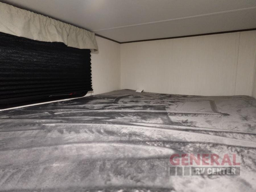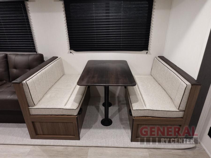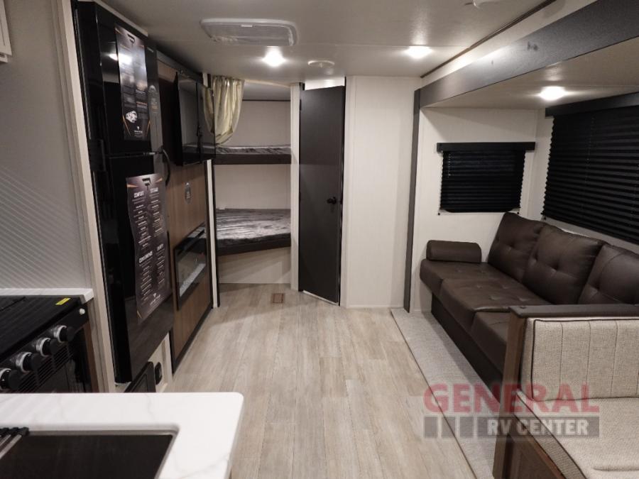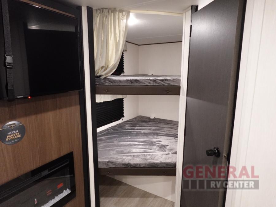 You'll appreciate the added space in this travel trailer thanks to the large slide out! The booth dinette and sofa are found here, and there is a moveable storage ottoman for extra blankets or board games. You'll have your own space up front in the private bedroom, complete with a camp king bed and storage for your things, while your guests take the double-size bunk beds towards the back. The chef of your group will find a three burner cooktop and a built-in convection microwave with an air fryer to cook meals, plus there is a 12V refrigerator and large hidden pantry for food storage. This unit also includes a power awning outdoors and an outside refrigerator to keep cold drinks close by.