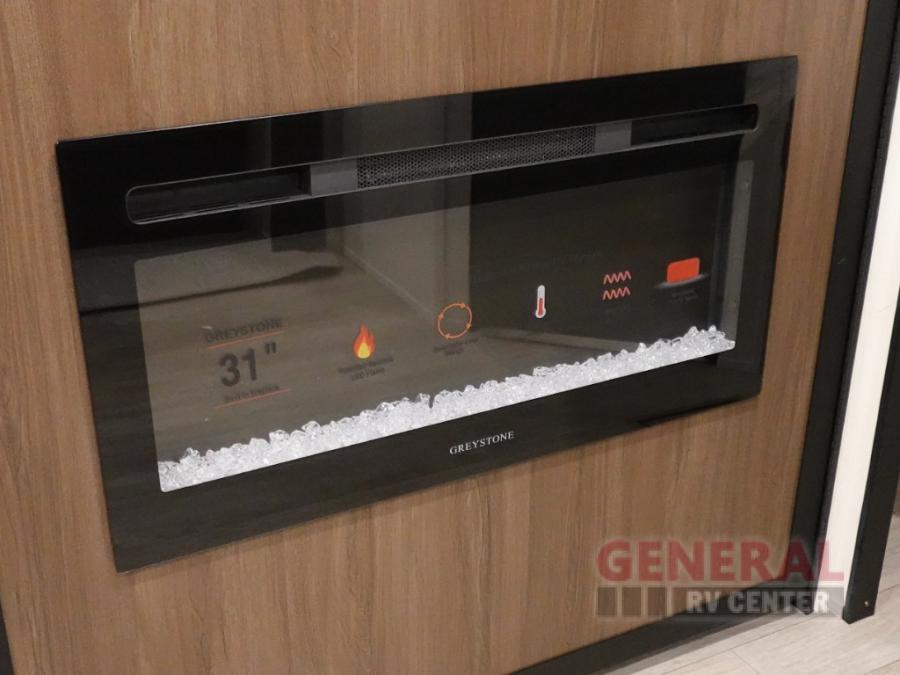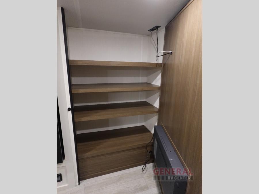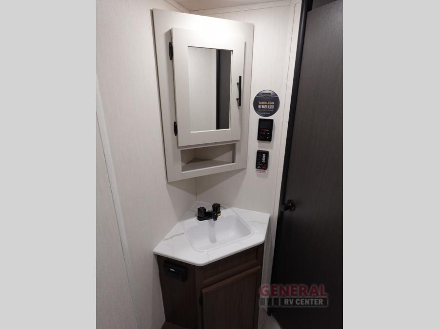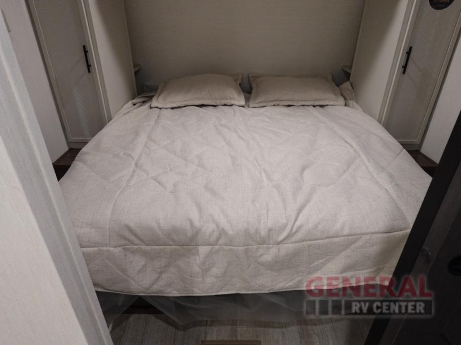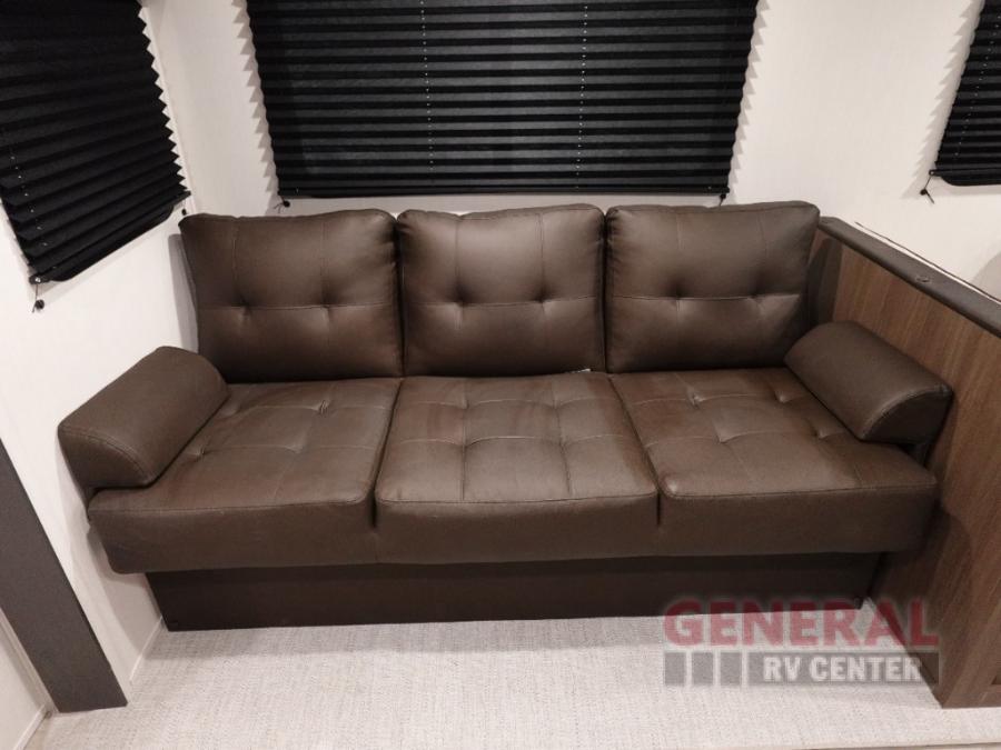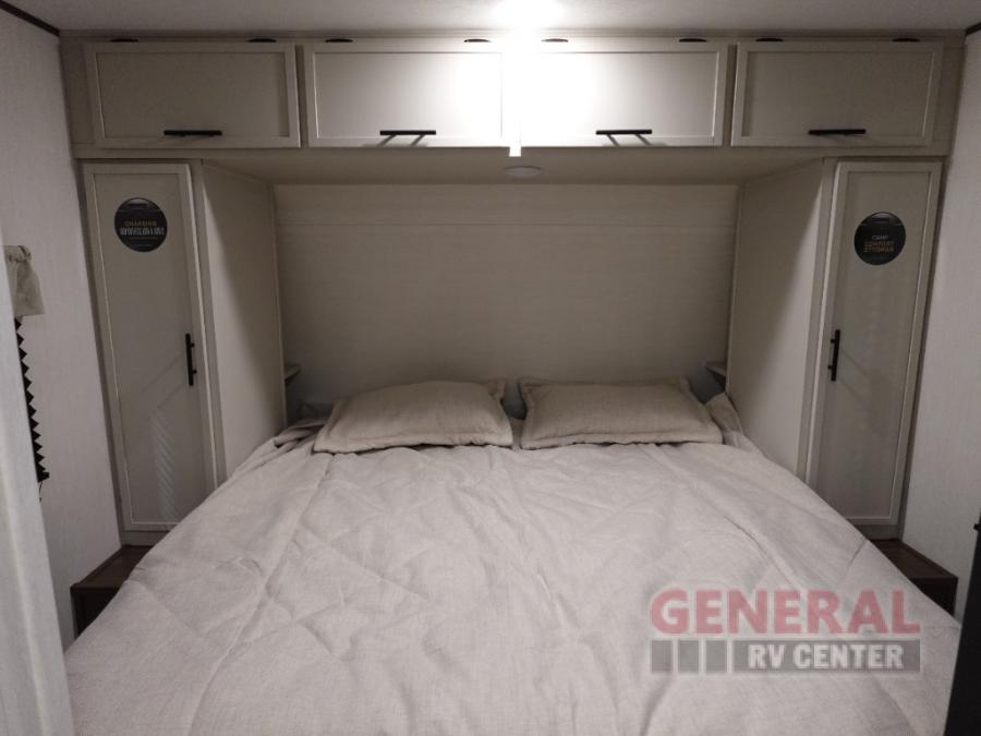 You'll appreciate the added space in this travel trailer thanks to the large slide out! The booth dinette and sofa are found here, and there is a moveable storage ottoman for extra blankets or board games. You'll have your own space up front in the private bedroom, complete with a camp king bed and storage for your things, while your guests take the double-size bunk beds towards the back. The chef of your group will find a three burner cooktop and a built-in convection microwave with an air fryer to cook meals, plus there is a 12V refrigerator and large hidden pantry for food storage. This unit also includes a power awning outdoors and an outside refrigerator to keep cold drinks close by.
