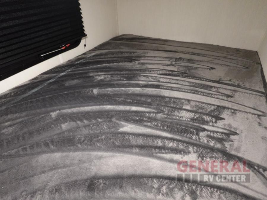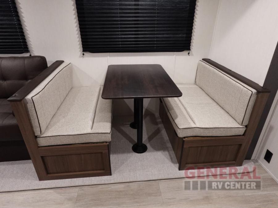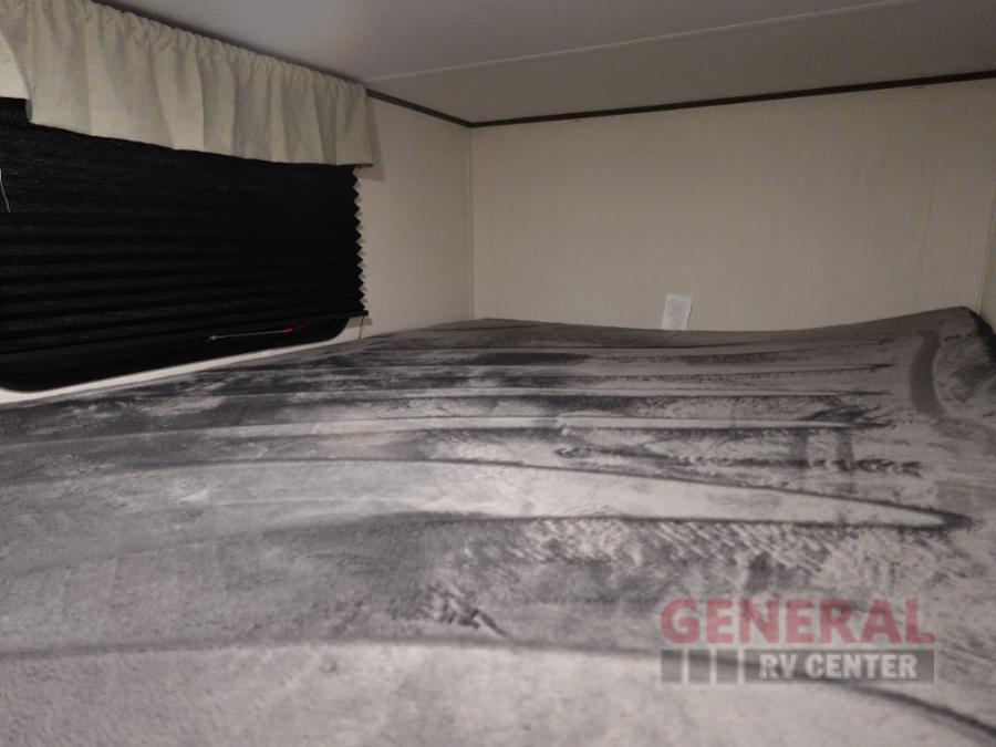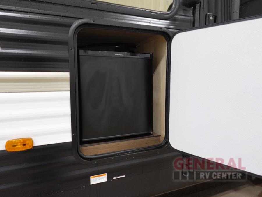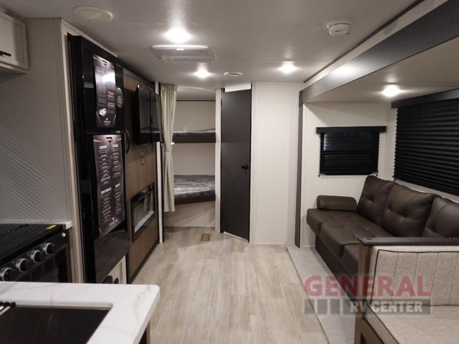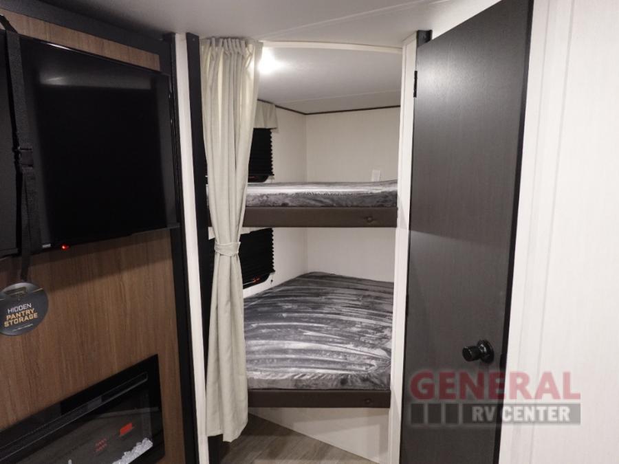 You'll appreciate the added space in this travel trailer thanks to the large slide out! The booth dinette and sofa are found here, and there is a moveable storage ottoman for extra blankets or board games. You'll have your own space up front in the private bedroom, complete with a camp king bed and storage for your things, while your guests take the double-size bunk beds towards the back. The chef of your group will find a three burner cooktop and a built-in convection microwave with an air fryer to cook meals, plus there is a 12V refrigerator and large hidden pantry for food storage. This unit also includes a power awning outdoors and an outside refrigerator to keep cold drinks close by.