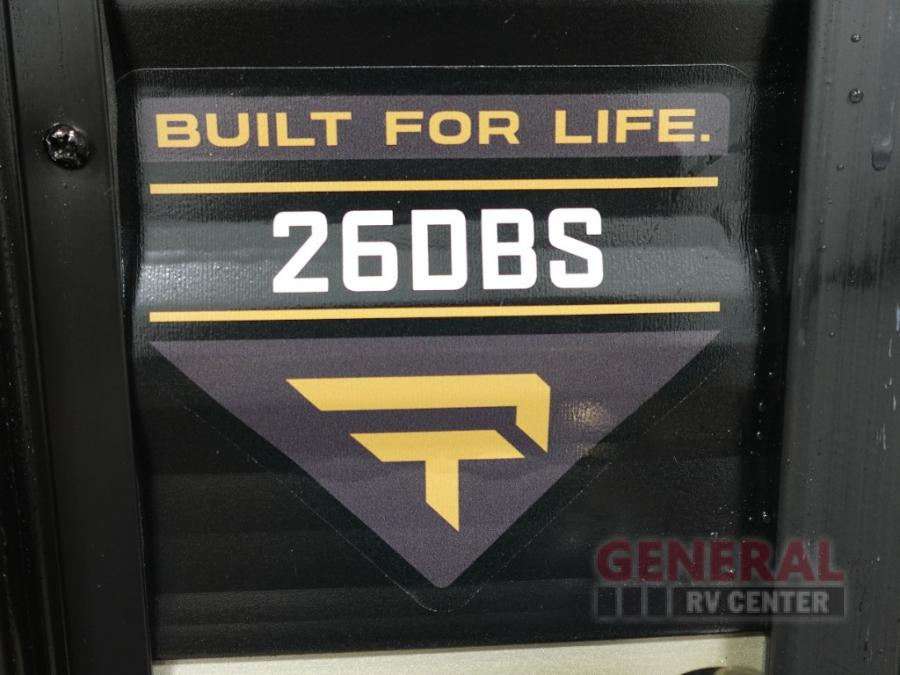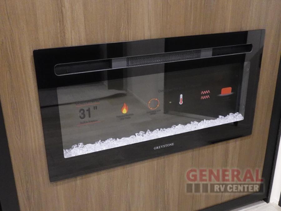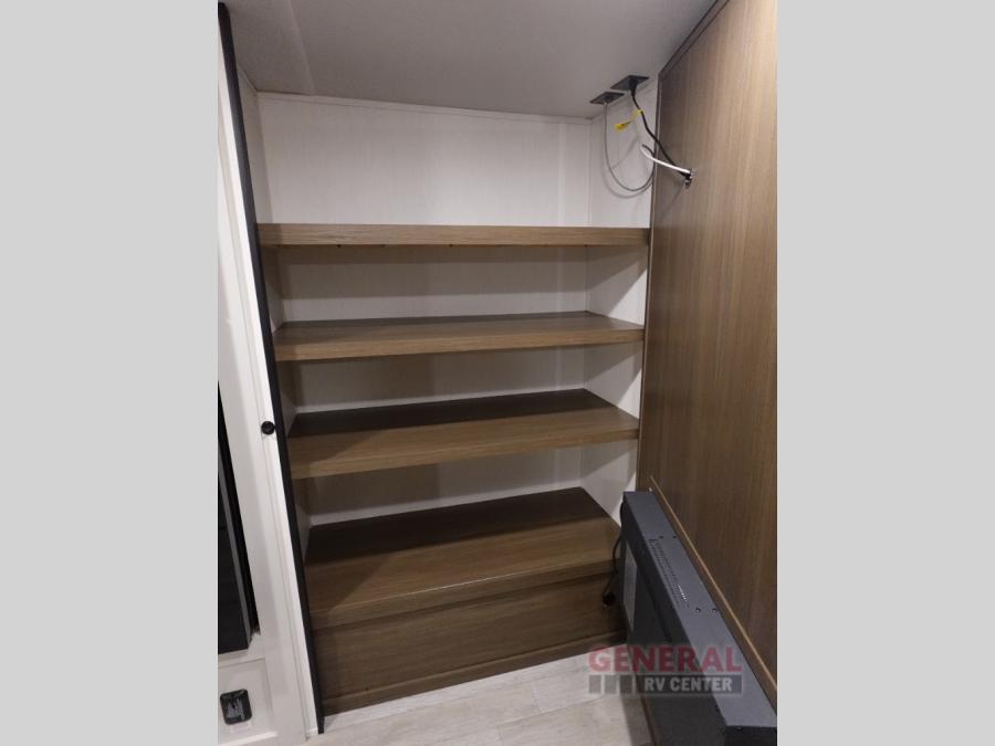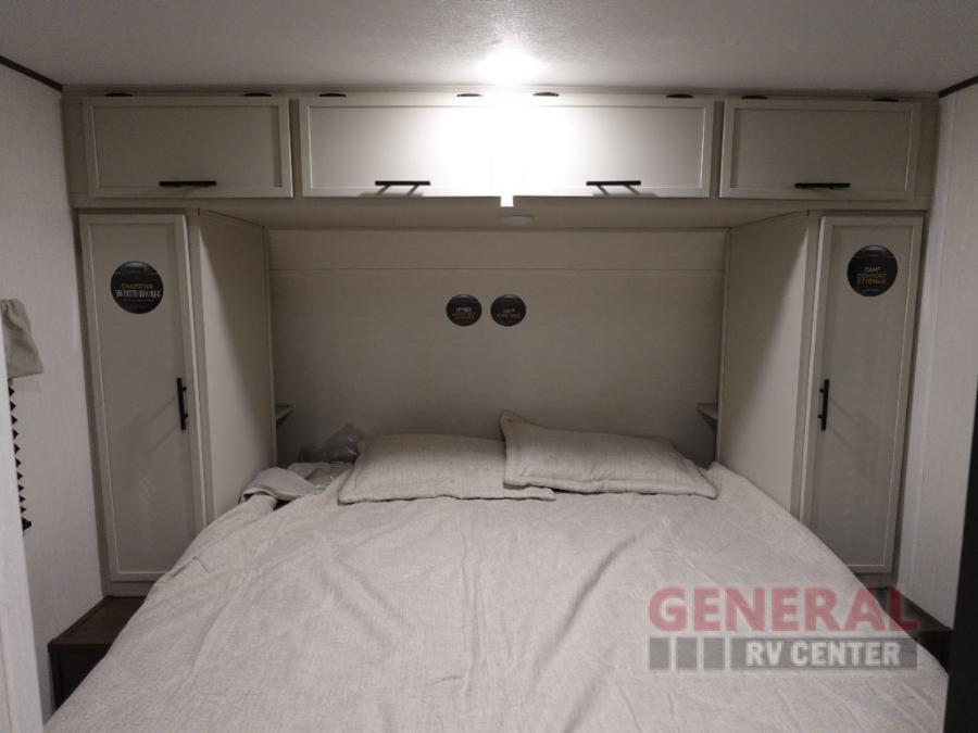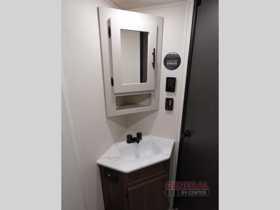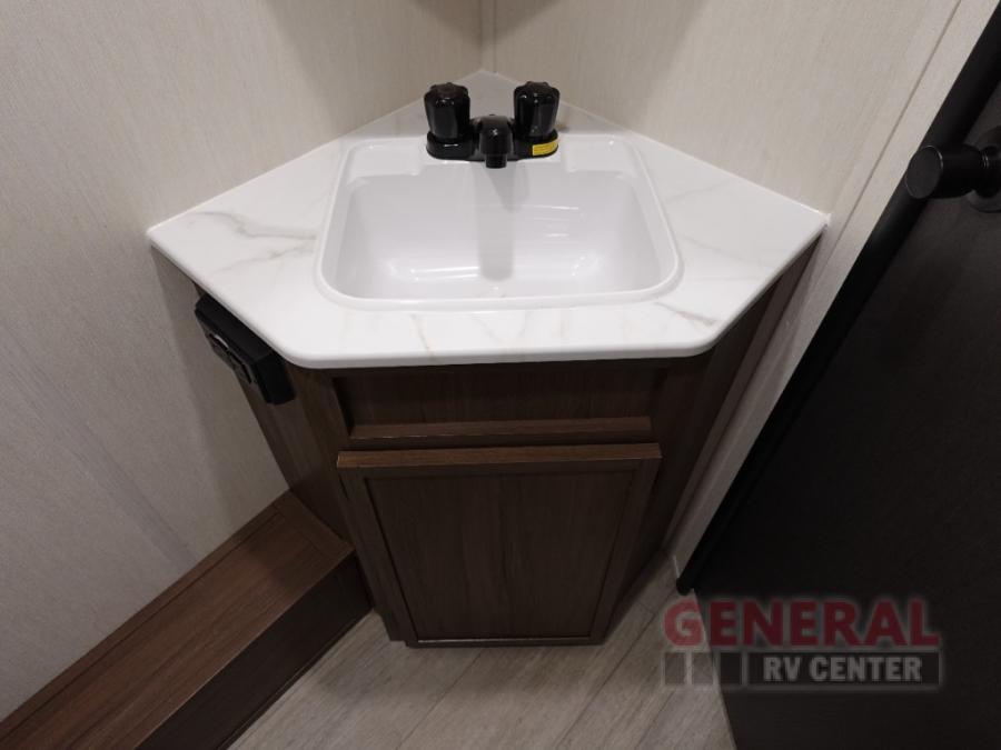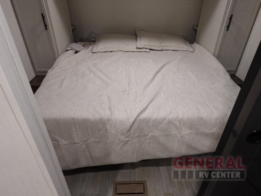 You'll appreciate the added space in this travel trailer thanks to the large slide out! The booth dinette and sofa are found here, and there is a moveable storage ottoman for extra blankets or board games. You'll have your own space up front in the private bedroom, complete with a camp king bed and storage for your things, while your guests take the double-size bunk beds towards the back. The chef of your group will find a three burner cooktop and a built-in convection microwave with an air fryer to cook meals, plus there is a 12V refrigerator and large hidden pantry for food storage. This unit also includes a power awning outdoors and an outside refrigerator to keep cold drinks close by.
