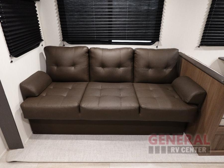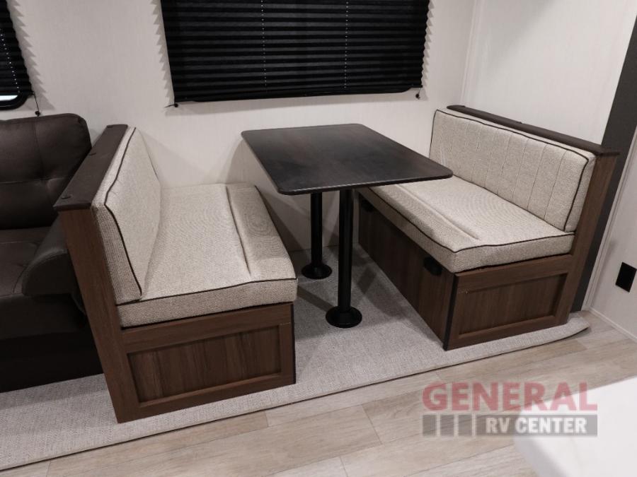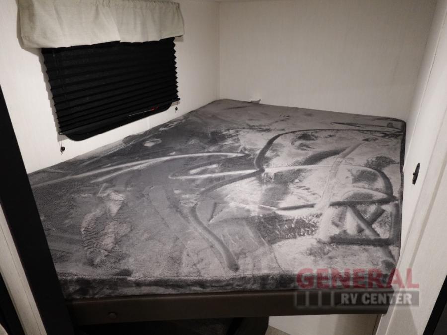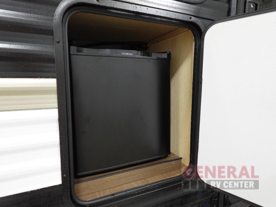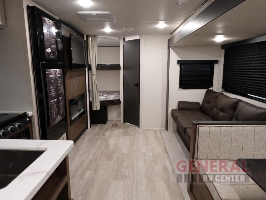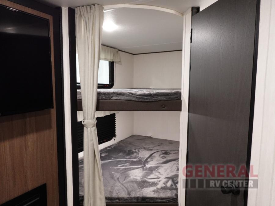 You'll appreciate the added space in this travel trailer thanks to the large slide out! The booth dinette and sofa are found here, and there is a moveable storage ottoman for extra blankets or board games. You'll have your own space up front in the private bedroom, complete with a camp king bed and storage for your things, while your guests take the double-size bunk beds towards the back. The chef of your group will find a three burner cooktop and a built-in convection microwave with an air fryer to cook meals, plus there is a 12V refrigerator and large hidden pantry for food storage. This unit also includes a power awning outdoors and an outside refrigerator to keep cold drinks close by.